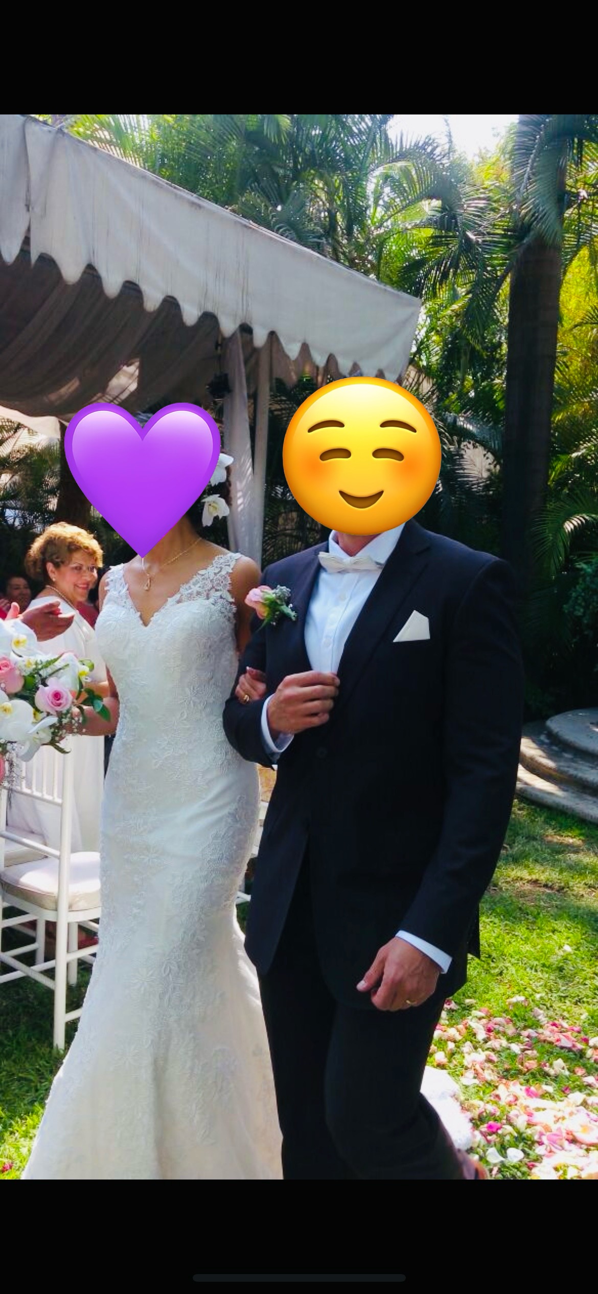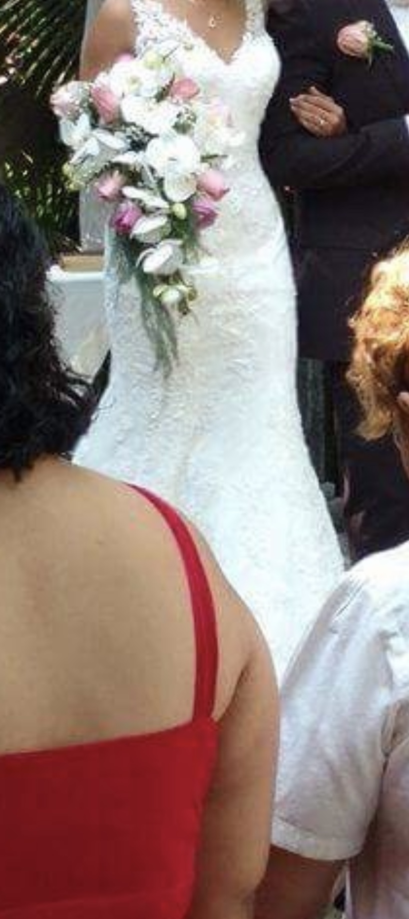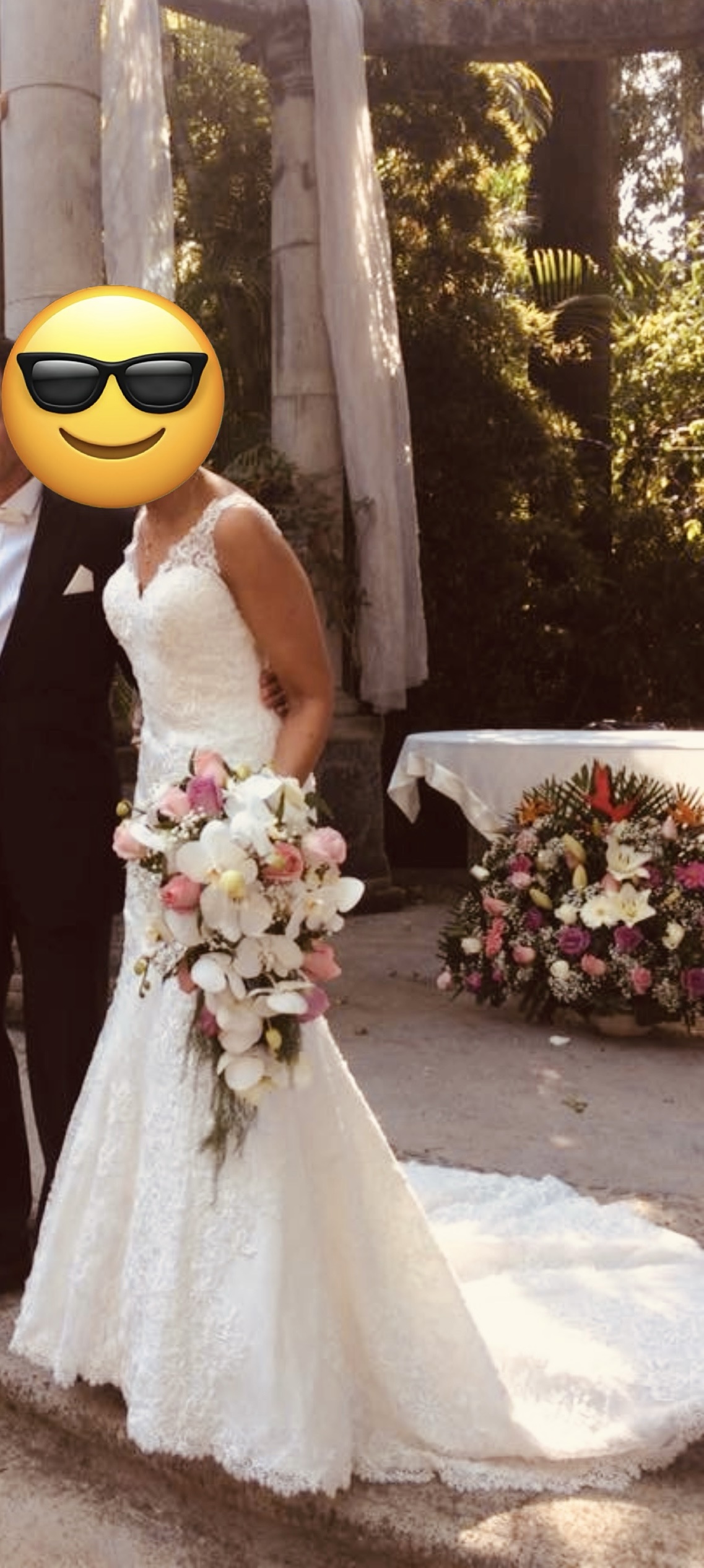 Es un vestido hermoso, con silueta sirena y encaje , una cola con un metro extra. Espalda descubierta en V . Pero ligero . Te hará sentir radiante y hermosa.