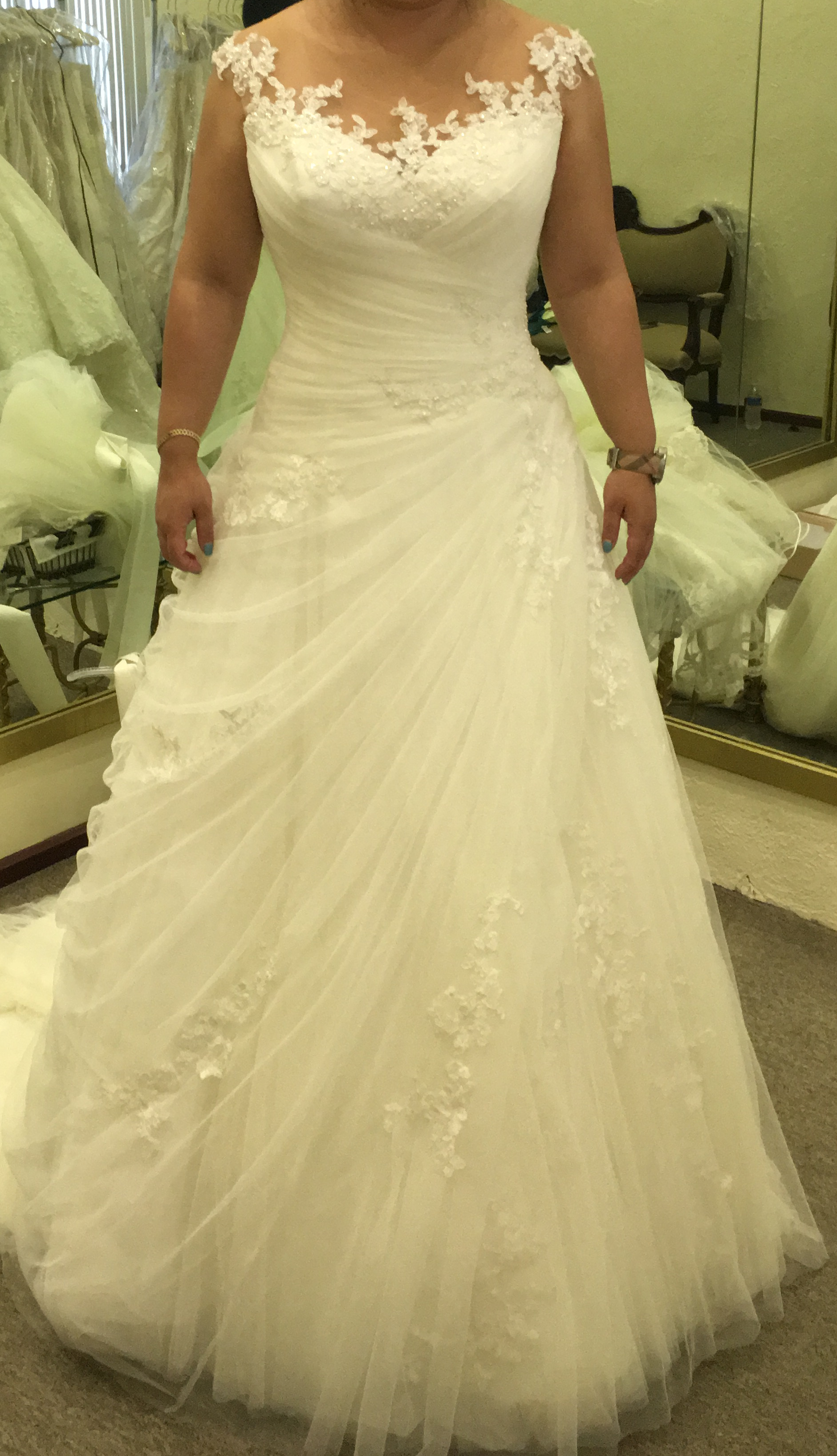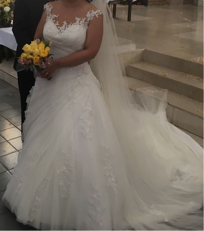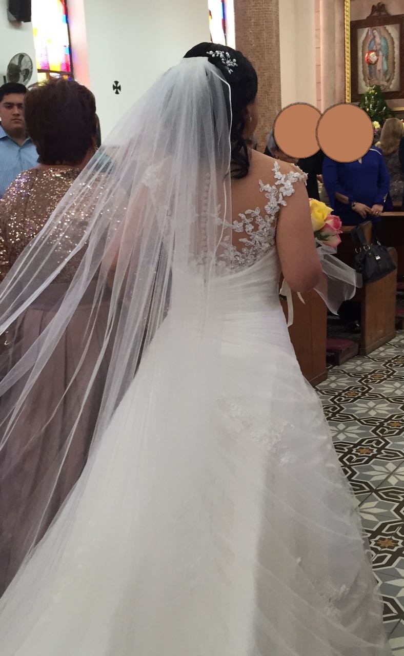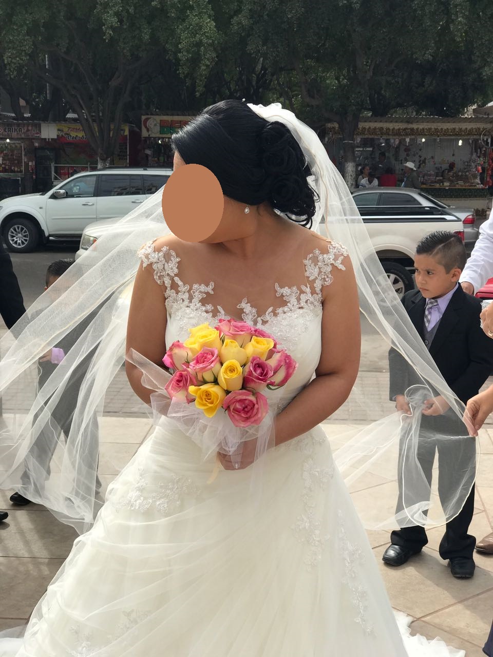 Vestido de Novia en perfectas condiciones, acabo de usarlo en diciembre 2016 e inmediatamente se llevó a la tintorería. Estatura de 1.50 a 1.60. Incluye velo y faldilla. Tengo factura original de compra.Es un vestido super cómodo que te ayudará a moldear tu cintura, bellísimo escote de encaje tanto por enfrente y por atrás.