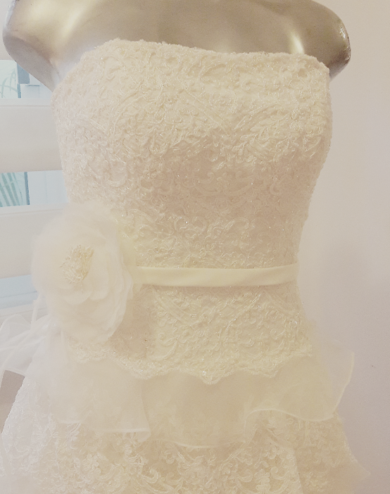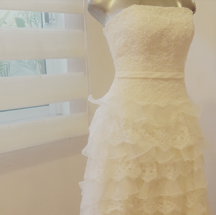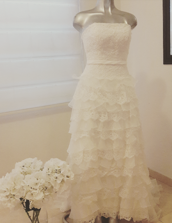Muy muy bello vestido para una chica pettit. El encaje es de lo más elegante y los olanes le dan un toque genial.