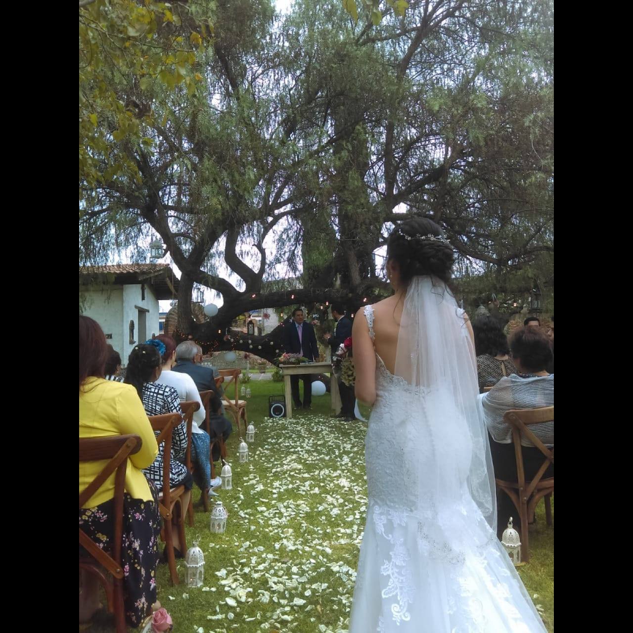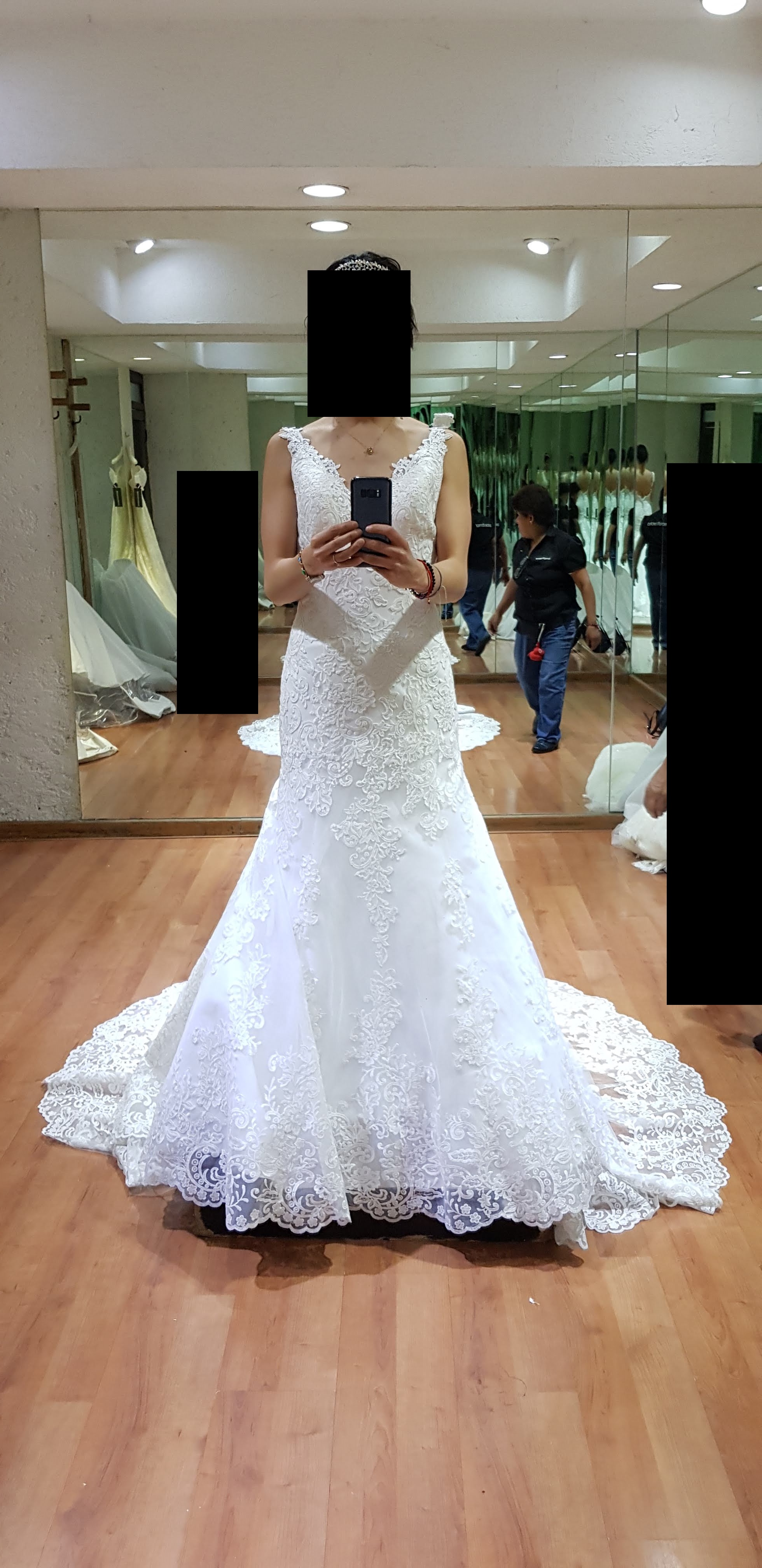 Vestido marca Briden Formal con encaje. Si quieres lucir una cauda espectacular, este vestido es para ti; todo el vestido (incluyendo la cauda) trae encaje lo que lo hace ver sutilmente elegante. Además, la parte trasera cuenta con la espalda descubierta y entallado lo cual le da muchísima vista, con un ligero toque de sensualidad que puede verse disfrazado con el velo pero no oculto.