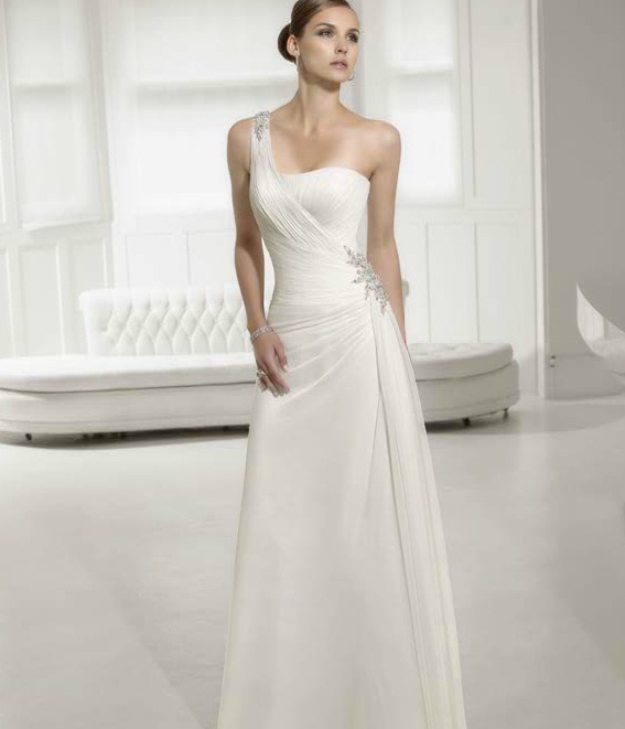 La forma asimétrica hace que los hombros y cuello luzcan sin necesidad de llevar aretes o gargantilla llamativa, quizá solo deba combinarse con una tiara del mismo estilo.