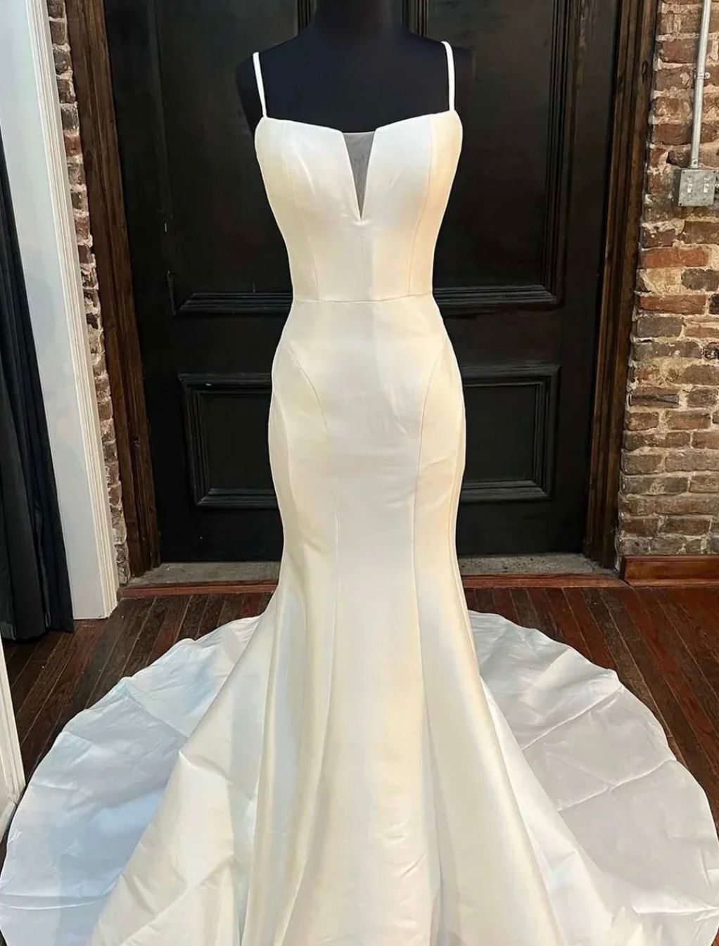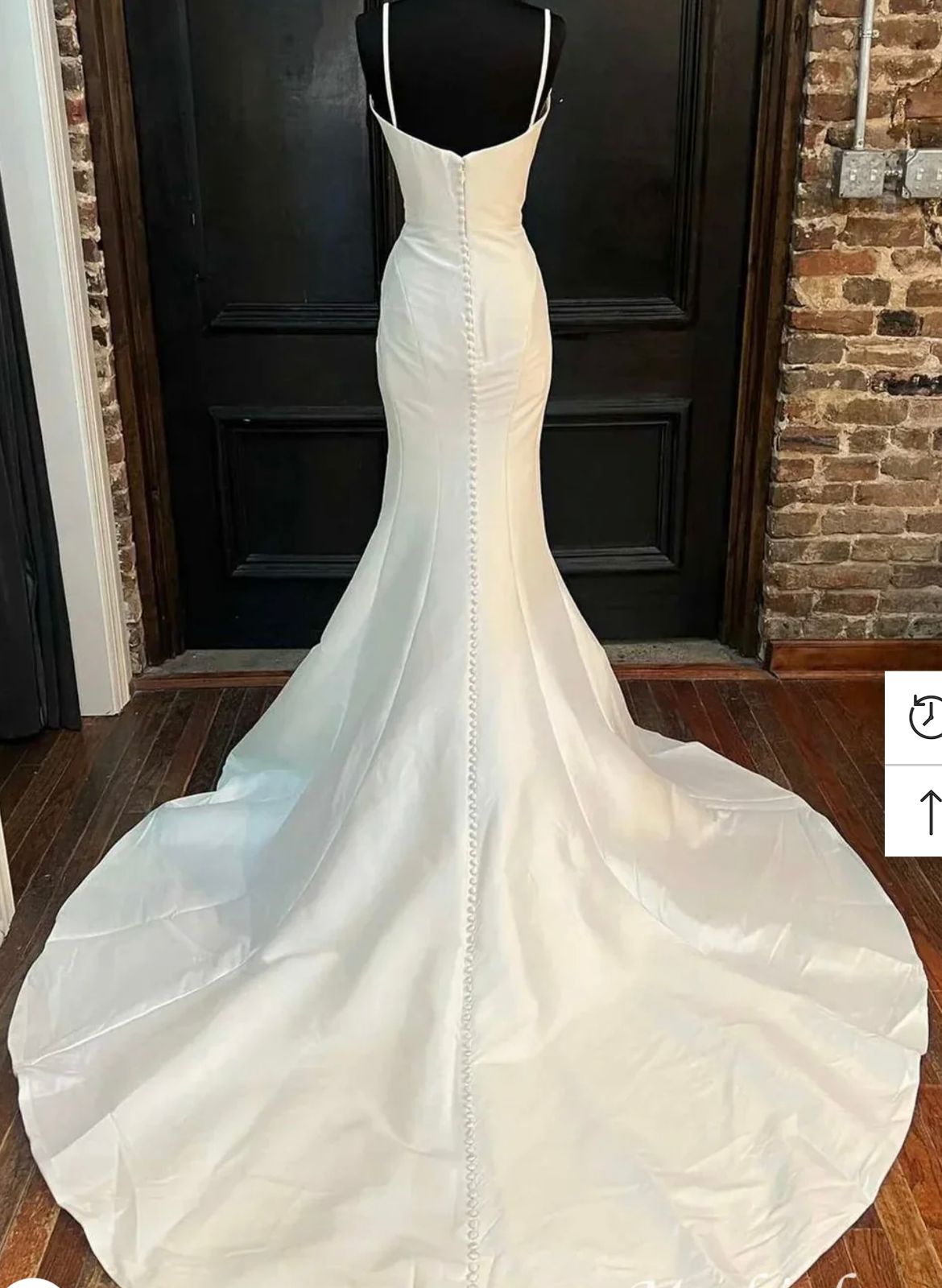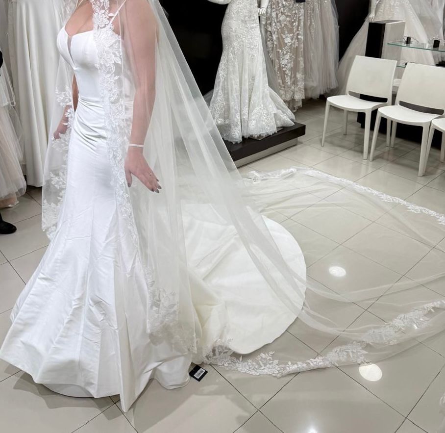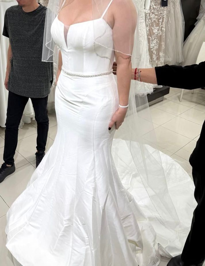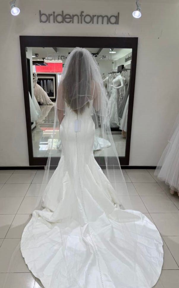 Hermoso vestido estilo sirena, tal cual se ve en las imágenes, se le agregó un cinturón delgado de piedras, completamente nuevo, se entrega con velo de 3mts (imagen 5) también completamente nuevo. Es talla 8-10 (mediana) sin ningún detalle.