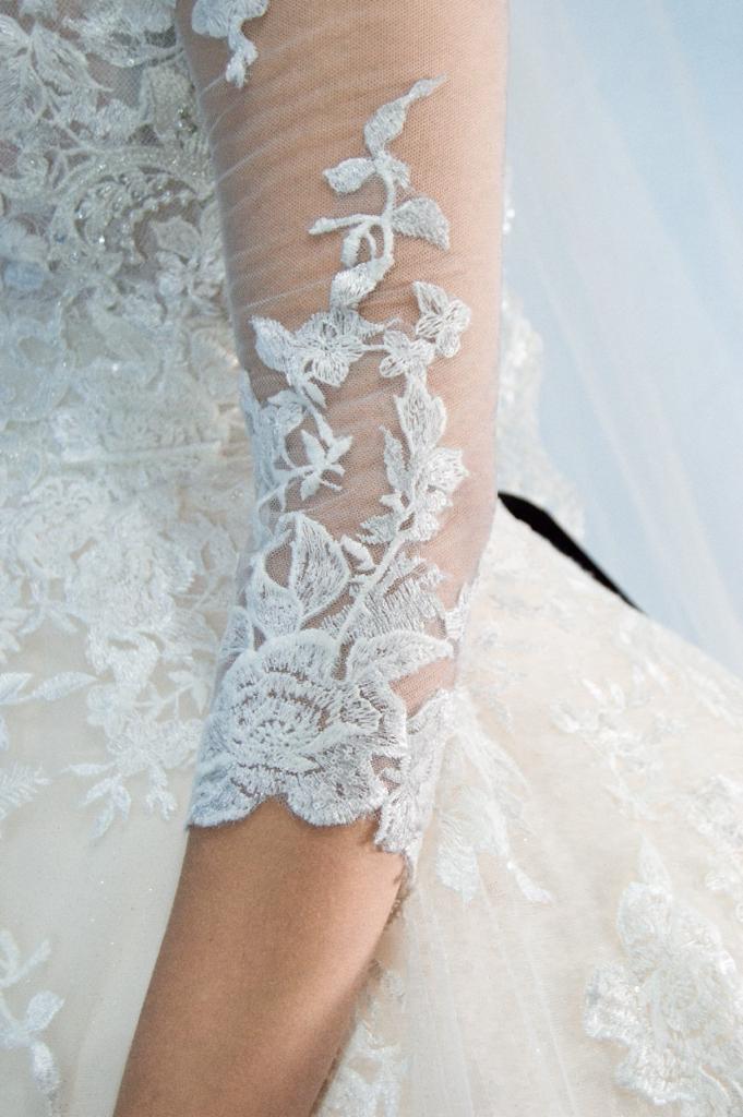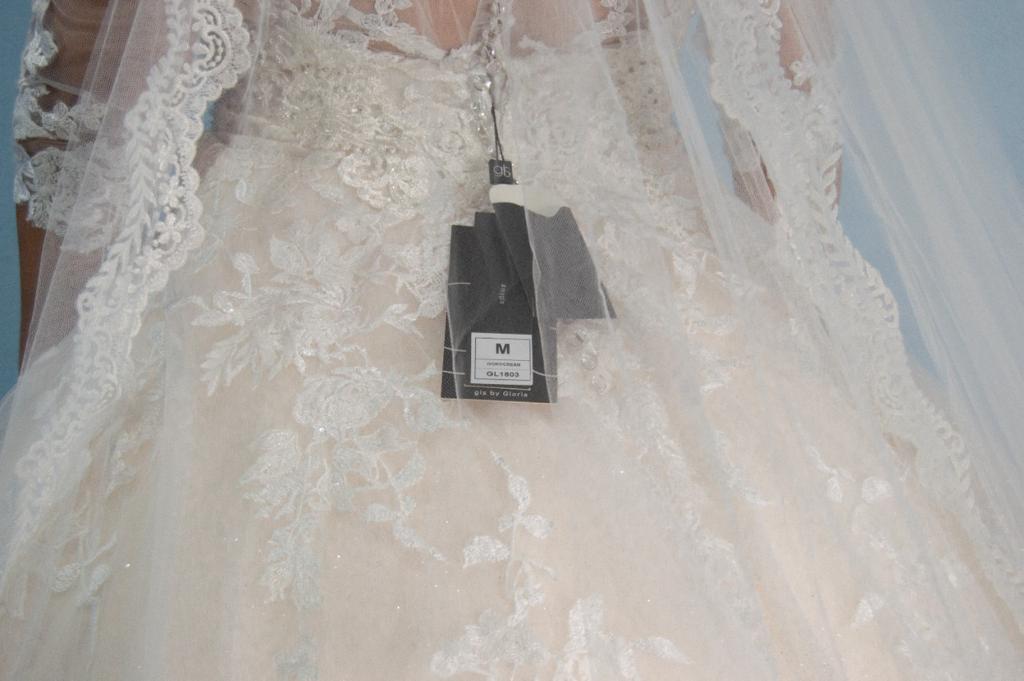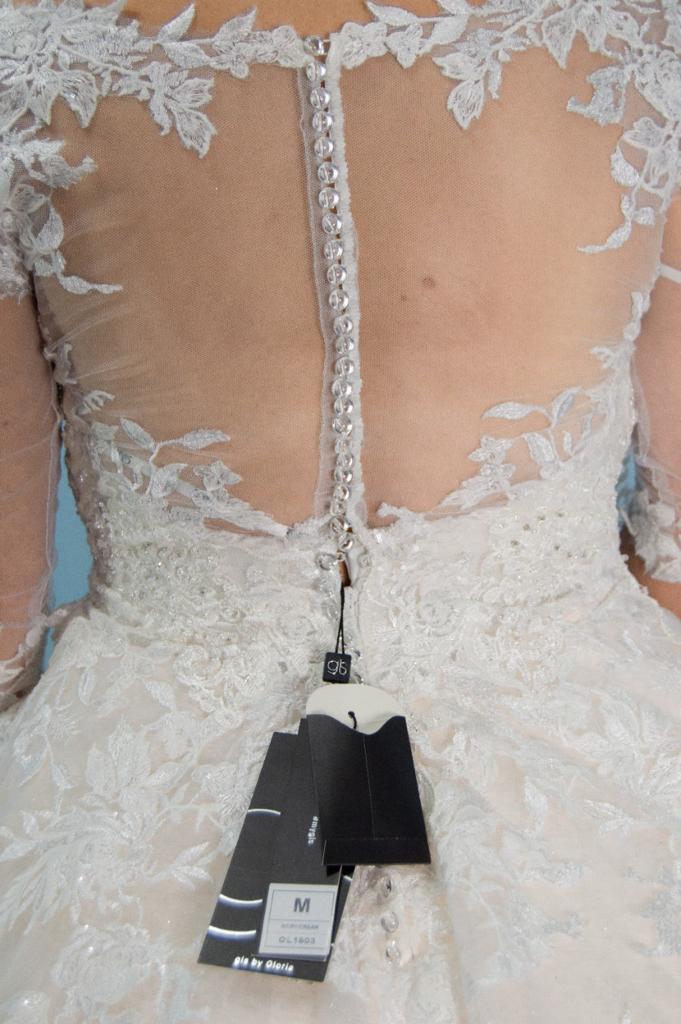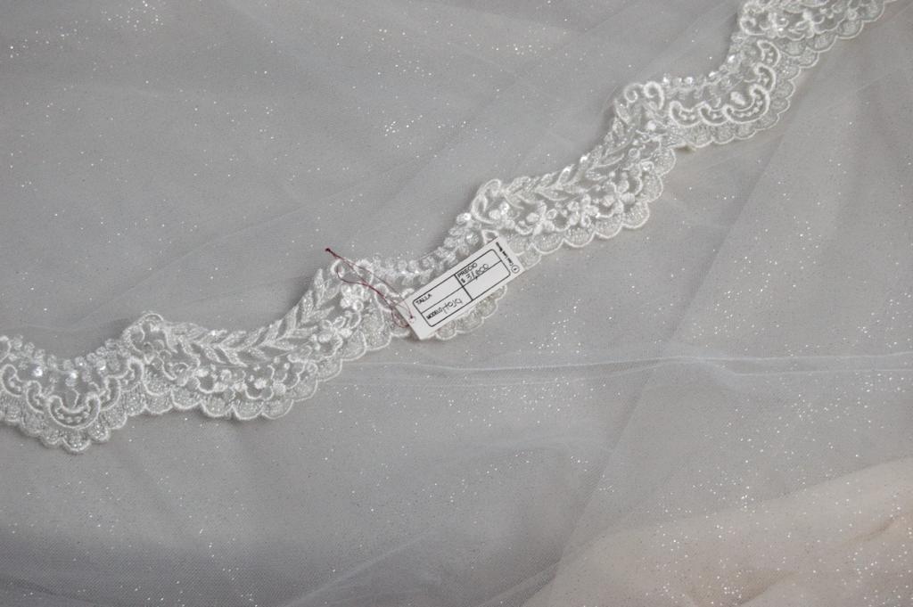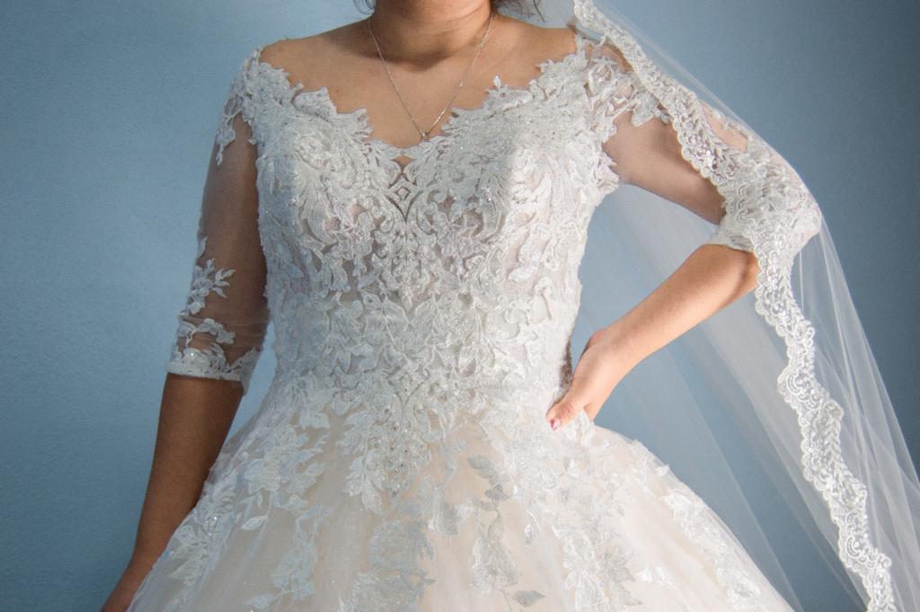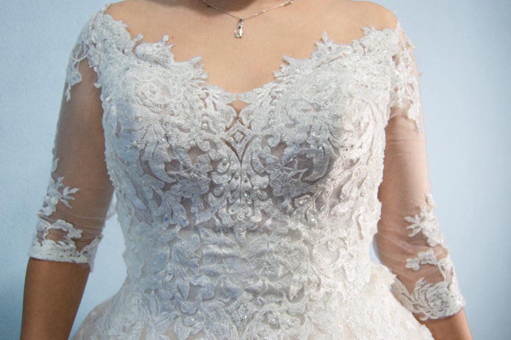 Talla M, moldeable al cuerpo, con detalles de encaje en toda la parte del escote, así como en las mangas. Incluye Velo completamente nuevo también, crinolinas nuevas, guardado en su guardapolvos. (Solo se sacó para la toma de las fotografias)
