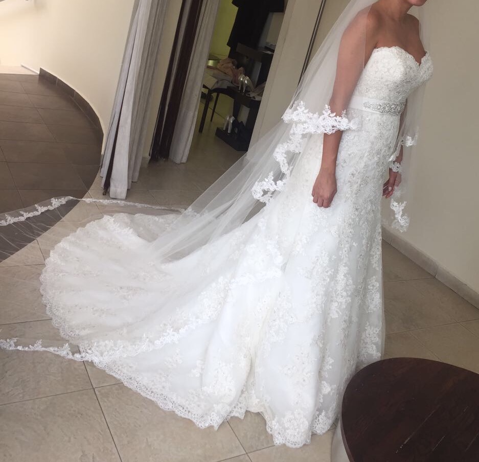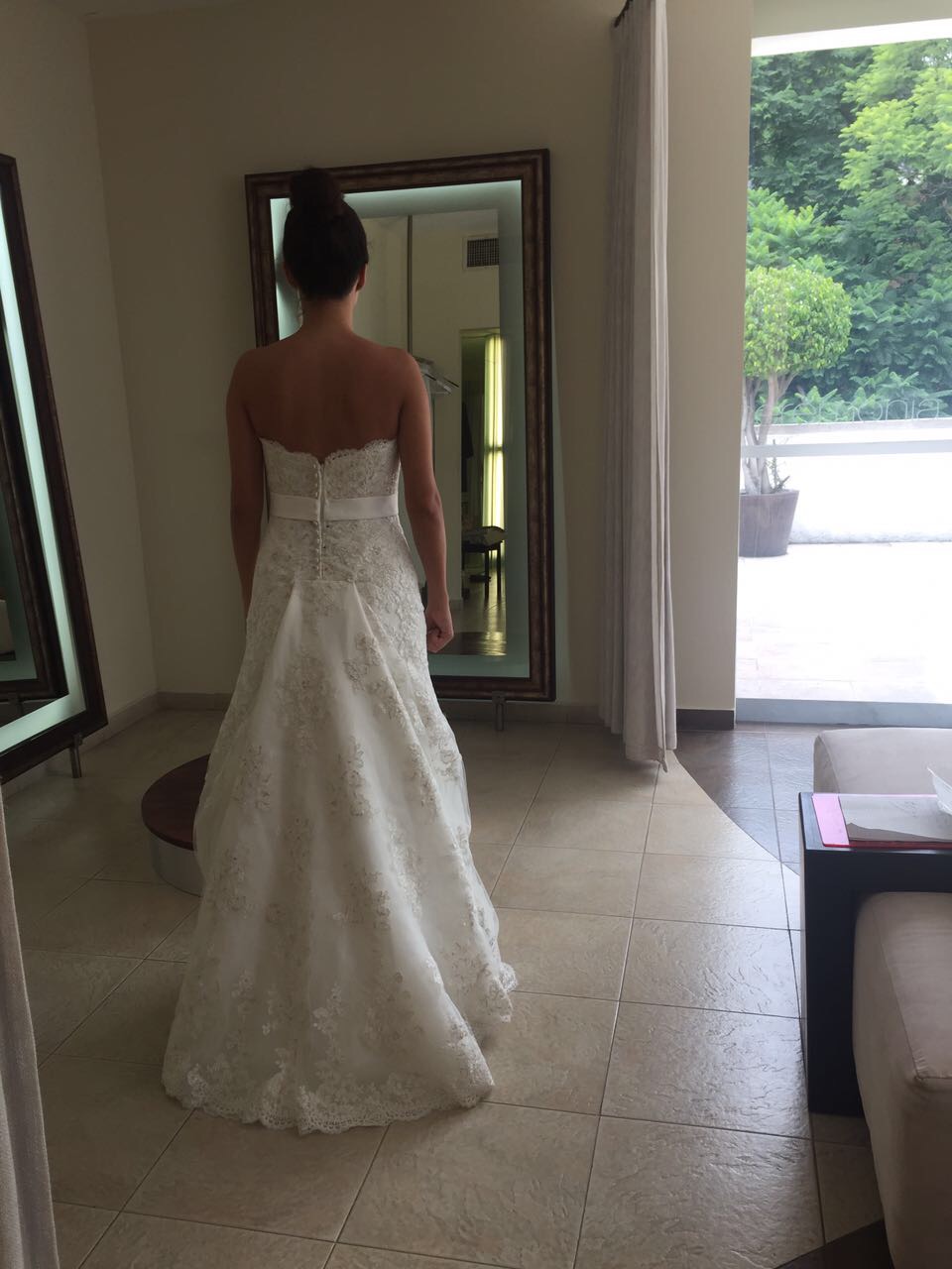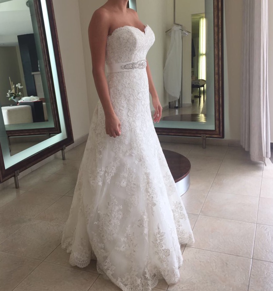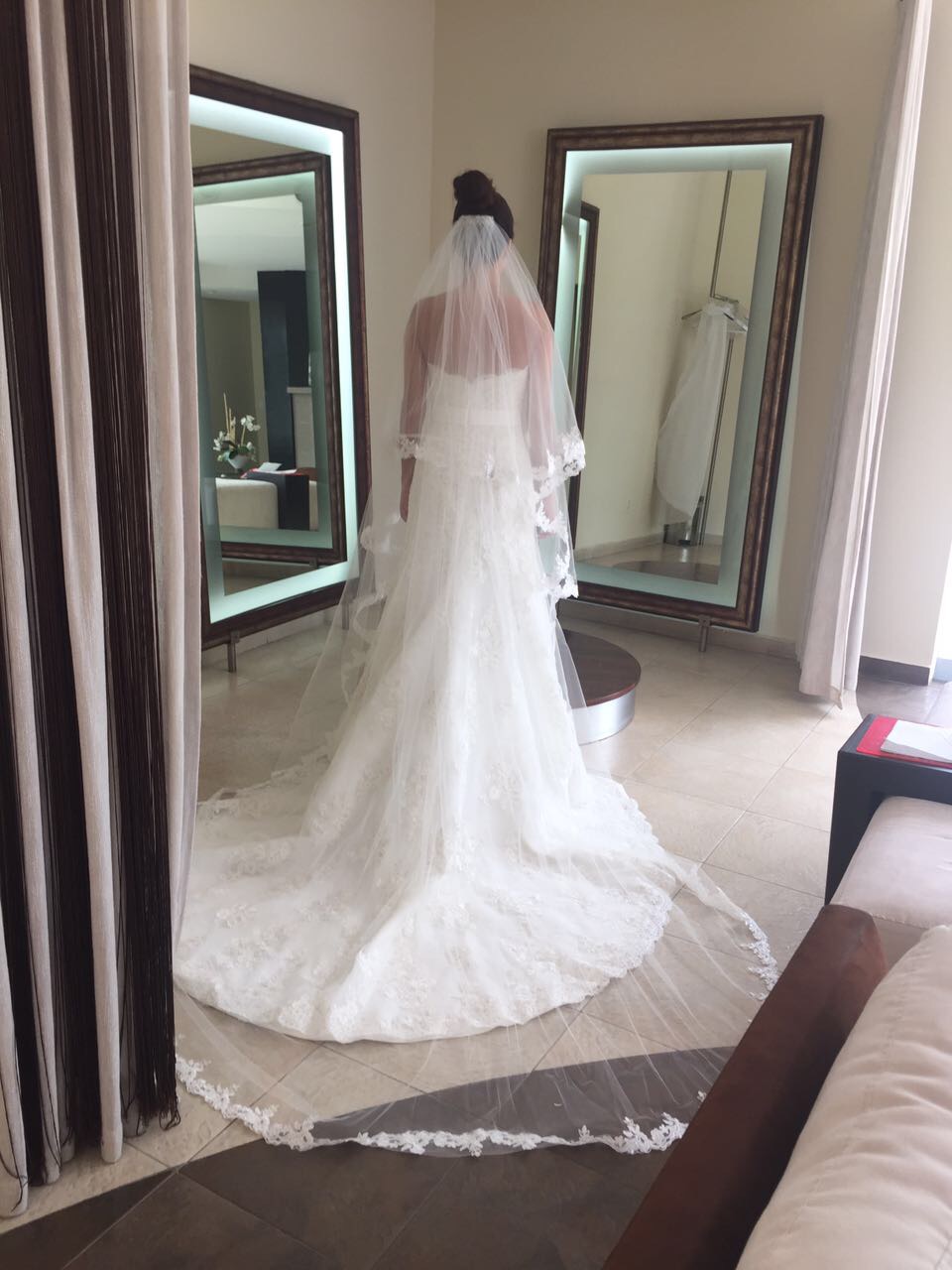 Usado solo una vez,Ya se envío a tintorería ,Incluyó con el vestido velo largo tbm de ceremonia y zapatos como nuevos , es hermoso y único el vestido , con piedreria fina importada , puedo mostrar factura original
