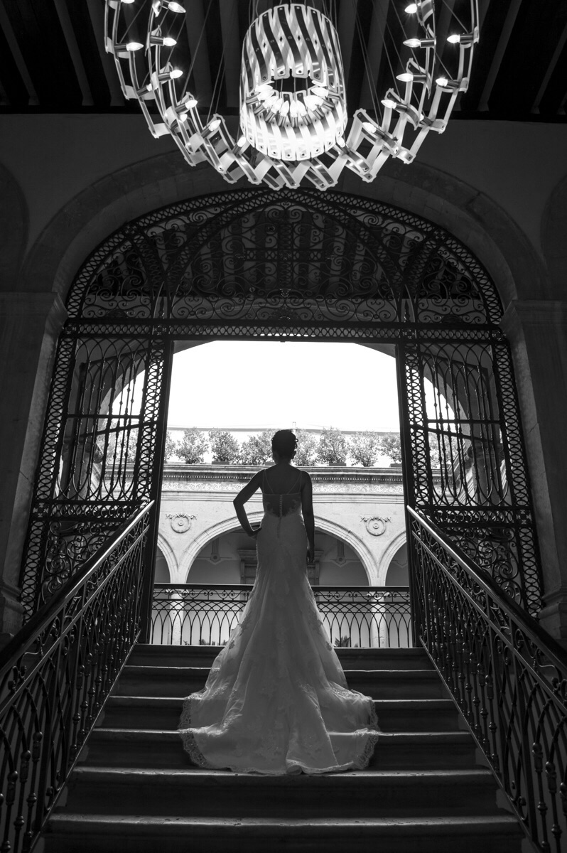 Confeccionado en fina organza con aplicaciones de encaje rebordado con pedreria de perlas y cristales,el terminando del frente del vestido y la cauda con un fino encaje rebordado.