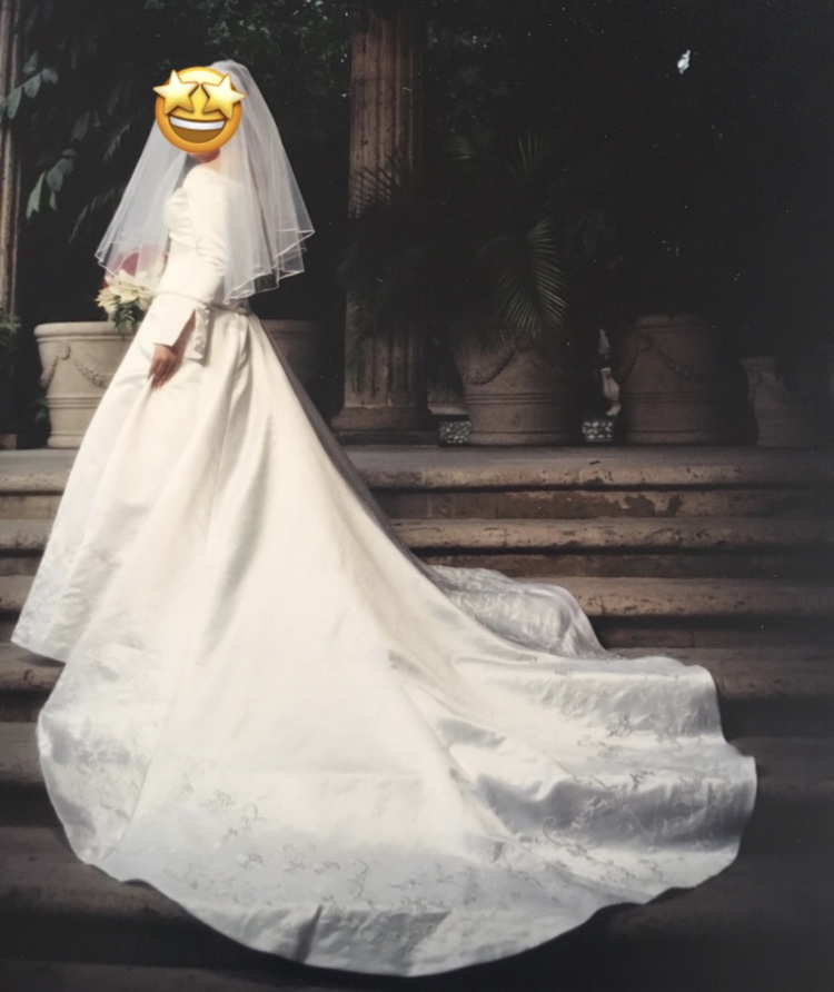 Hermoso vestido Diseñador Demetrios en tela seda con cauda larga estilo princesa, grabado en corpiño, mangas y bordes, con cauda sobrepuesta y manga larga