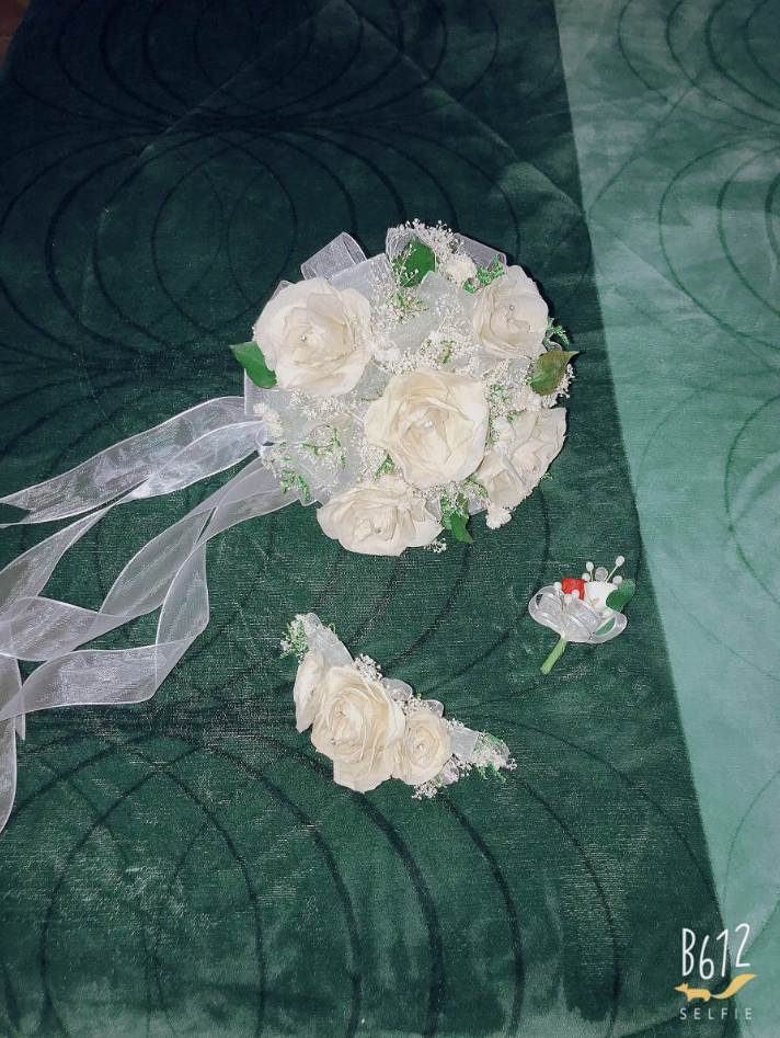 El Vestido de novia Incluye, crinolina, velo largo, ramo y tocado hecho a base de flores re-hidratadas, así como azar del novio y liga.