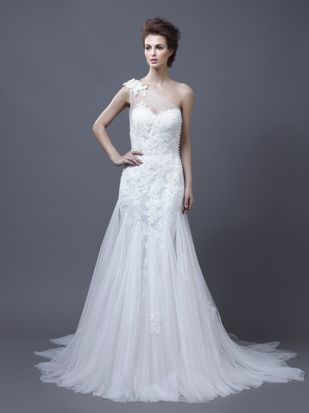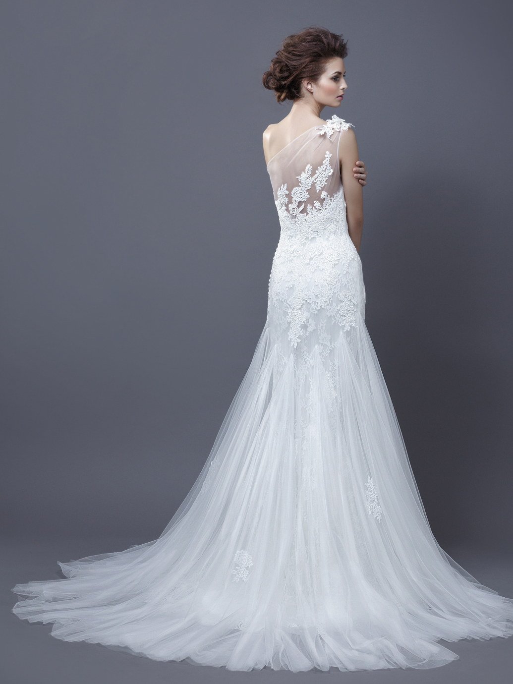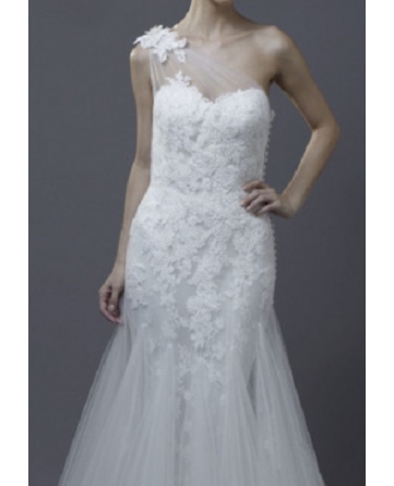 PRECIOSO VESTIDO DE TUL Y ENCAJE. TIENE DOS POSIBILIDADES DE USO, ASÍ QUE ES COMO SI PUDIERAS USAR DOS VESTIDOS EL DIA DE TU BODA. POR UNA PARTE PUEDES LUCIRLO EN SU FACETA ASIMÉTRICA, CON UN HOMBRO DESCUBIERTO Y EL OTRO CON UN DETALLE DE FLOR. DESPUÉS, PUEDES RETIRAR ESA PARTE DEL VESTIDO Y TE QUEDA COMO UN STRAPLESS EN FORMA DE SIRENA PRECIOSO DE PURO ENCAJE.
