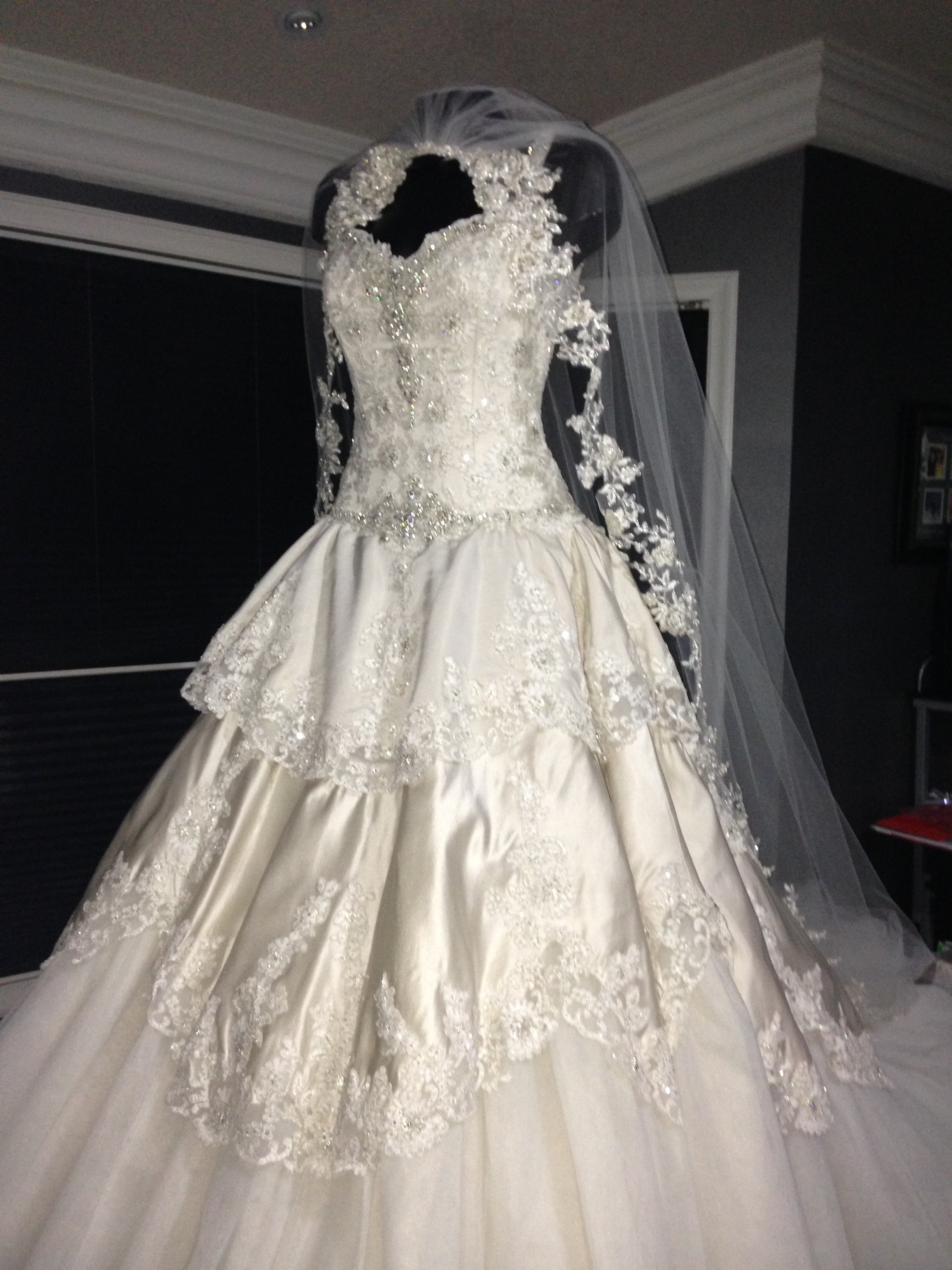 Vestido en corte catedral y escote en corazón, la mayoría satén de seda. Posee un bordado con pedrería con correas en los hombros también en pedrería fina; además bellamente adornado con 2 capas de satén con un terminado en encaje exquisito.