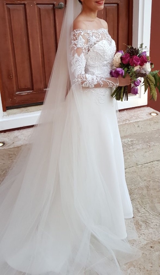 Vestido de novia de diseñador Mexicano en excelente estado corte sirena en razo con aplicaciones de encaje, hombros descubiertos, falda sobrepuesta de 5 capas de tul y cinturón azul cielo. Después de usarlo me lo lavaron y lo bordaron de nuevo para que quedara al cien