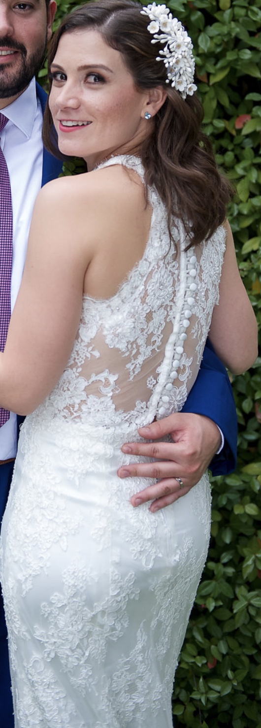 Vestido de Novia de Encaje con transparencias y botones de seda en la espalda. Diseño Único, hecho a mano. Talla 4-6, hecho a la medida, una sola dueña. No es pesado por lo que da mucha movilidad y frescura. Estilo Bohemio Campirano.