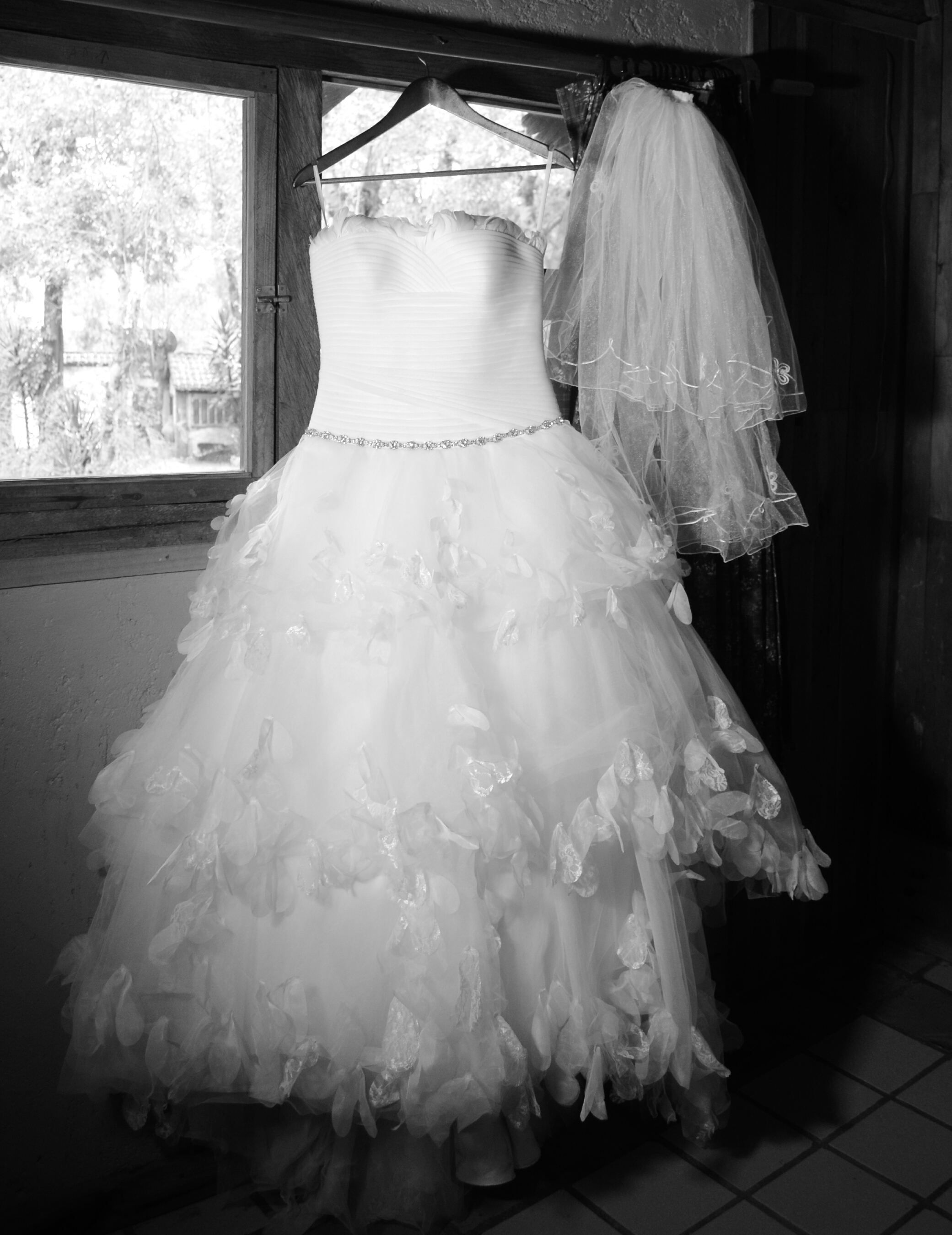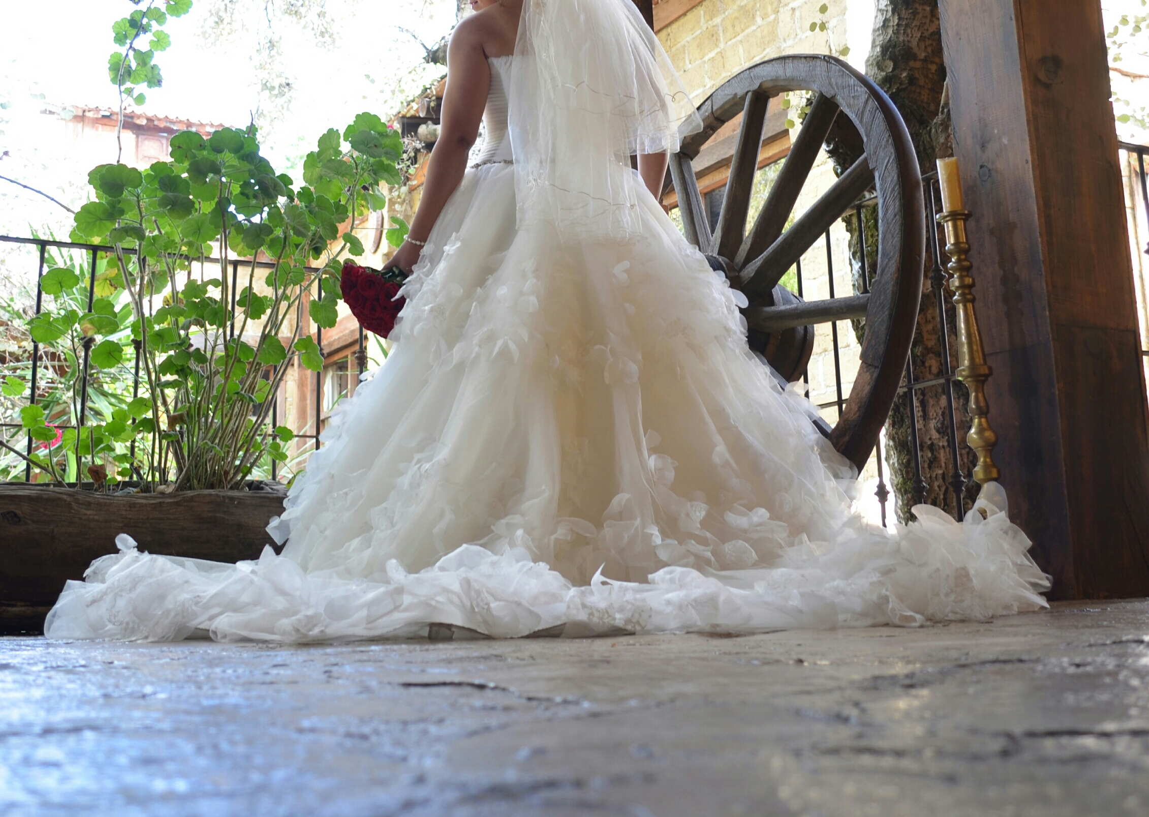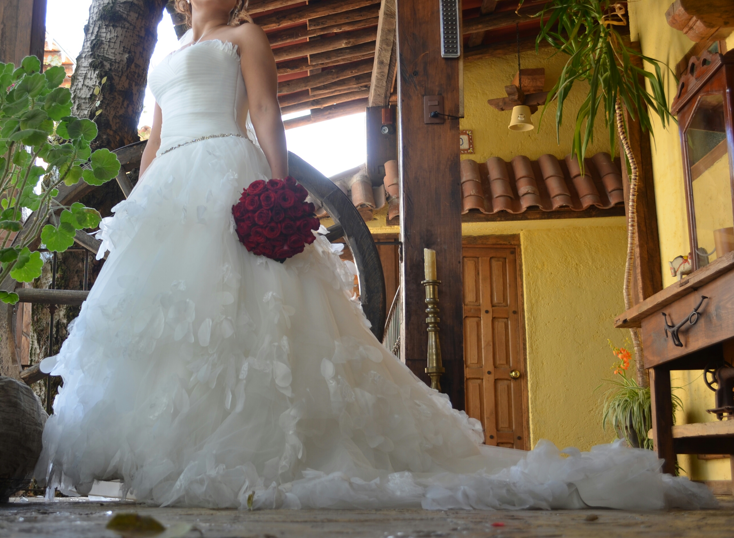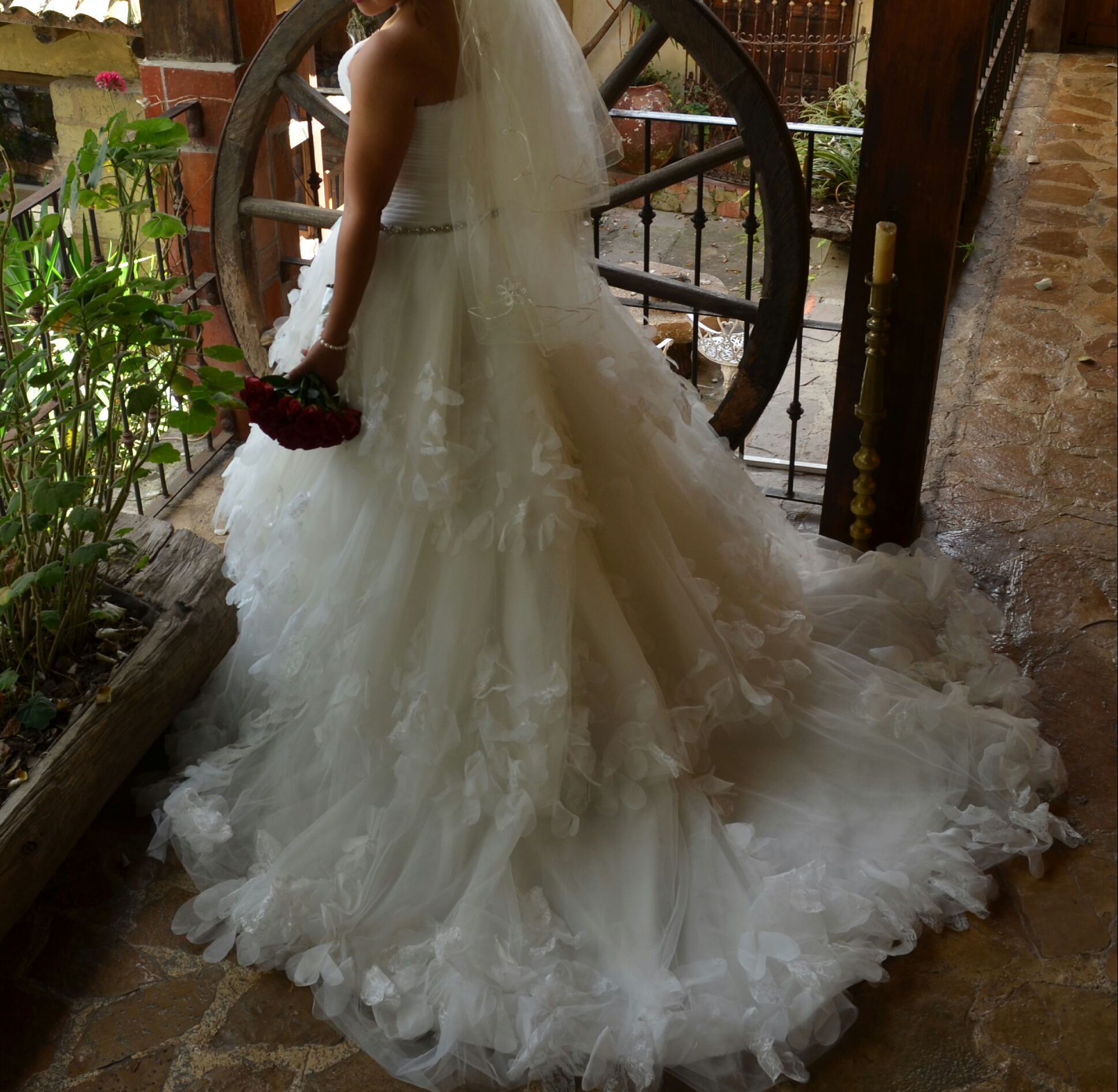 Corte princesa, con caída de cascada, con detalles en tela tipo mariposas, cinturón de piedras, lijeras plumas en el escote(todos estos detalles echos a mano) incluye dos velos corto y largo.