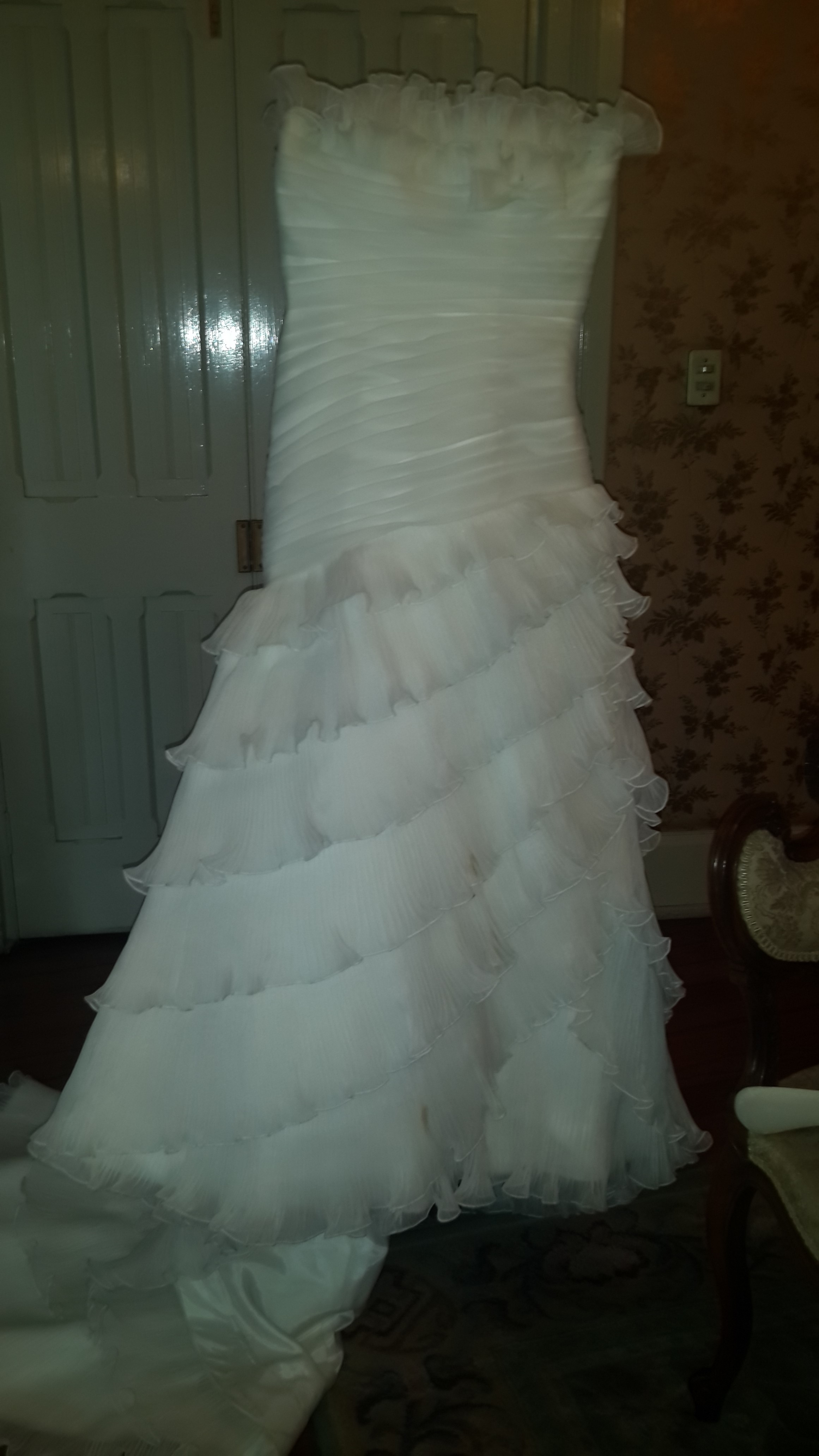 Es un vestido muy elegante, bastante cómodo, strapless con un tirante, muy ligero, no es pesado, con el talle todo plisado y la falda llena de olanes , tiene una cauda larga , que se puede abrochar al vestido en un botón. y queda perfecto para poder bailar sin ninguna complicación.