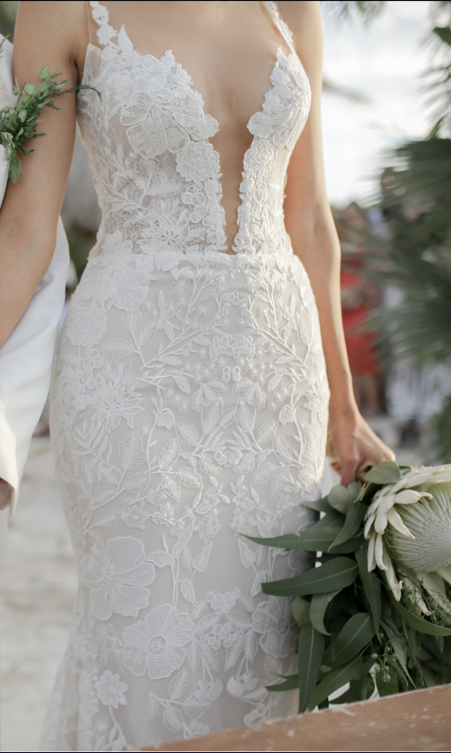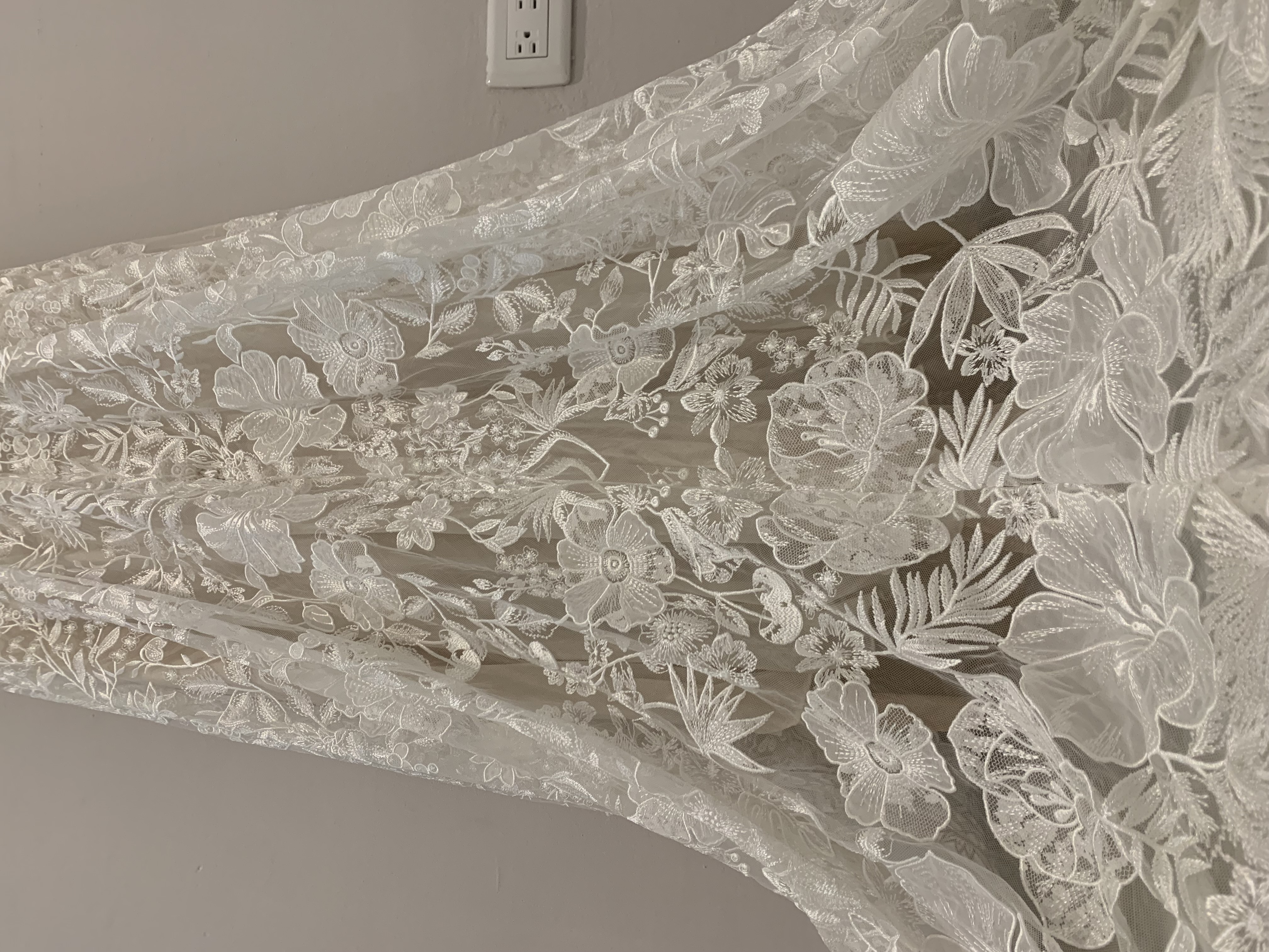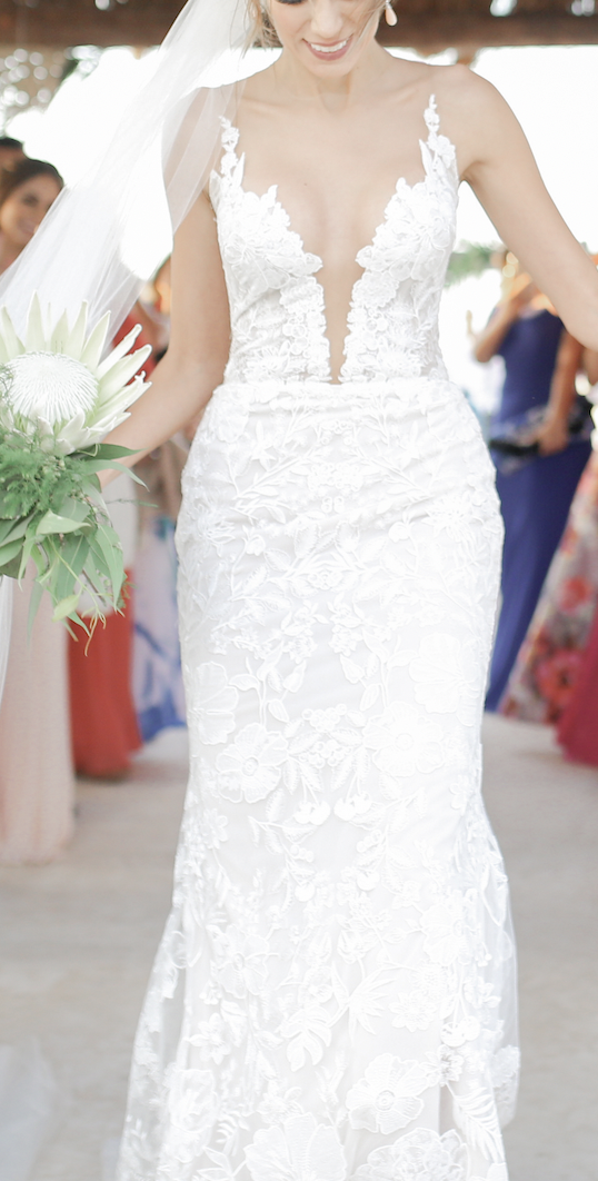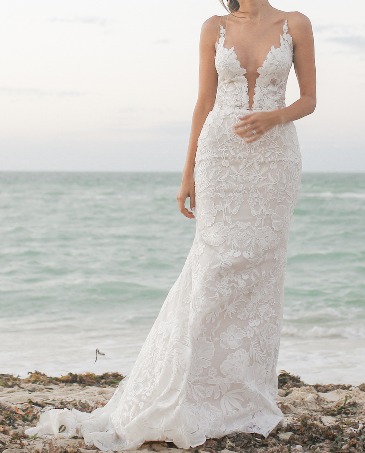Corte fit & flare en encaje floral con escote profundo y tul invisible, y espectacular espalda abierta con botones. El diseño estiliza la figura, la tela es muy fresca, suave y ligera, ideal para boda en playa o estilo boho – elegante.