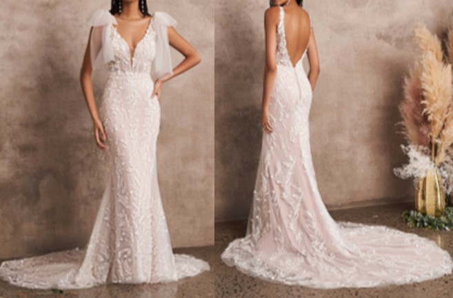 El vestido no se uso, es nuevo. Talla 6 o 30 para Mexico. Es ajustado tipo sirena acampado en la parte de abajo. Espalda baja. Tiene unos lazos que se pueden desmontar, ya sea para utilizar en la iglesia y/o en la fiesta quitarlos. Opcional su uso. Ligero con lentejuela brillante muy delicada. Hermoso. Modelo vigente en pagina del diseñador.