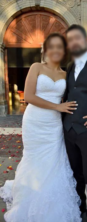 Hermoso vestido corte de sirena, con detalles discretos en pedrería, es ajustable con corsé.