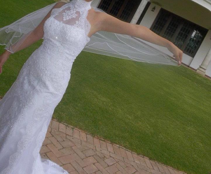 Romántico vestido de novia, compuesto de un cuello alto y manguitas cero. El talle es ceñido y el mismo esta confeccionado con encaje; se observa el encaje en la falda de la novia.TALLA 7. USADO ÚNICAMENTE UNA VEZ