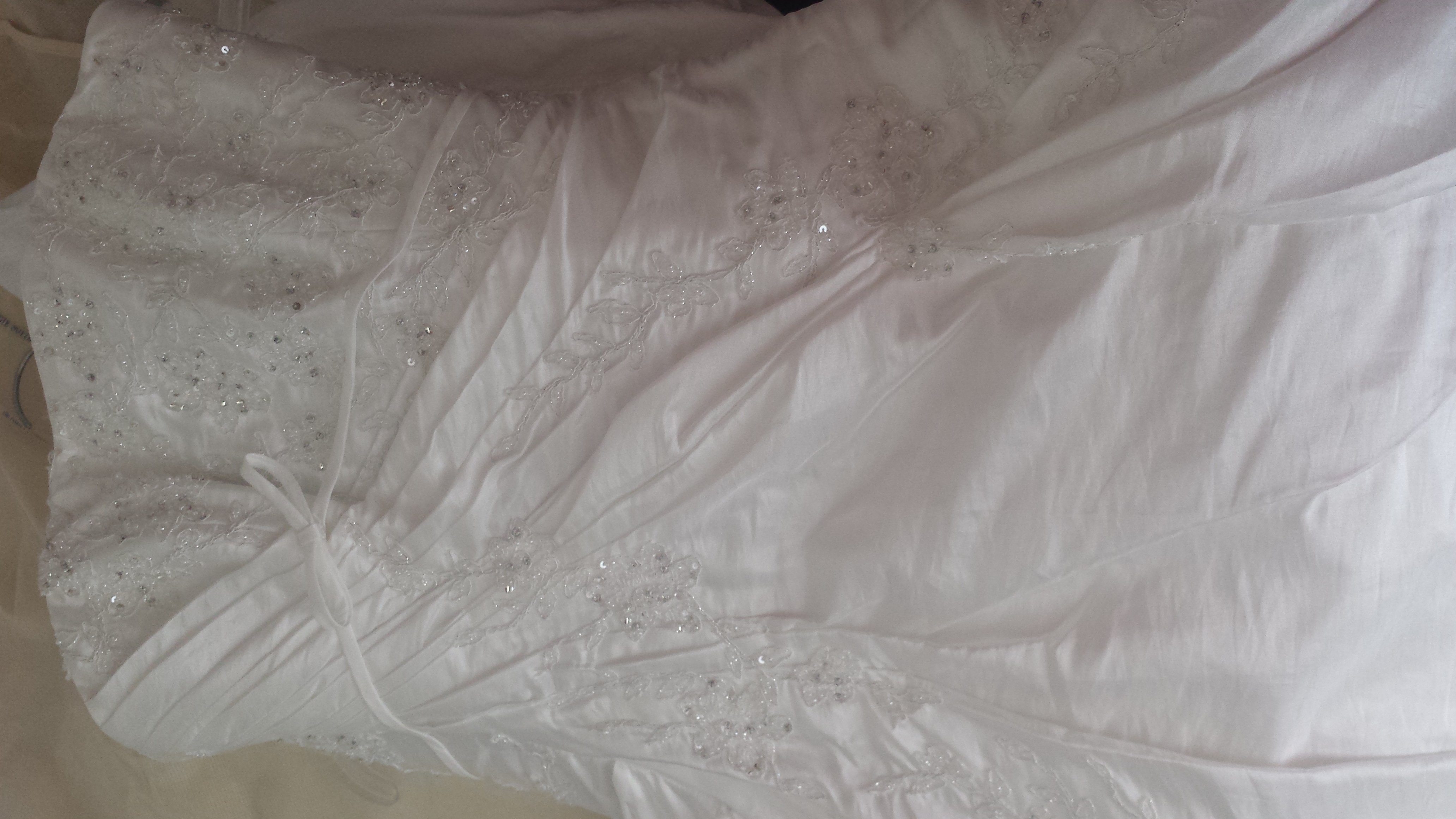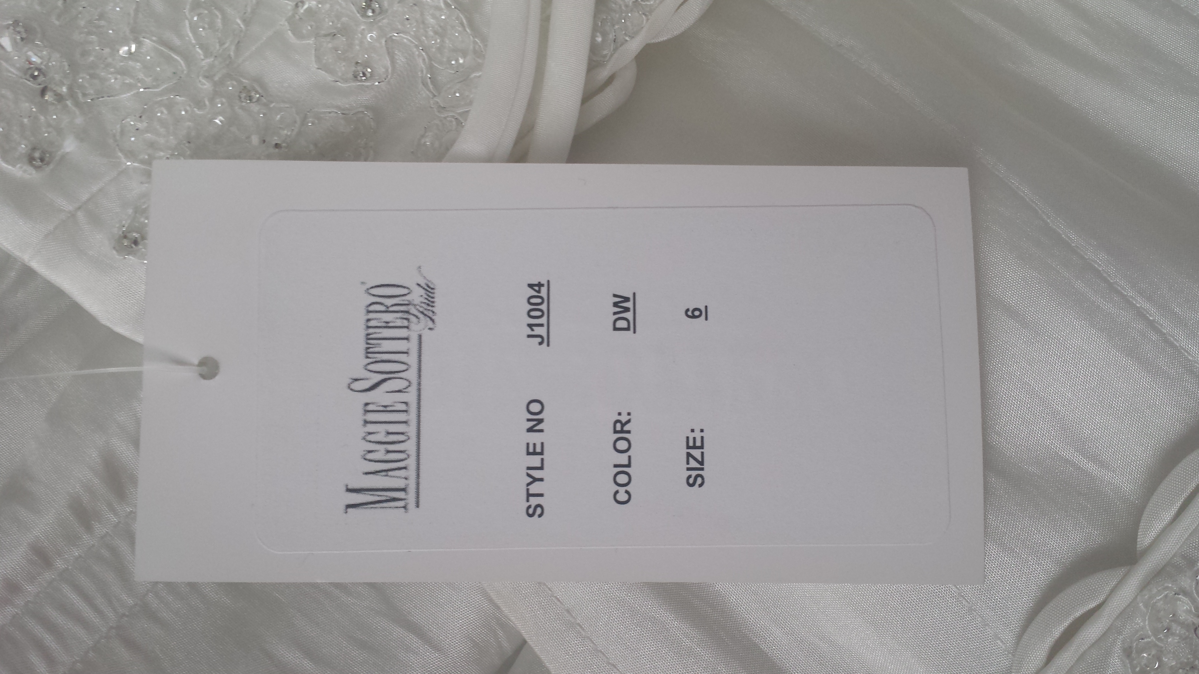 Este es un hermoso vestido que compre recientemente en una tienda exclusiva de Polanco en la Cd. de México. Lo elaboró la diseñadora Maggie Sottero y nunca ha tenido arreglo alguno, fue guardado tal cual lo recogí en la tienda hace uno meses sin hacerme la prueba y sin que lo ajustaran a mis medidas, por lo que será muy fácil que, si eres aprroximadamente talla 6, te quede. Es hermoso, nunca me he medido éste; sin embargo, cuando lo escogí y me medí el que estaba en aparador, se veía ¡¡Maravilloso!!, es un vestido que te enamora de inmediato, te moldea una figura preciosa, es conformable al usarlo, los detalles bordados son muy bonitos y la cola es hermosa.