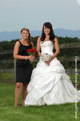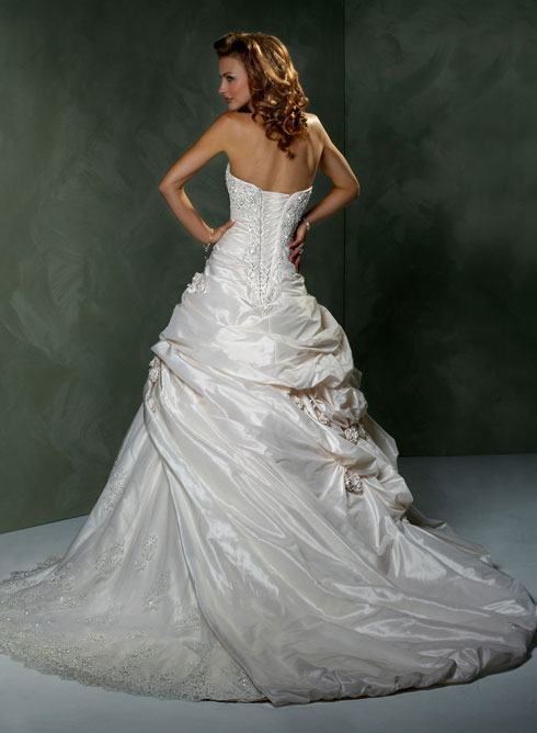 De una sola pieza , sin tirantes, vestido de una línea completa con cierre de cordones. Esta silueta llamativa , en la rica Burdeos tafetán , cuenta con el bullicio en cascada drapeados asimétricamente sobre una falda de encaje adornado . Encaje con cuentas acentúa el escote corazón gentil y rodea la firma posterior con cordones . Flores hechas a mano están ubicadas dentro de los alborotos de la falda.