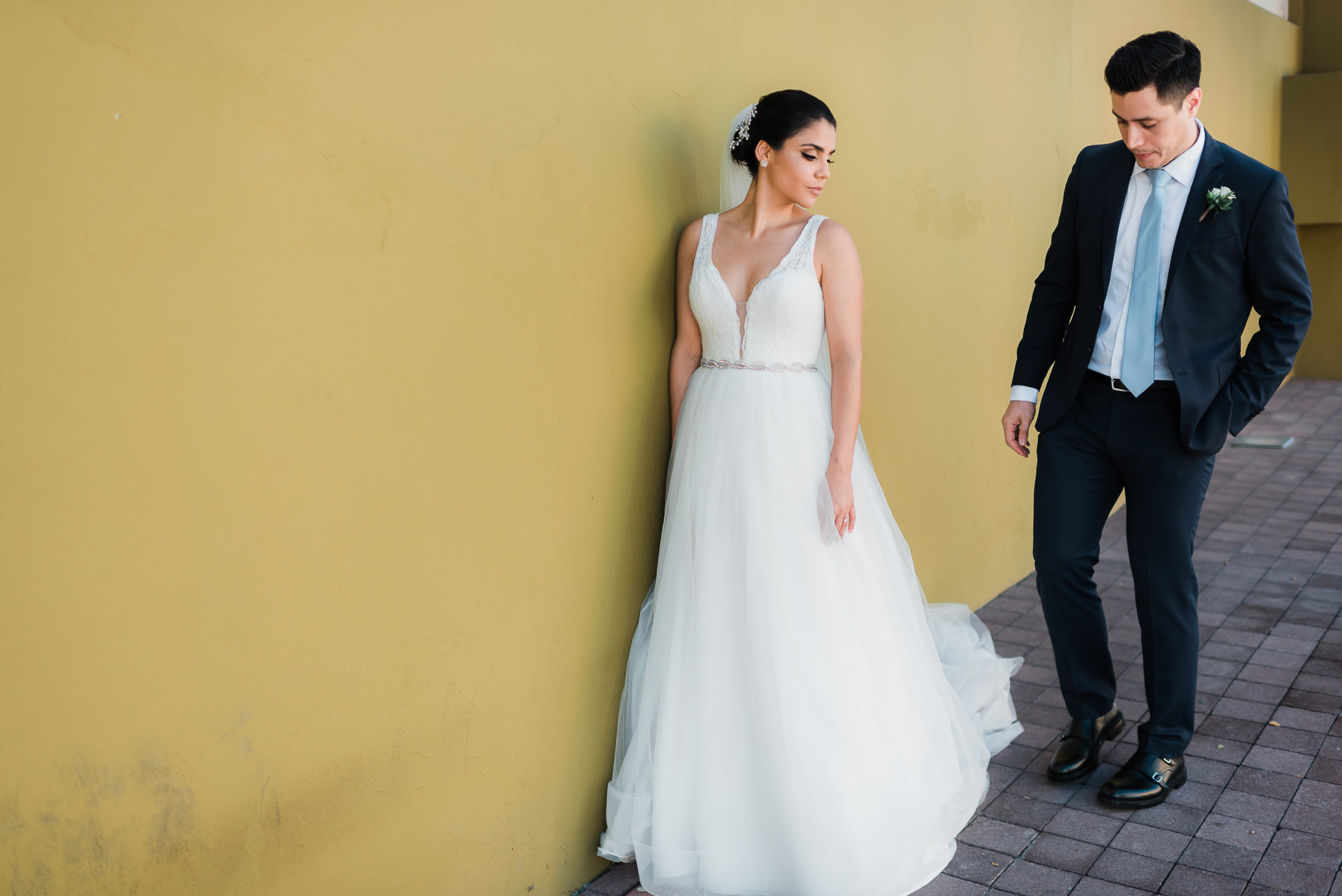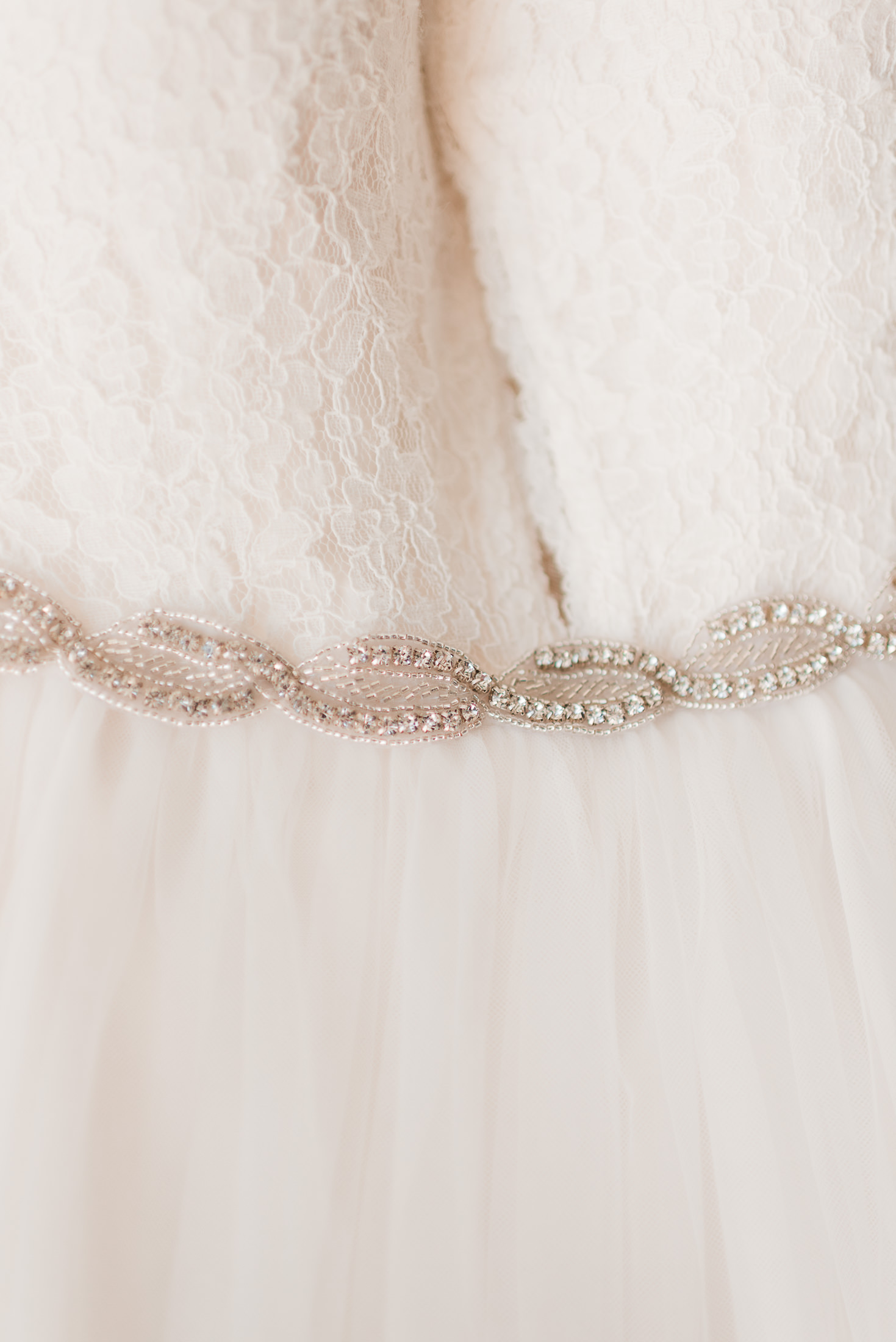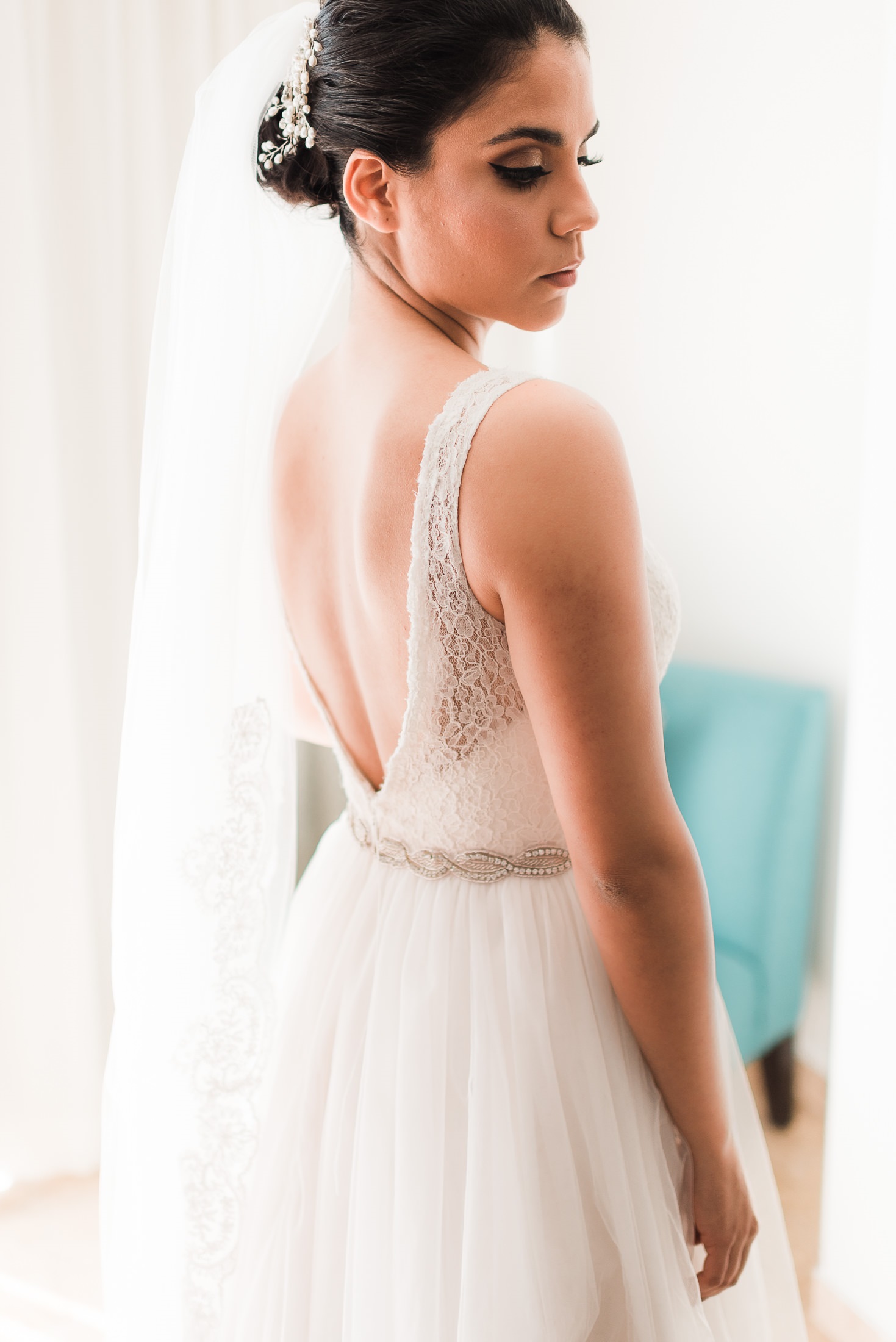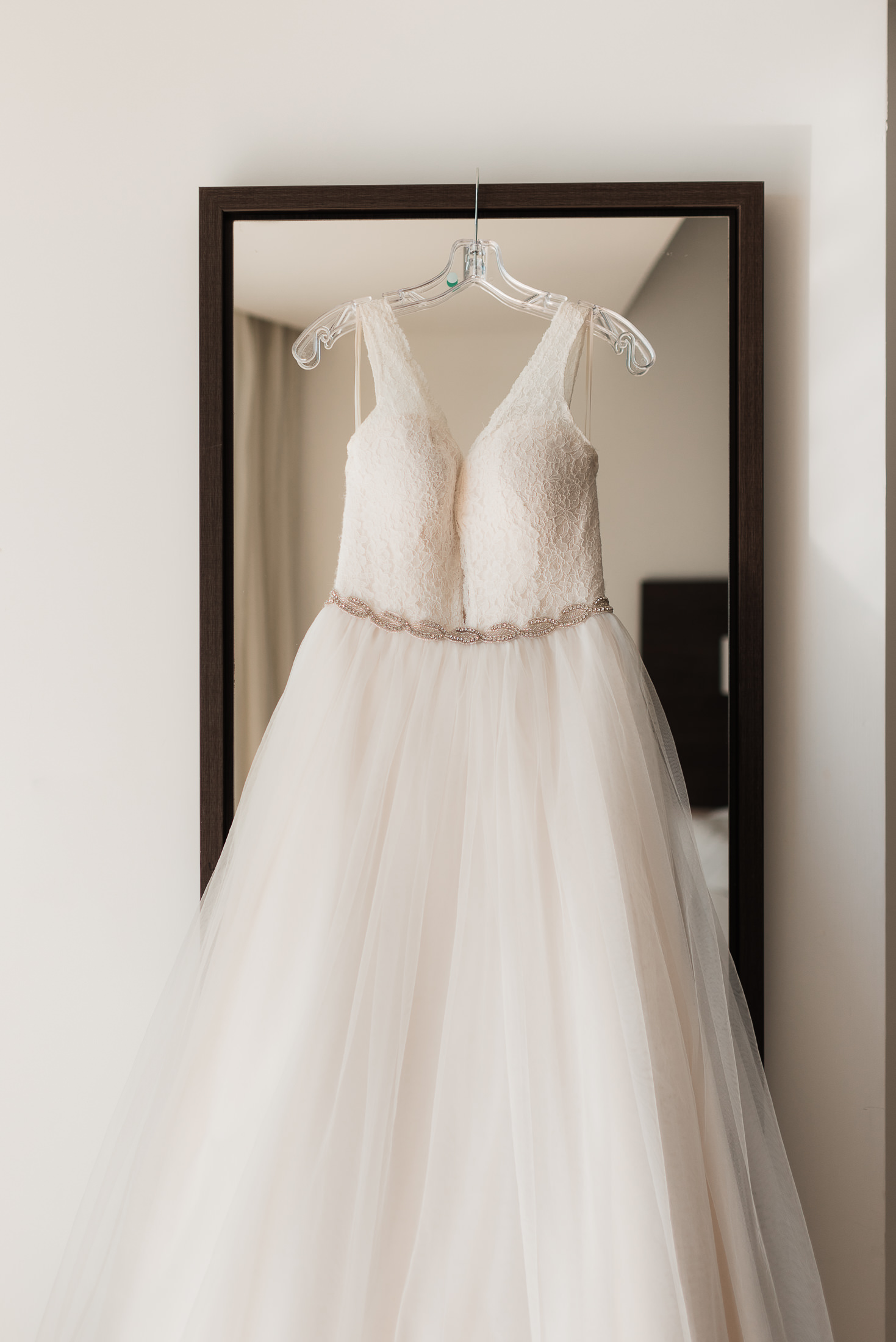 Hermoso vestido de novia Mikaella (Diseñadora canadiense) de encaje y tul. La parte de arriba es de encaje sin mangas con un escote pronunciado mientras la falda de tul con un detalle a la cintura hace este un vestido clásico y atemporal.