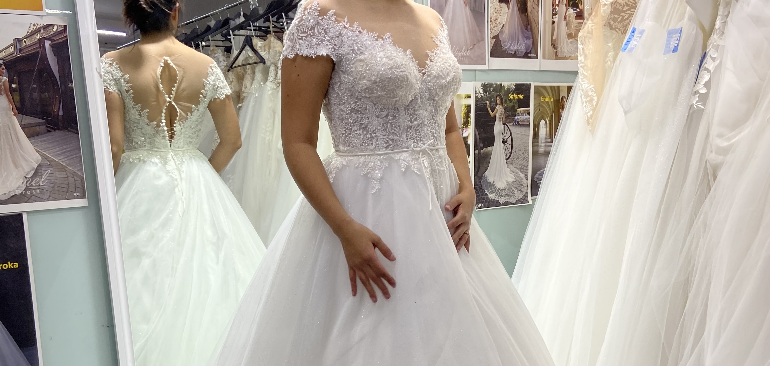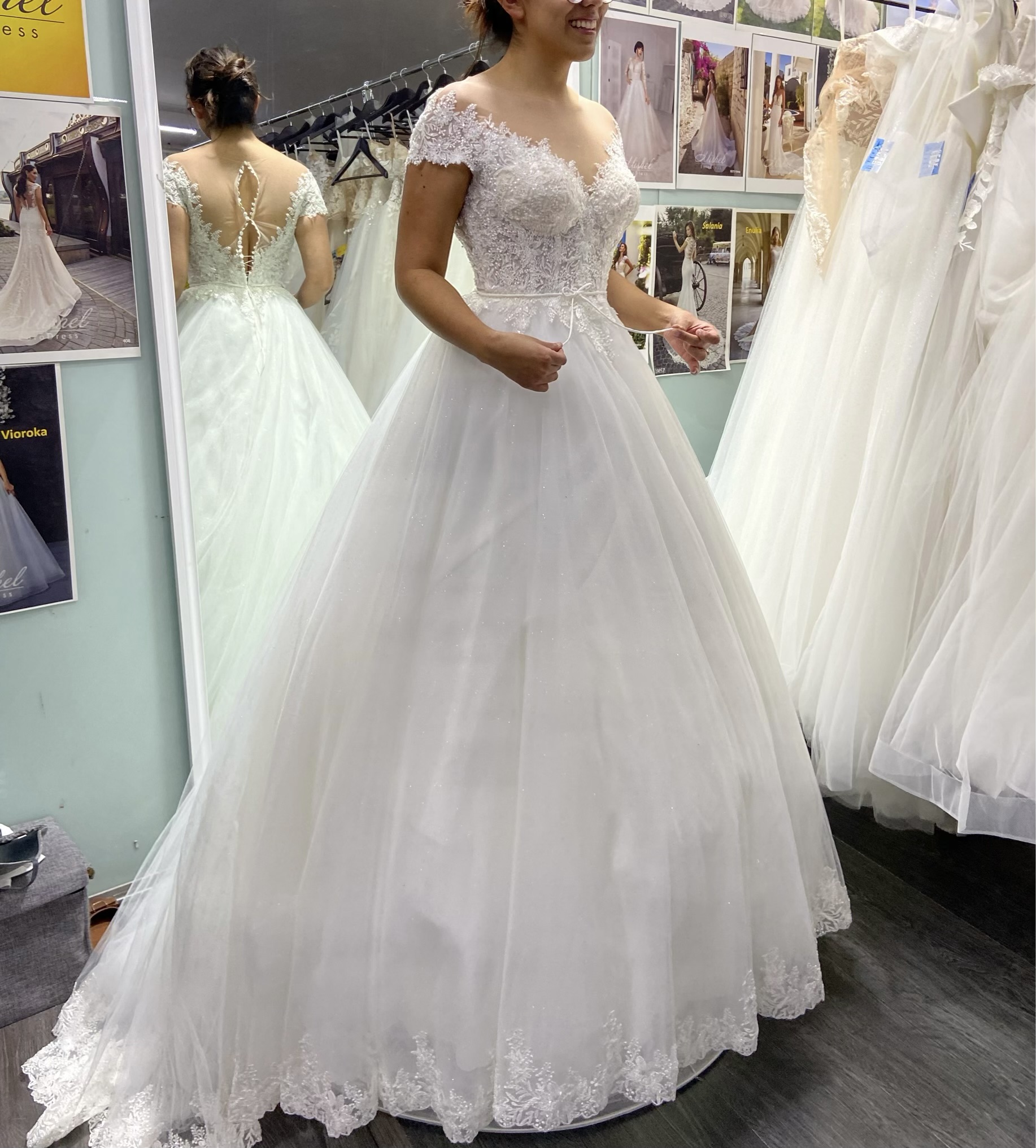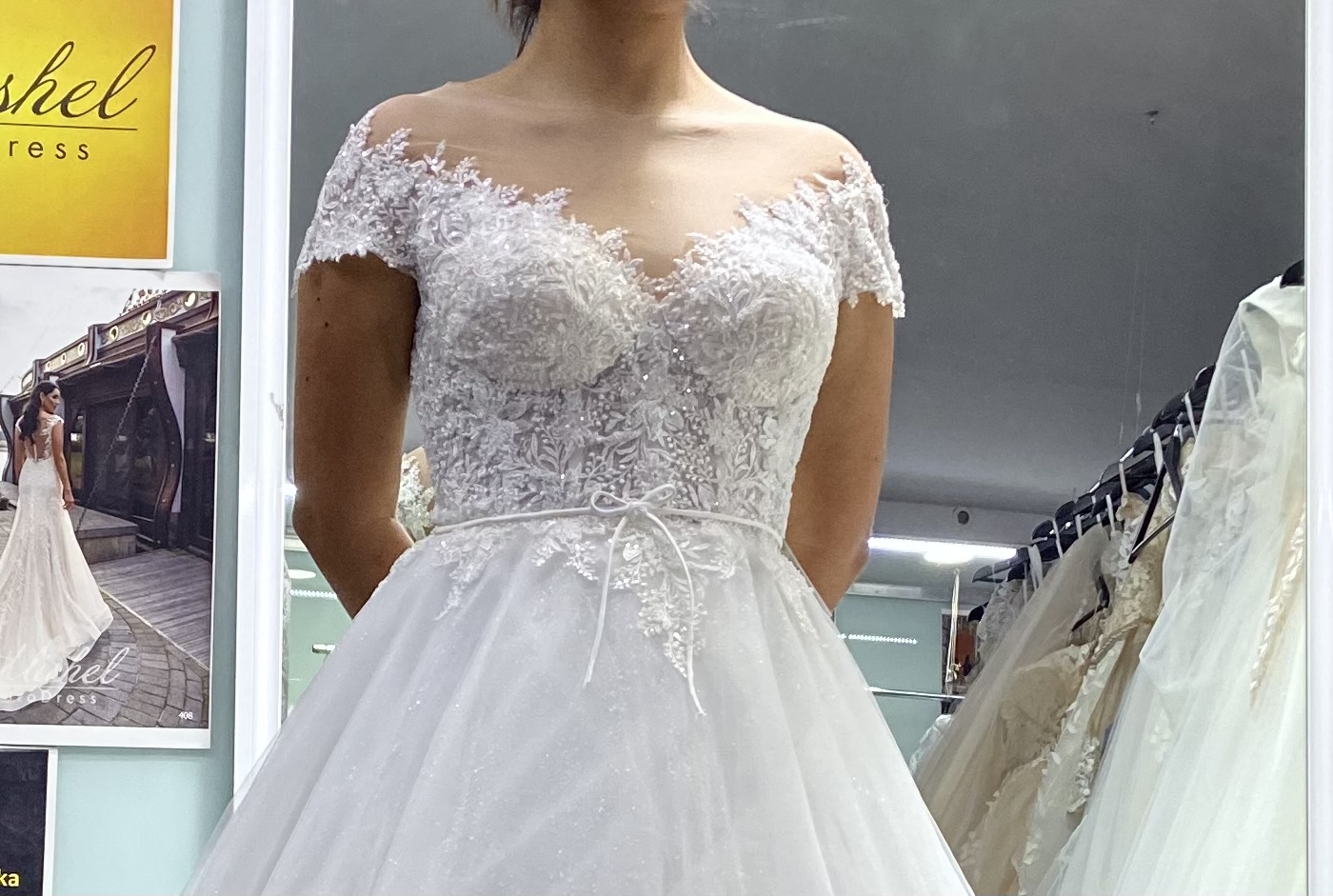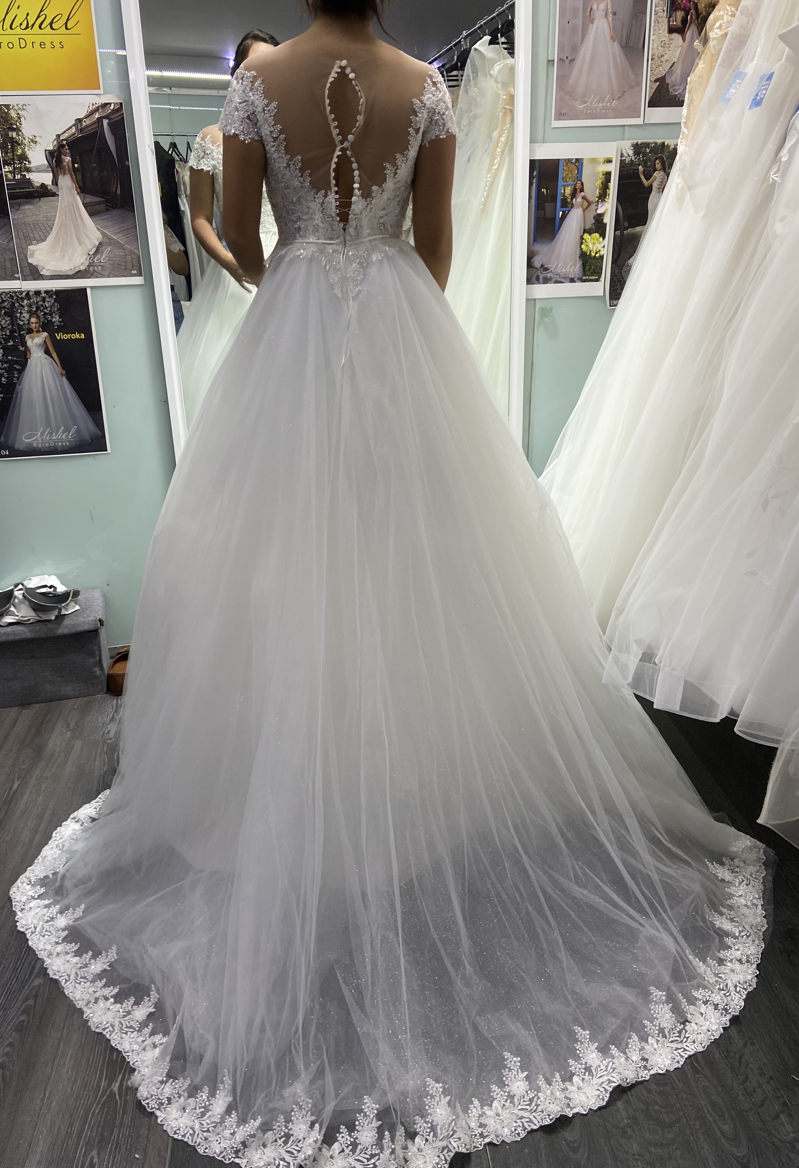 Es un vestido precioso con detalles de brillos en la falda que le dan un toque delicado, tiene cola de princesa y delicado encaje en el pecho con malla transparente en los hombros.