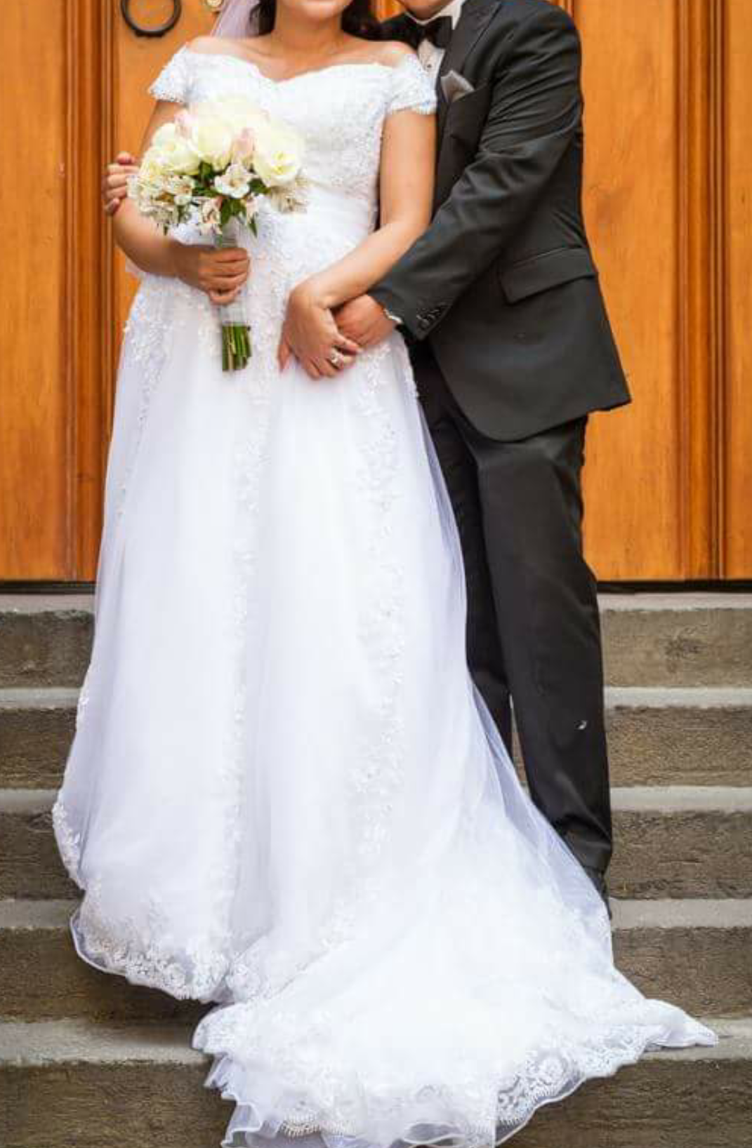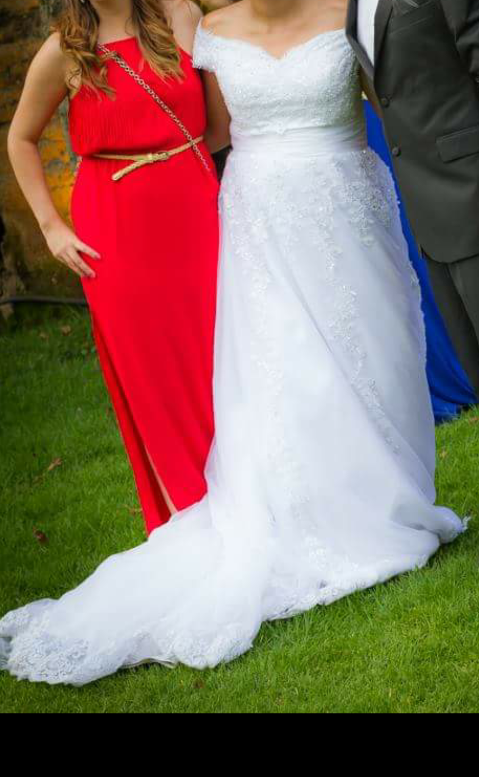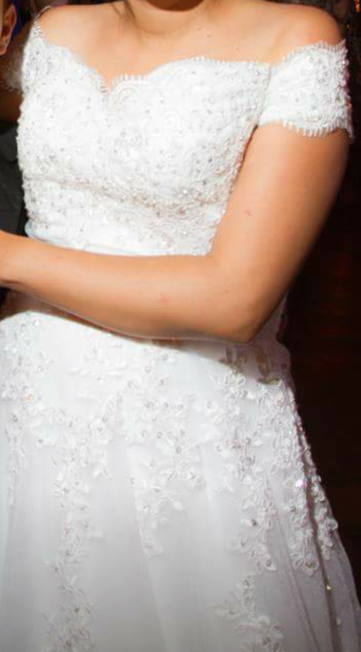 Talla 6 a 8 .. totalmente ajustable con listones en la parte de atrás. . Se uso con 5 meses de embarazo por lo que es ideal para novias embarazadas y se ajusta a tu figura.. disimula mucho el vientre. Mangas con hombros caídos. Color ivory blanco . Me lo regalo una tía que vive en Barcelona y lo compro en una boutique allá . Acepto ofrecimientos