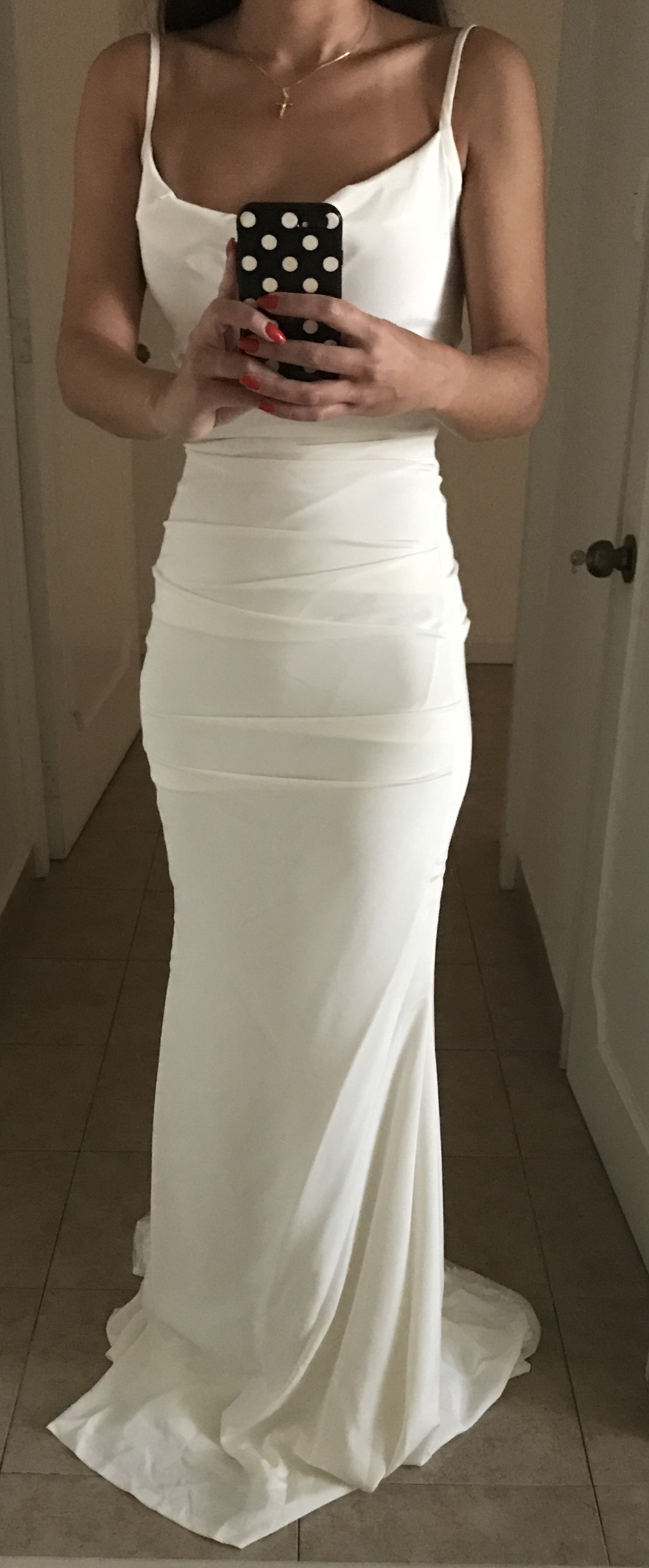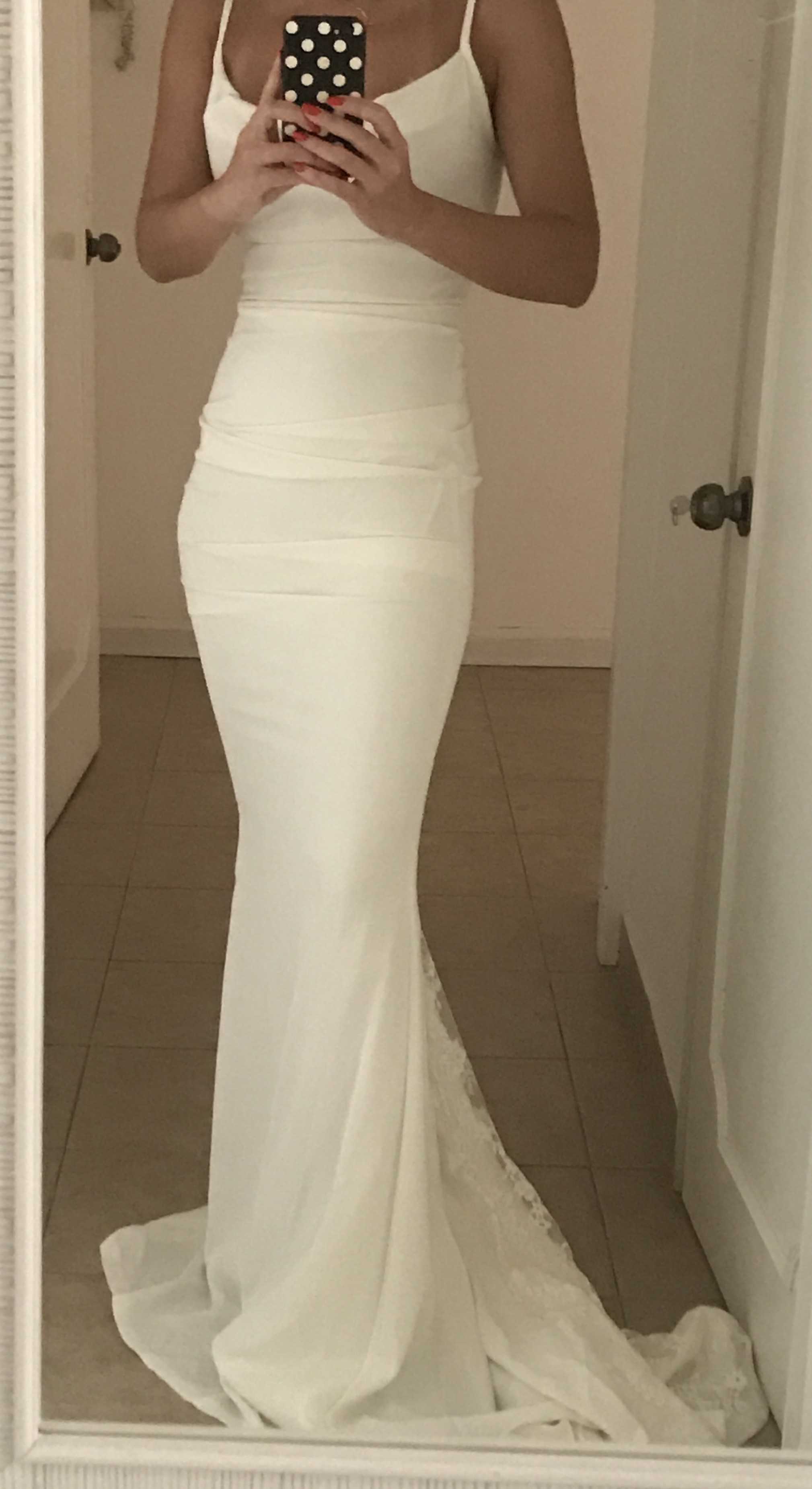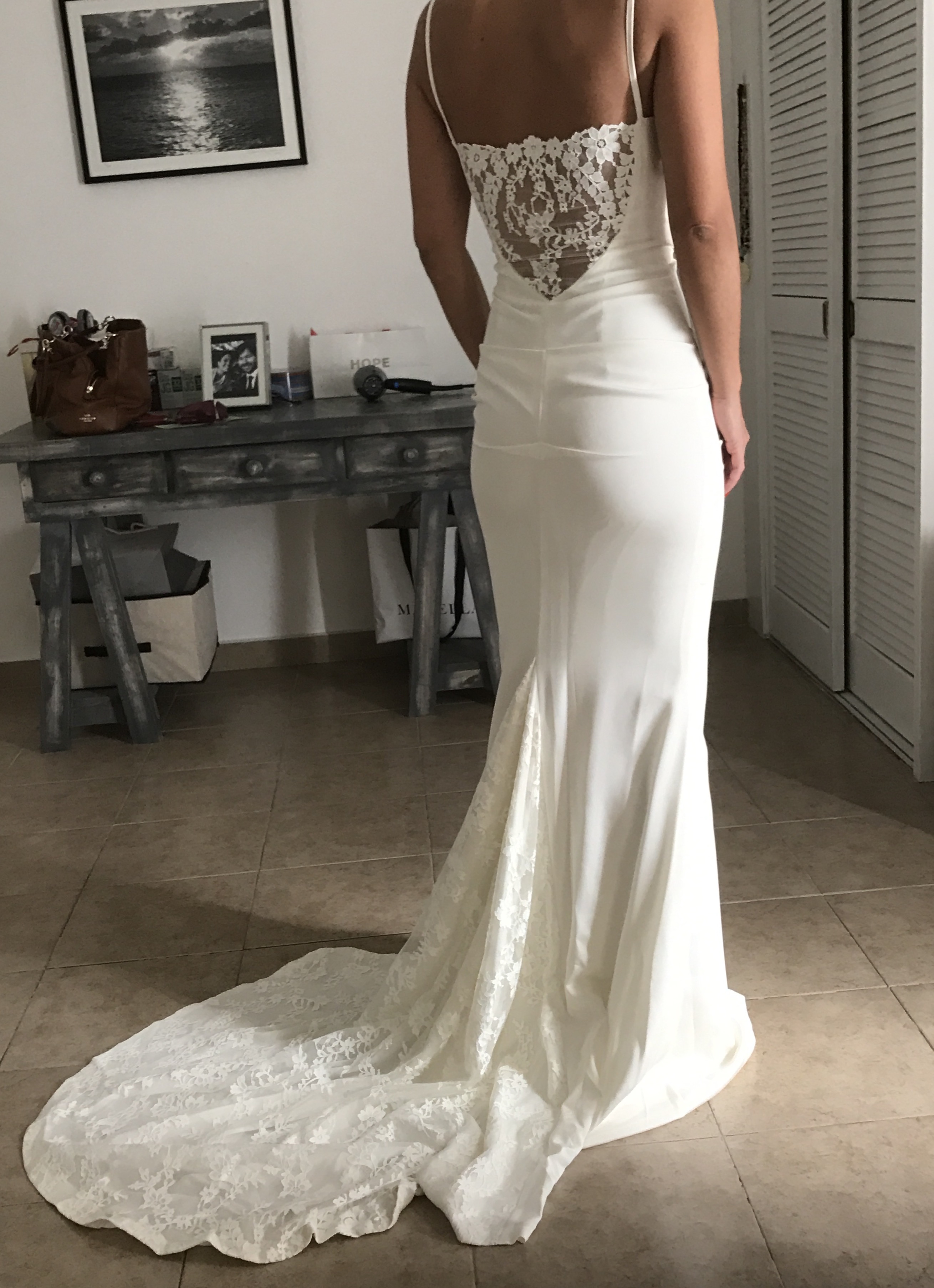 Vestido nuevo comprado en Octubre en la tienda Lace and Lemons, en Polanco, CDMX. Comprado para boda en la playa, en crepe, tiene encaje en la espalda y en la cauda. Importante decir que es talla muy chica (mido 1,60m, pero he ajustado el vestido para un tacon de 12cm, y peso 48kg, soy talla 0). No lo he usado, esta nuevisimo guardado en el paquete de la tienda (decidi de ultimo momento comprar otro vestido con más encaje y menos ajustado).