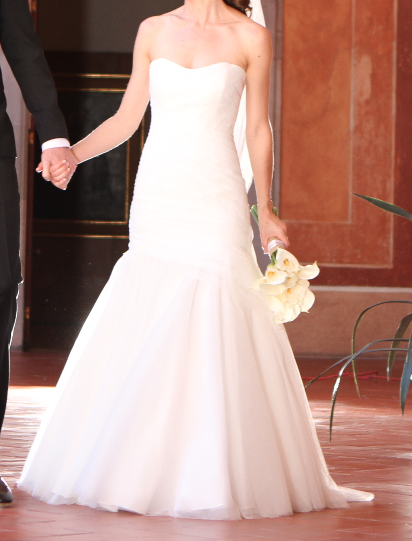 Fino vestido de novia con hermoso diseño, strapless, color blanco (silk white) y de corte Mermaid/trumpet.