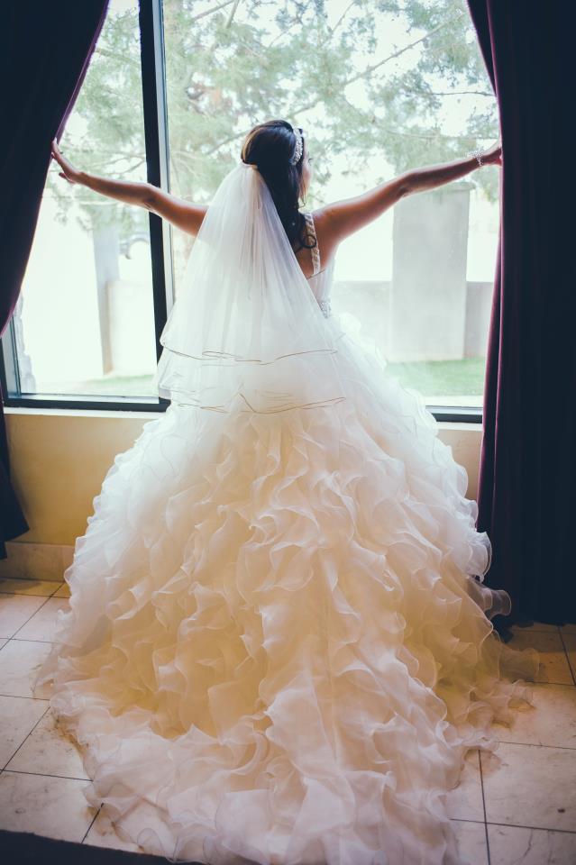 Corte imperio enmarcadado por un cinturon de pedrería. Holanes de organza. Tirantes de pedrería como arreglo adicional. Escote en forma de corazón.