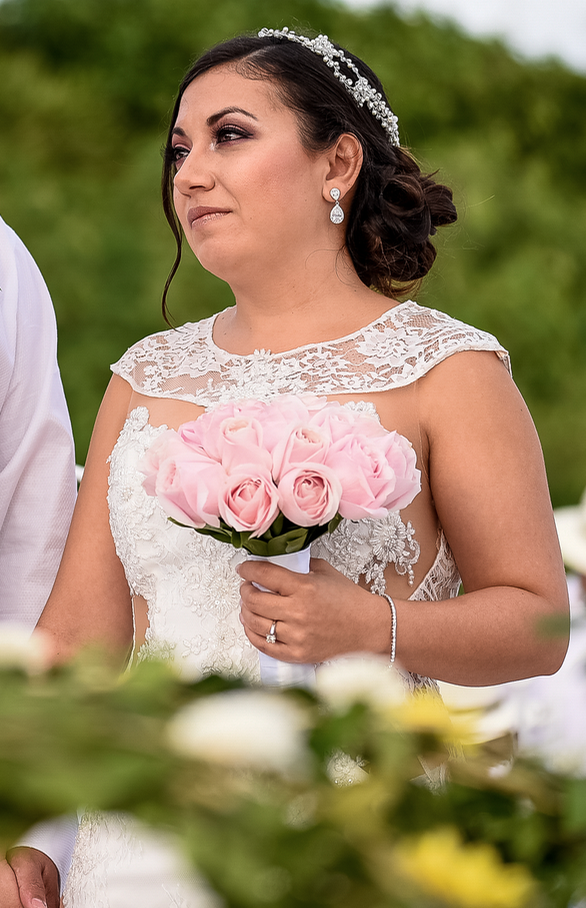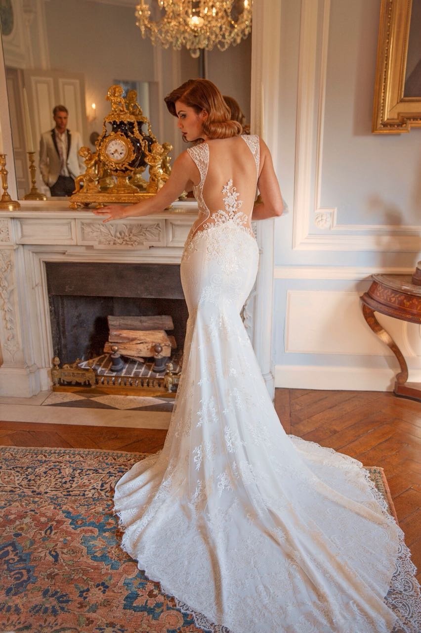 Hermoso vestido de novia en color marfil de una sola pieza adornado con encaje cristal.