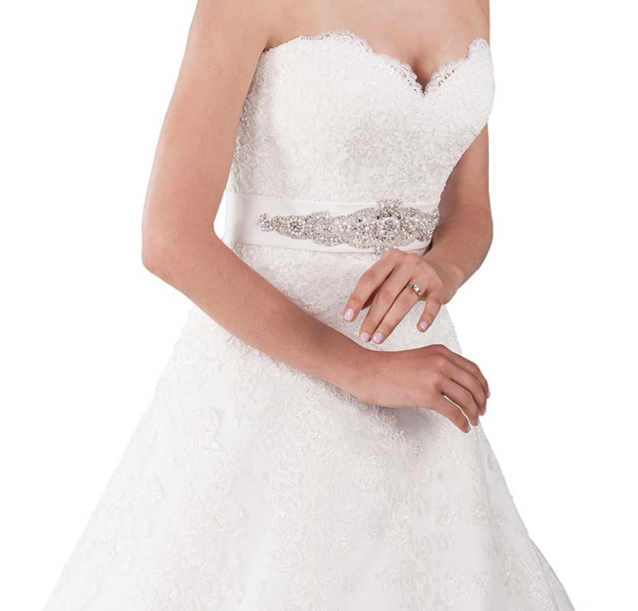 Vestido corte princesa en un vanguardista diseño de tul chalis rebordado en sutage e hilo de plata, strapless con escote de corazón, cinturón de satén con detalles de cristal, falda semi circular con cauda tipo capilla.