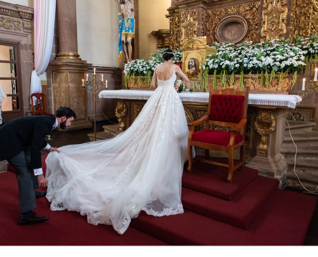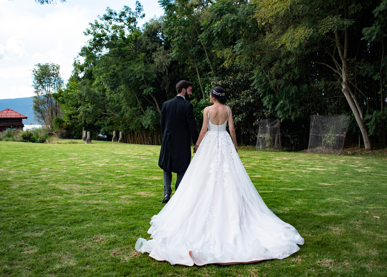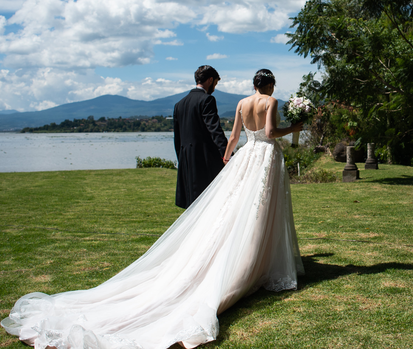 Vestido de novia excepcional con delicado escote en frente y espalda baja.