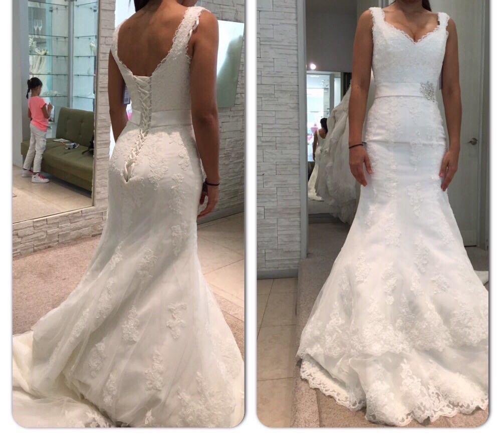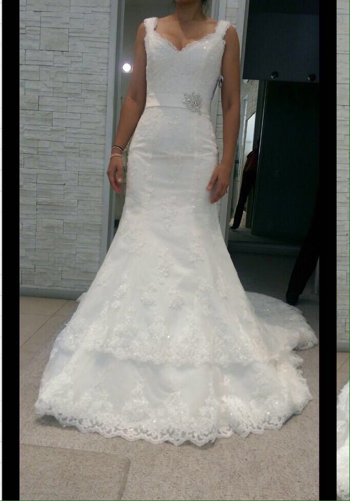 Es un vestido hermosisimo NUEVO, al cual se le pueden hacer ajustes en tienda, incluye, velo , faldilla, liga y Azhar. Es colección 2016 !! hace muy bonita figura además que el corte es muy elegante. No te vas a arrepentir es un vestido para acompañar tu Sueño….
