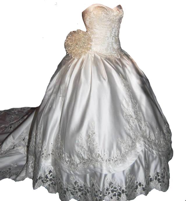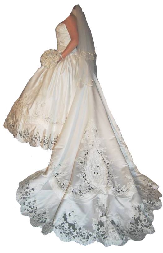 Hermoso vestido de novia tipo princesa con cauda desmontable, tela calada y el talle bordado.
