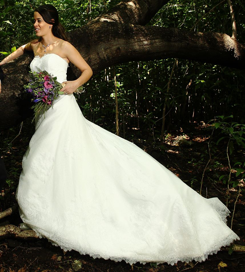 Hermoso vestido de seda y encaje color ivory. El cierre es con cintas. El escote en forma de corazón lo hace ver muy femenino y también discreto. A pesar de tener volúmen y una cola mediana no se siente pesado, es cómodo y ligero. La cola se recoge fácilmente con un botón. Está en perfecto estado y se llevó a lavado profesional después de la boda, por lo que se ve como nuevo.