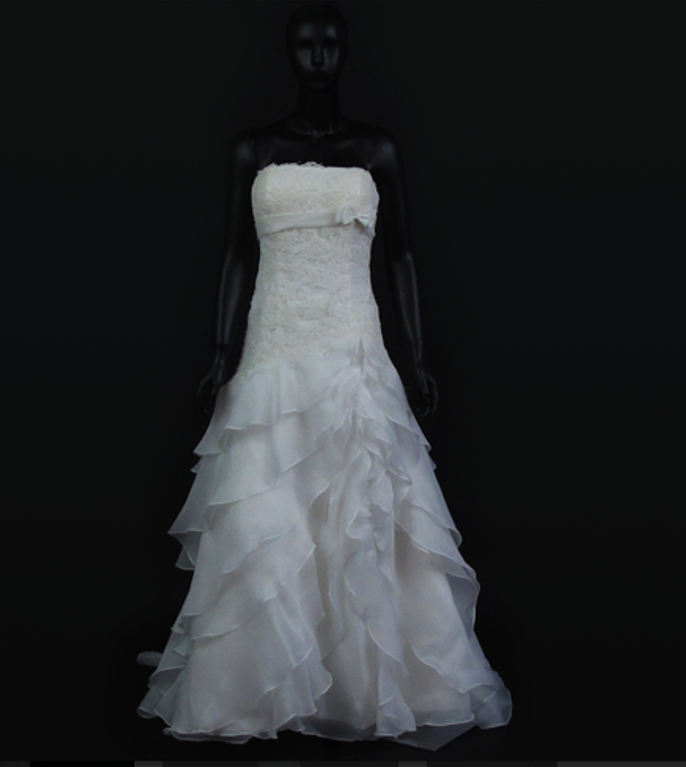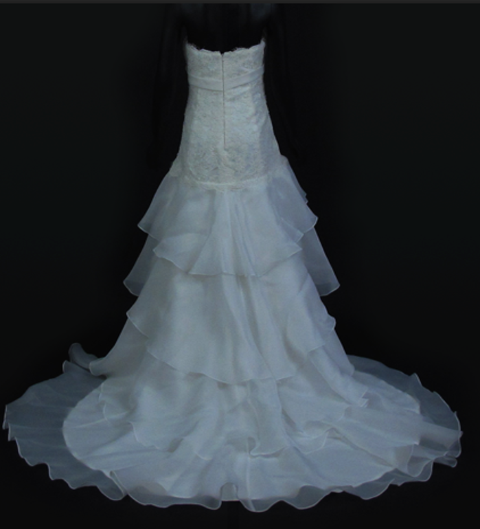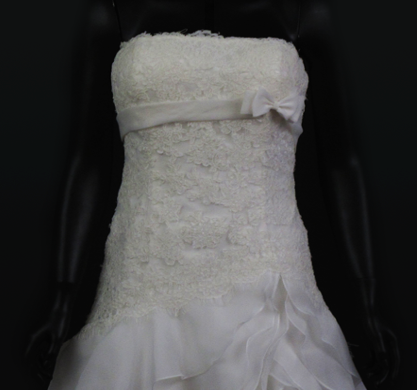Disfruta de un hermoso vestido entallado del escote a la cadera hecho de encaje con detalle de moño en tela de organza, por dentro, en el talles tiene una fajilla ajustable, el cierre de la parte trasera es invisible, lo cual lo hace delicado.Falda y cauda de holanes diagonales confeccionados en organza, arreglado para novias con talla de 1.55 a 1.65 mts de altura. En la parte trasera cuenta con botón para ajustar la cauda