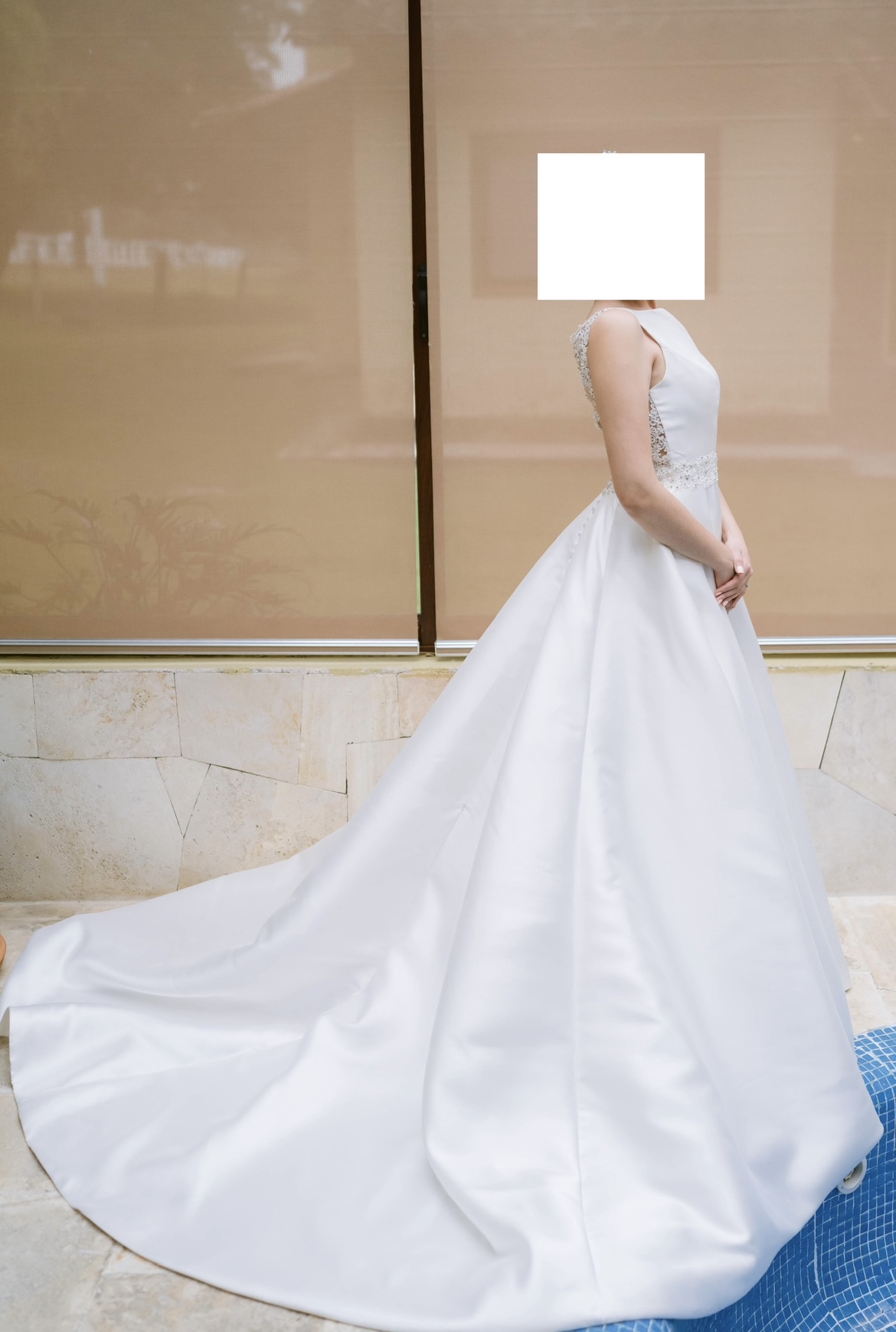 Este precioso vestido de Pronovias es super cómodo. Tiene una hermosa cola de tamaño mediano, como se puede apreciar en las fotos. La cola se puede subir en cualquier momento y se torna en una bella forma A, brindándote una comodidad única que te permitirán disfrutar de tu día todavía más.