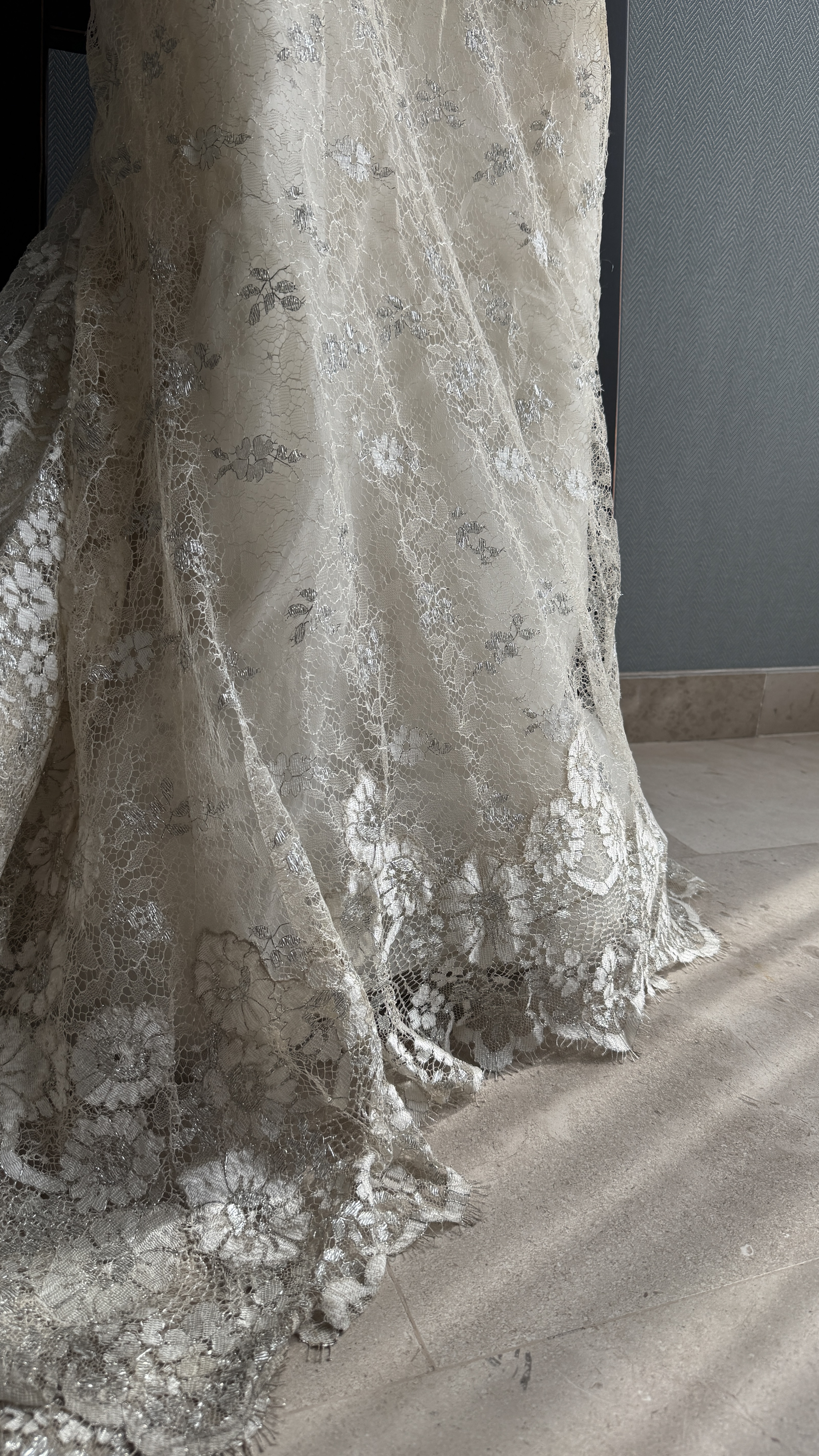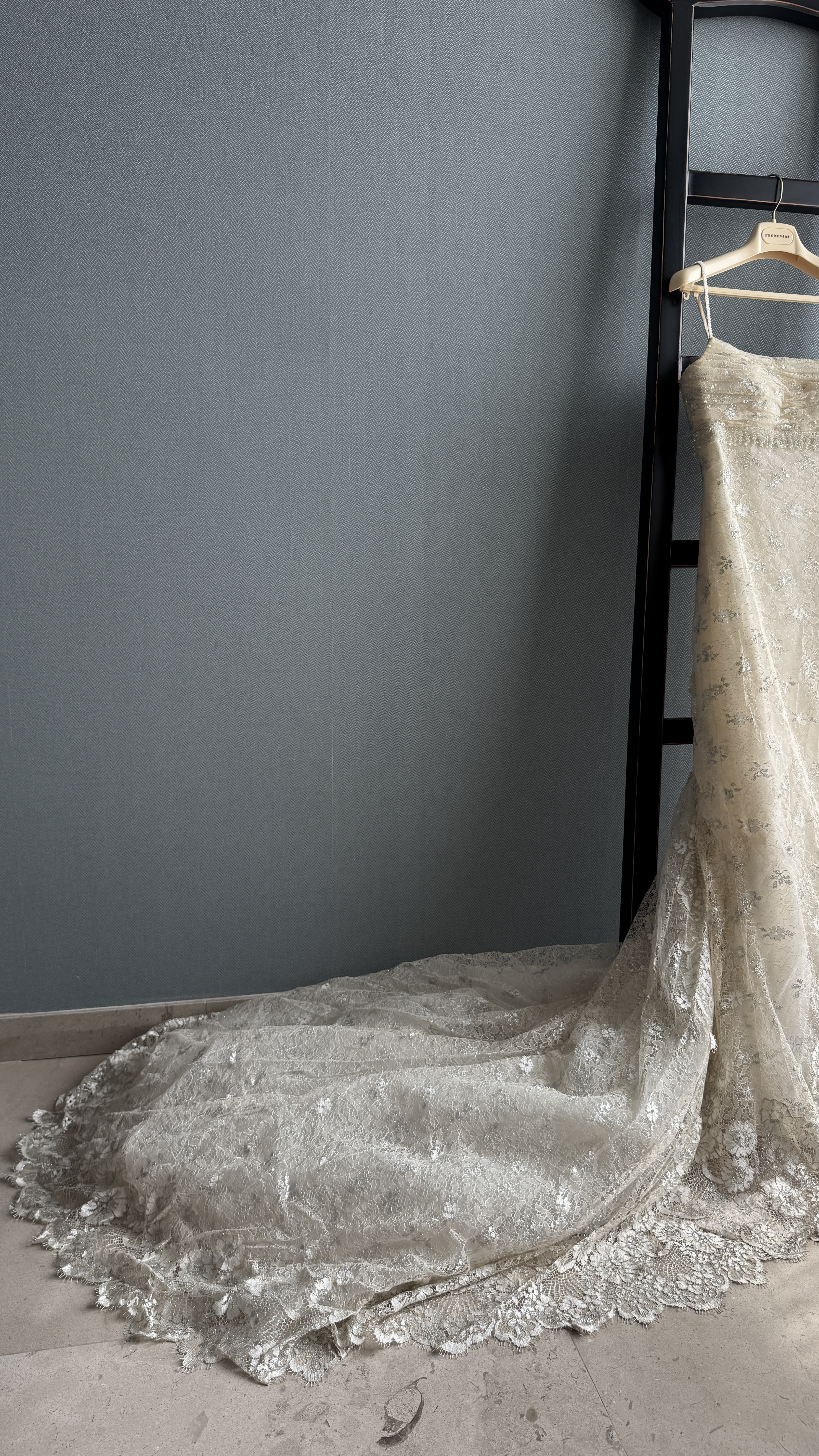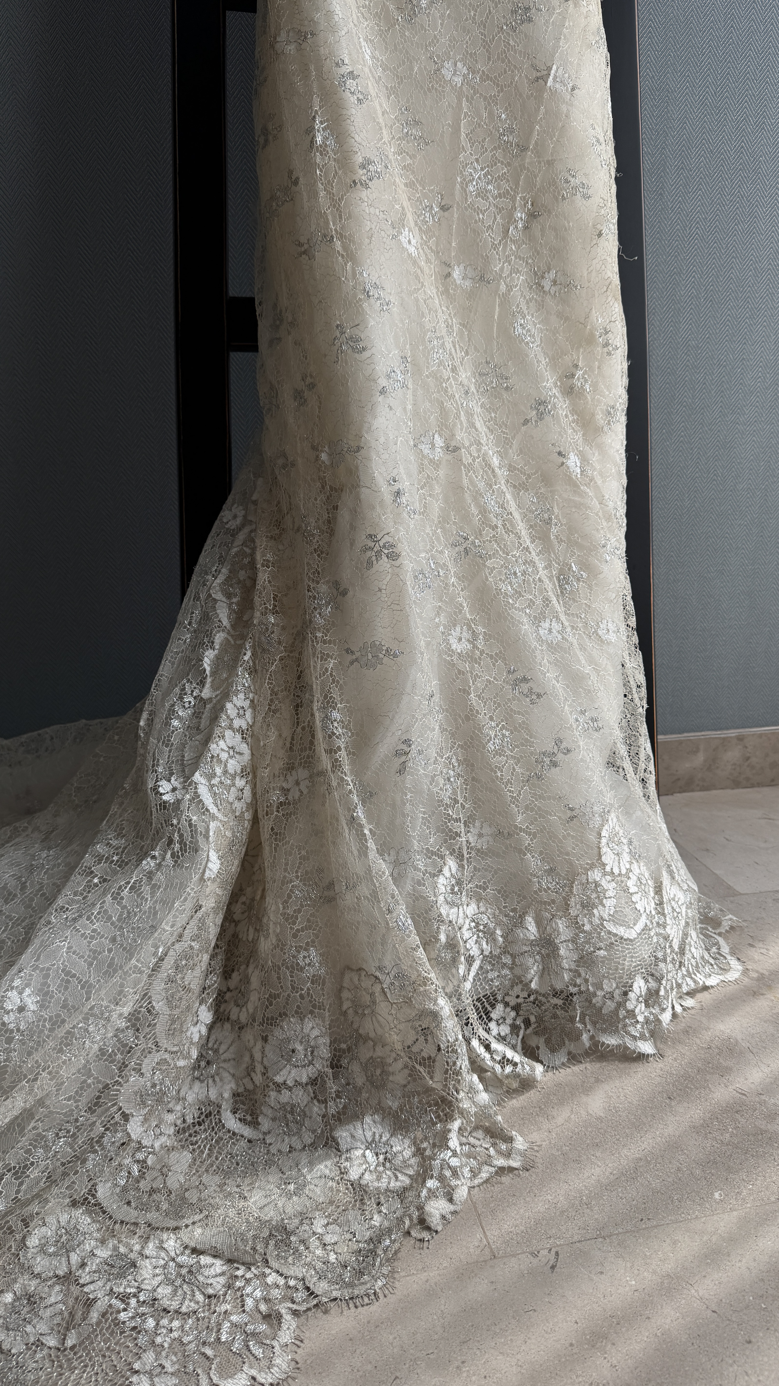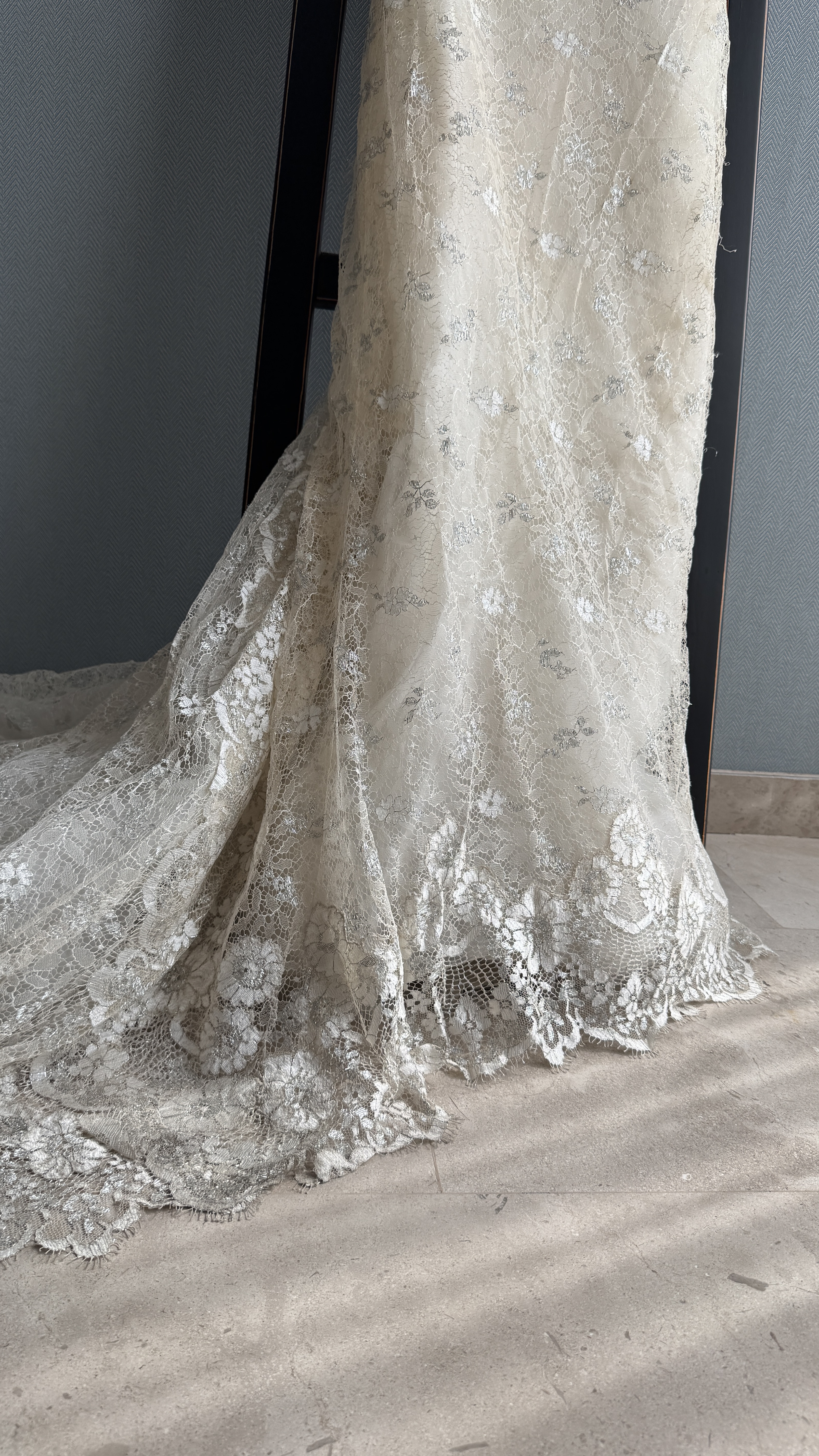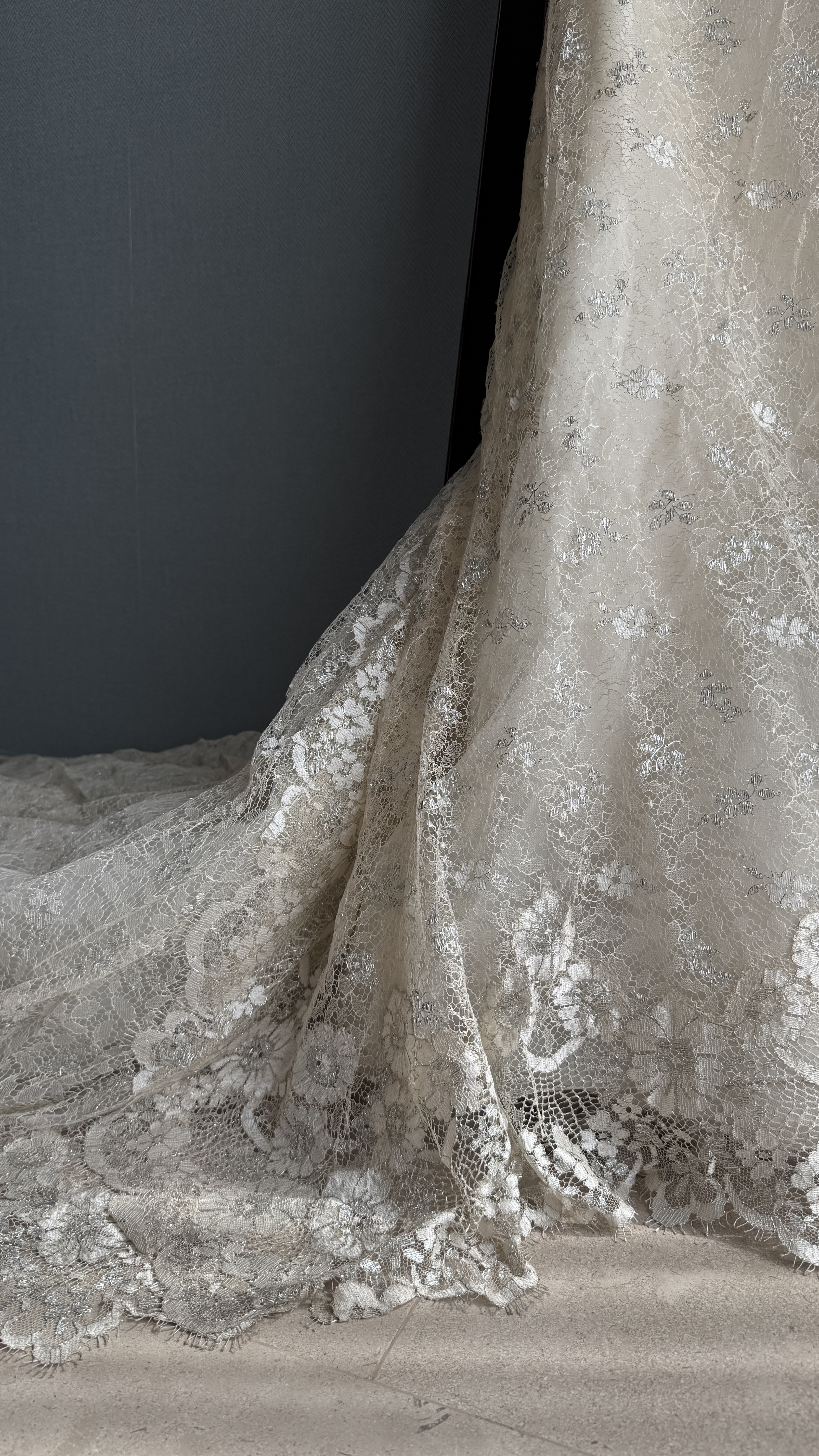 Es un diseño elegante, romántico y atemporal, perfecto para una novia que busca resaltar su silueta con distinción y un toque clásico.