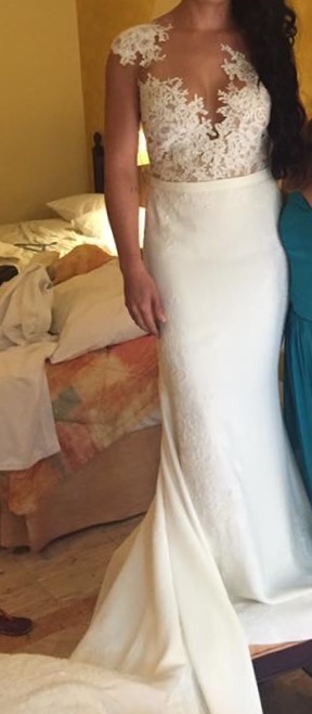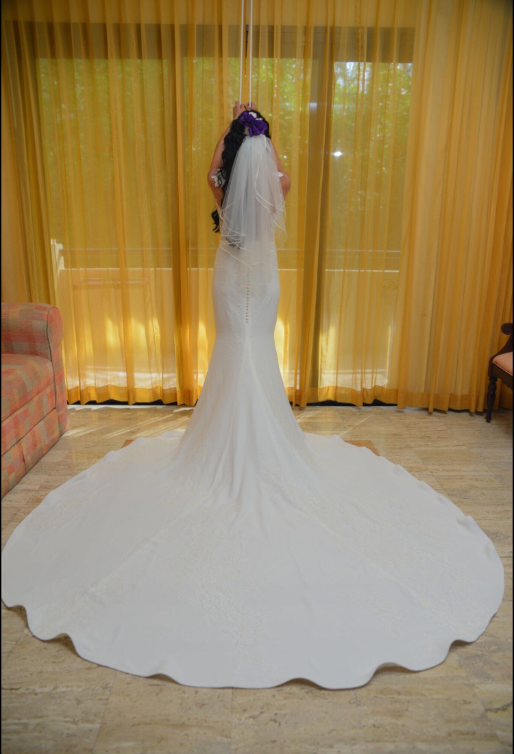 Vestido original de novia, hecho de crepe de estilo sirena , cuerpo de escote corazon decorado con aplicaciones de encaje frances rebrode en excelentes condiciones