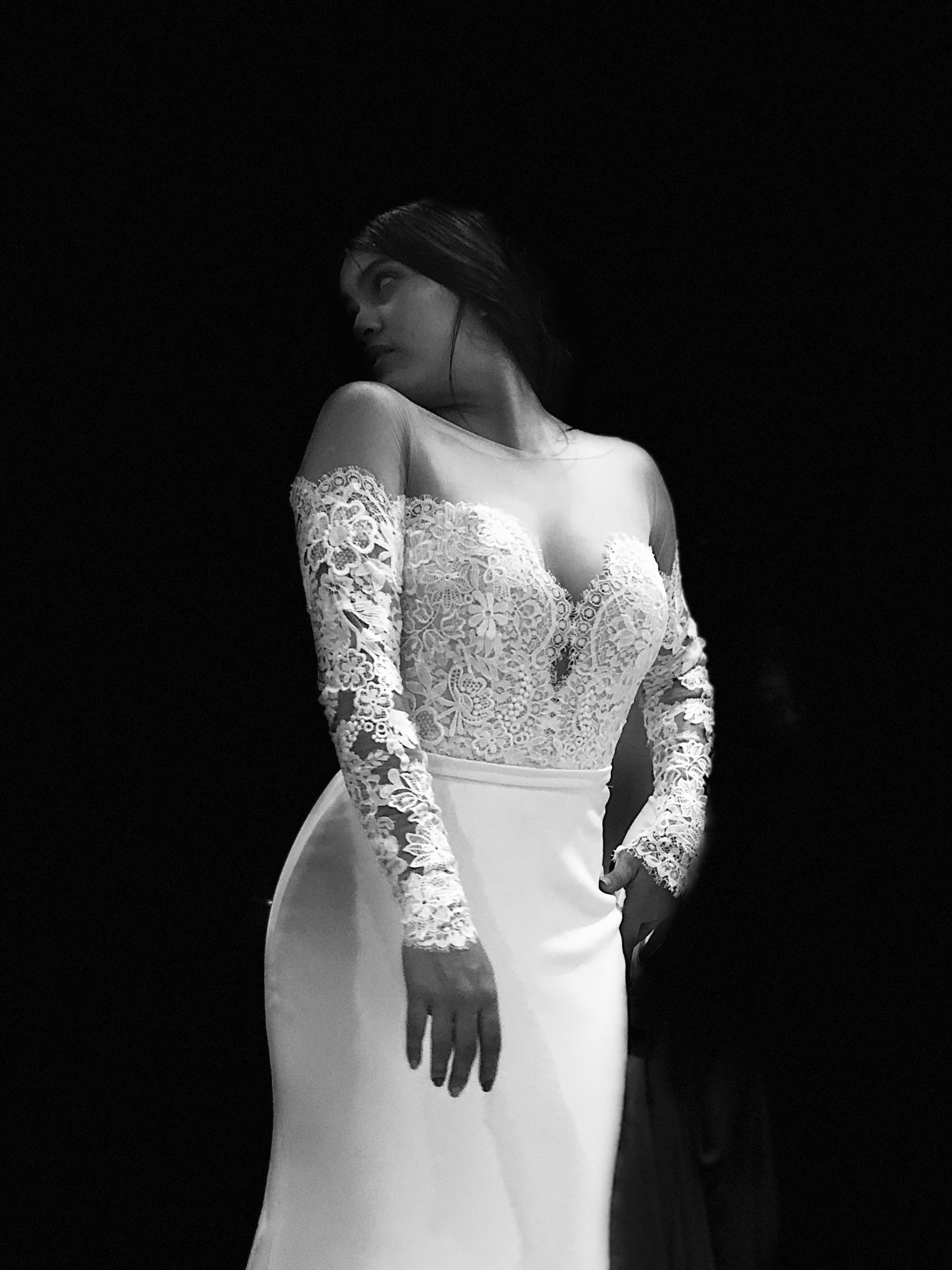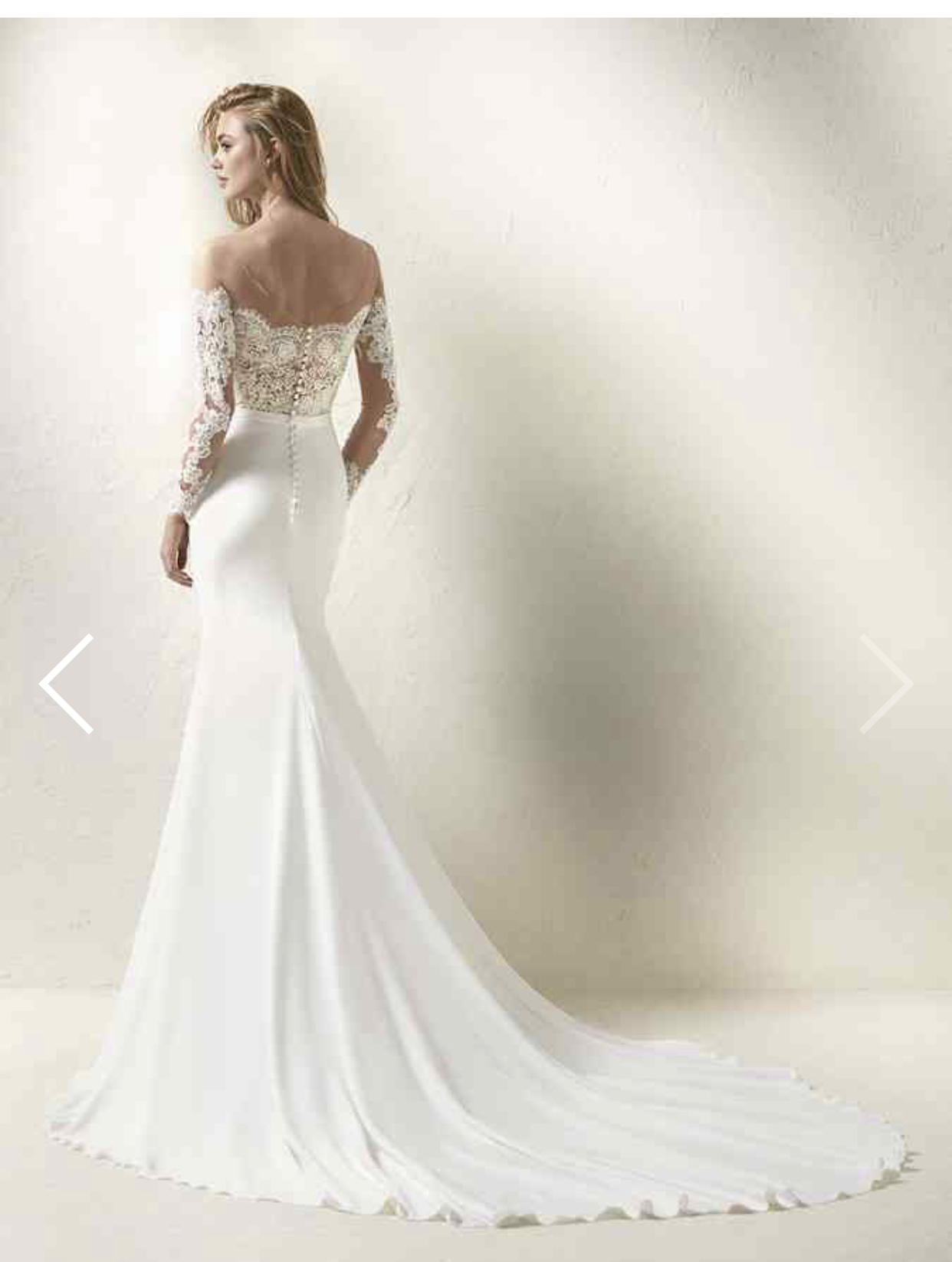 Sientes amor a primera vista cuando te encuentras con vestidos como este. Un diseño sirena de talle a la cintura realizado en crepe y tul para la falda con cola; y encaje y guipur para un sensual y sofisticado cuerpo en escote ilusión, tanto en la parte delantera como en la espalda. Un cuerpo que se funde con la piel creando un efecto tatuaje, precioso. Además, las mangas largas con el hombro descubierto acentúan más esa feminidad convirtiendo a la novia en la protagonista.