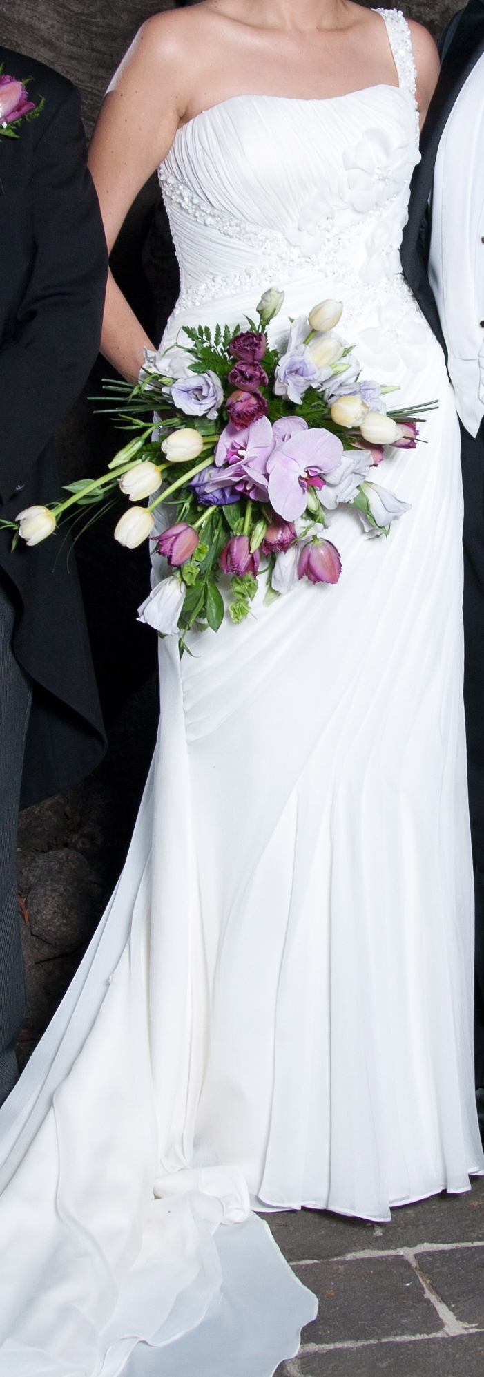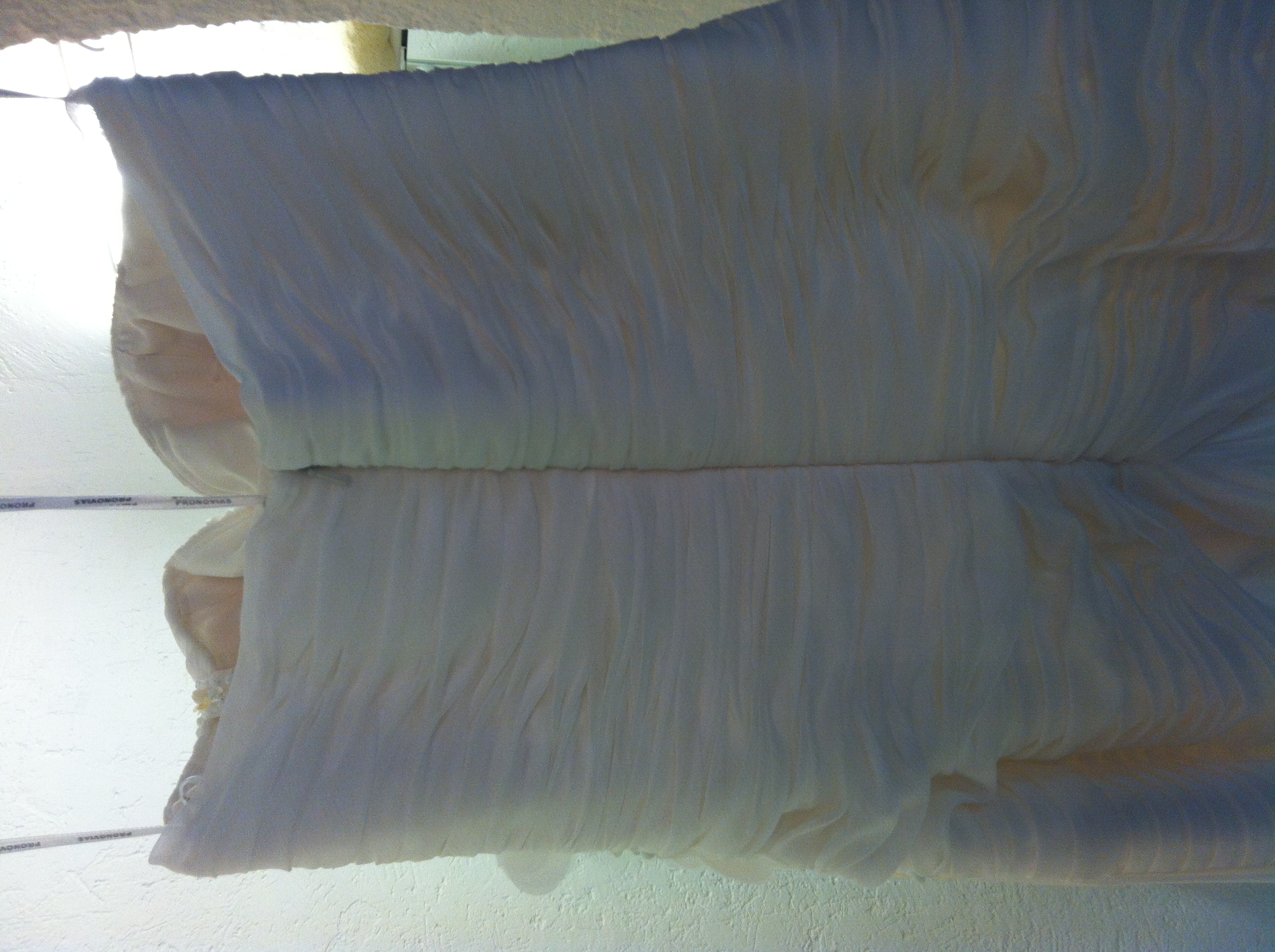 El vestido es color blanco marfil, de chiffón y gasa fina, con mucho plisado y detalles de flores al frente en gasa y mucha pedrería en blanco y blanco-dorado. Está en muy buen estado, sólo lo usé ese día y mi matrimonio ha sido feliz (eso es importante). Incluyo velo largo simple de Pronovias y un fondo ligero con crinolina mandado a hacer para darle un poco más de volumen a la falda. El vestido es talla 42 de Pronovias (10 en México) ajustado a mi talla 6-8 y a mi altura (1.66 cm) con tacones medios, 1.70 m. Está lavado en tintorería y en su funda original.