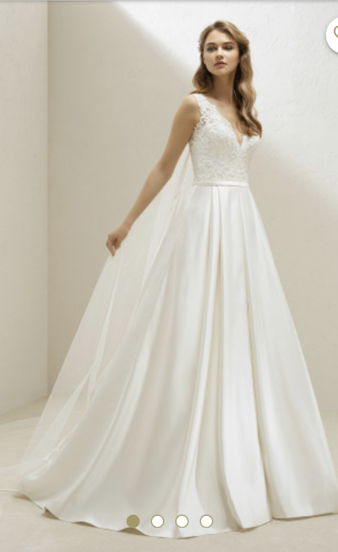 “La tendencia más actual se funde con las líneas más clásicas y los tejidos más radiantes para crear este maravilloso vestido Princesa…” (Descripción Pronovias 2019)