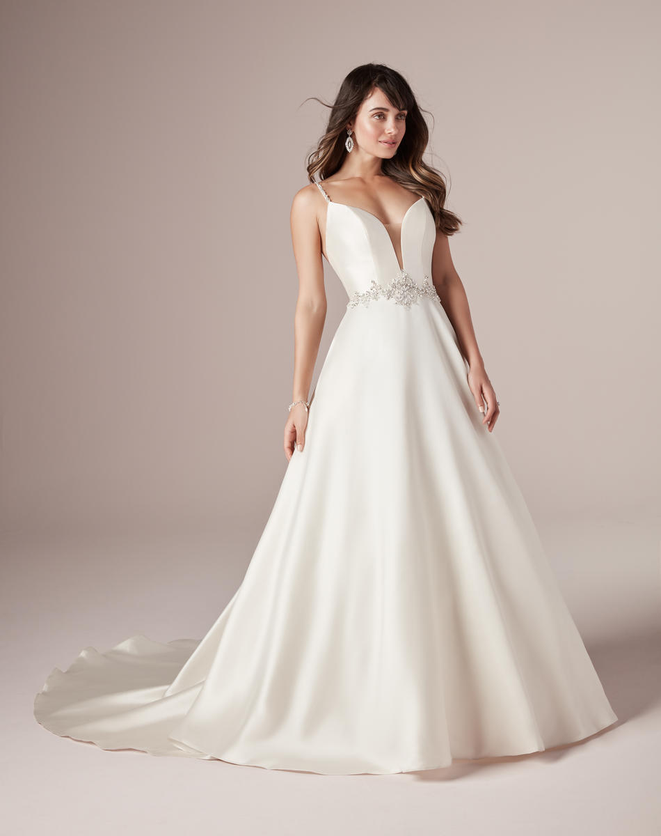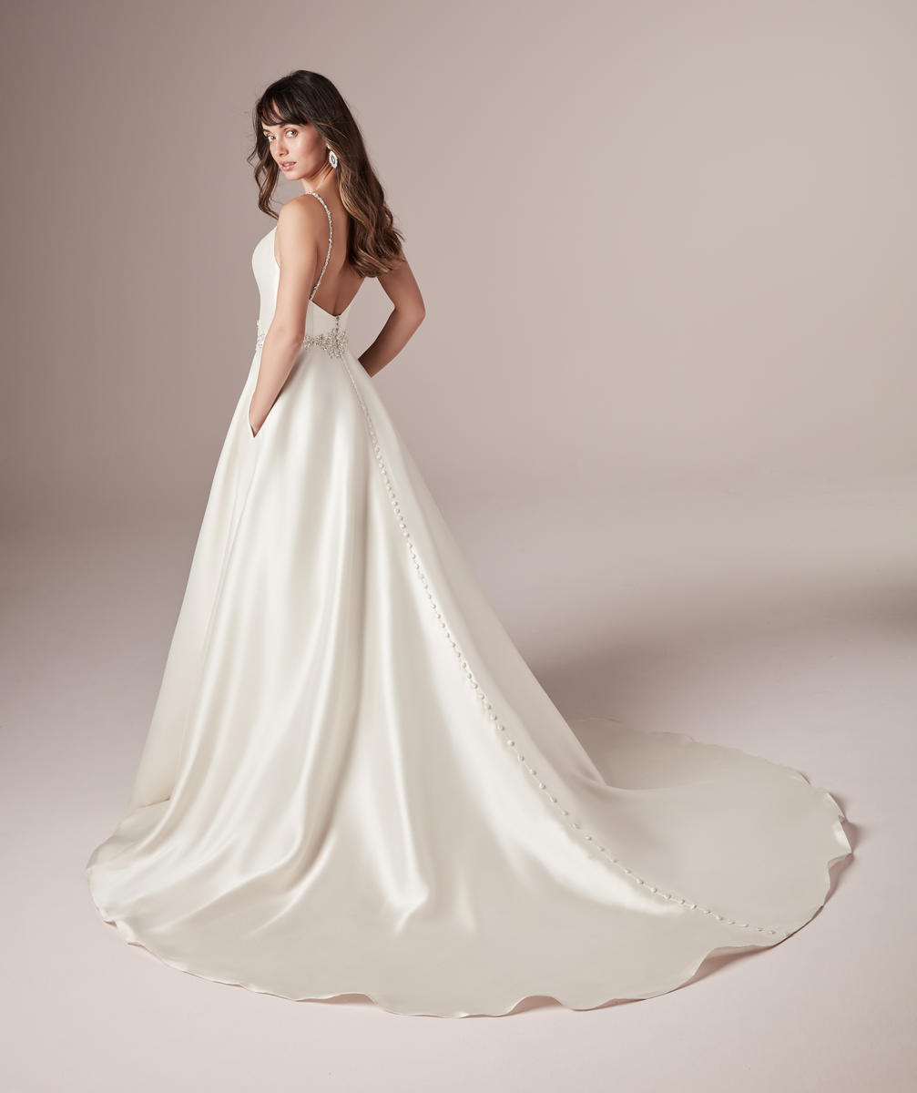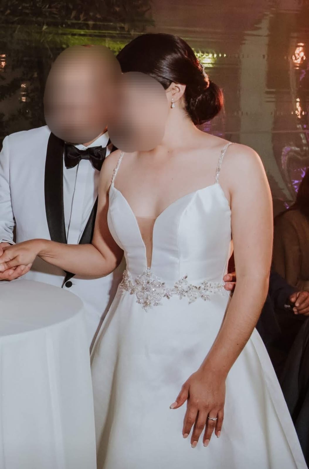 Es un vestido de novia muy sencillo pero a la vez elegante, cuerpo con cinturón de pedrería incorporado, espalda en V, escote en V ilusión pronunciado, tirantes finos con pedrería, cremallera con elástico interior y cierre de botón forrado, botones forrados hasta el dobladillo, bolsillos discretos que son muy prácticos en ese día tan especial .