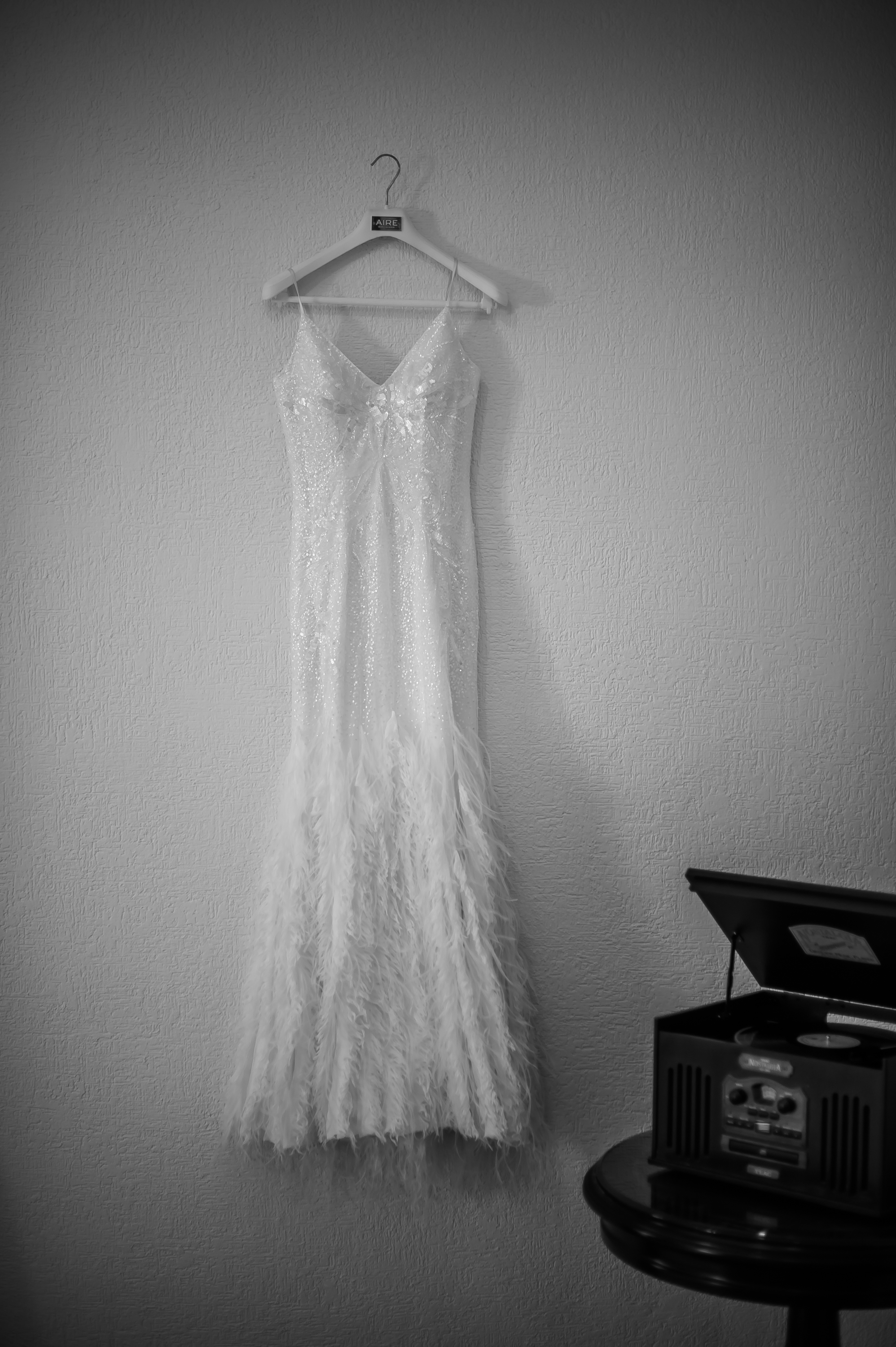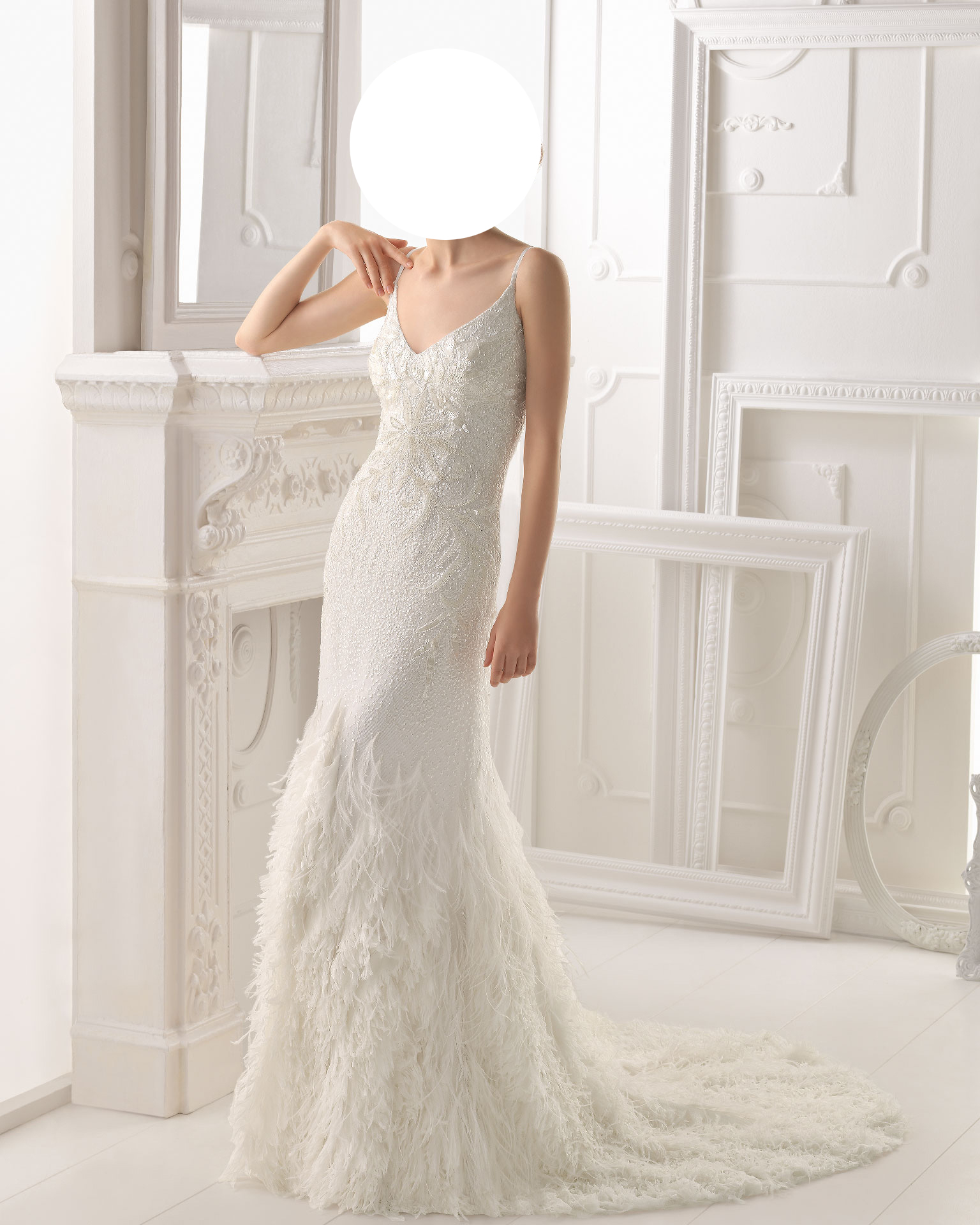 Hermoso vestido de la diseñadora española Rosa Clará, con cuerpo totalmente bordado de pedrería y rematado con plumas, se adapta al cuerpo de la novia con una caída tipo sirena pero más holgada, como de enagua. En color blanco. Lo usé una sola vez, el día de mi boda. Es un modelo del año pasado, 2014.