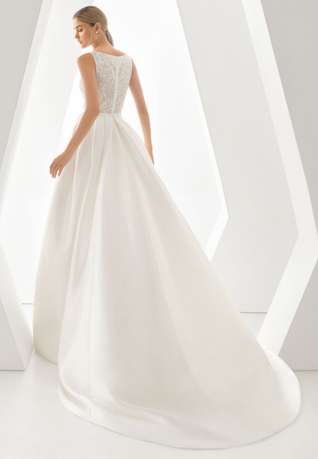 El encaje joya de este vestido es el protagonista en este espectacular vestido de novia de estilo clásico realizado en tamís. La gran cola que nace en la espalda le da un toque de princesa de cuento.