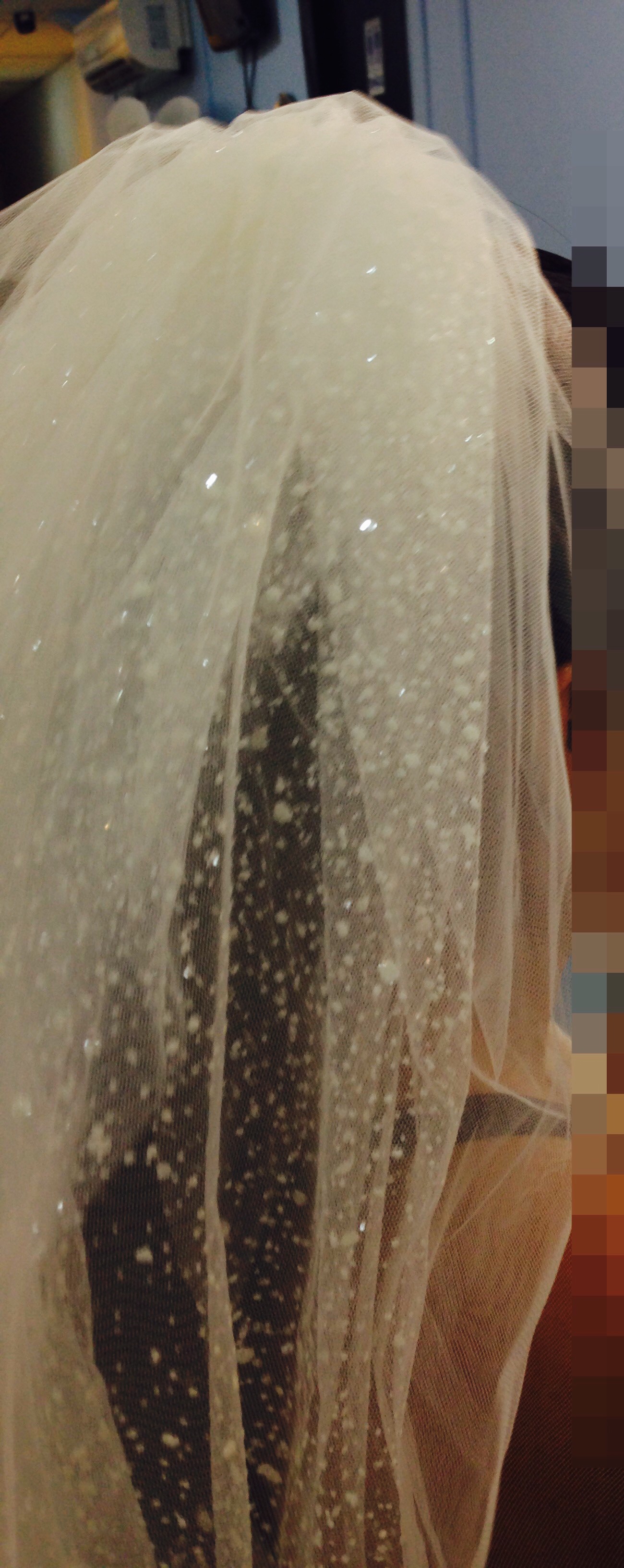 Todo el vestido tiene destellos que brillan, incluye un velo corto con las mismas características. Como pueden observar en las fotos lucen increíbles sin llegar al exceso