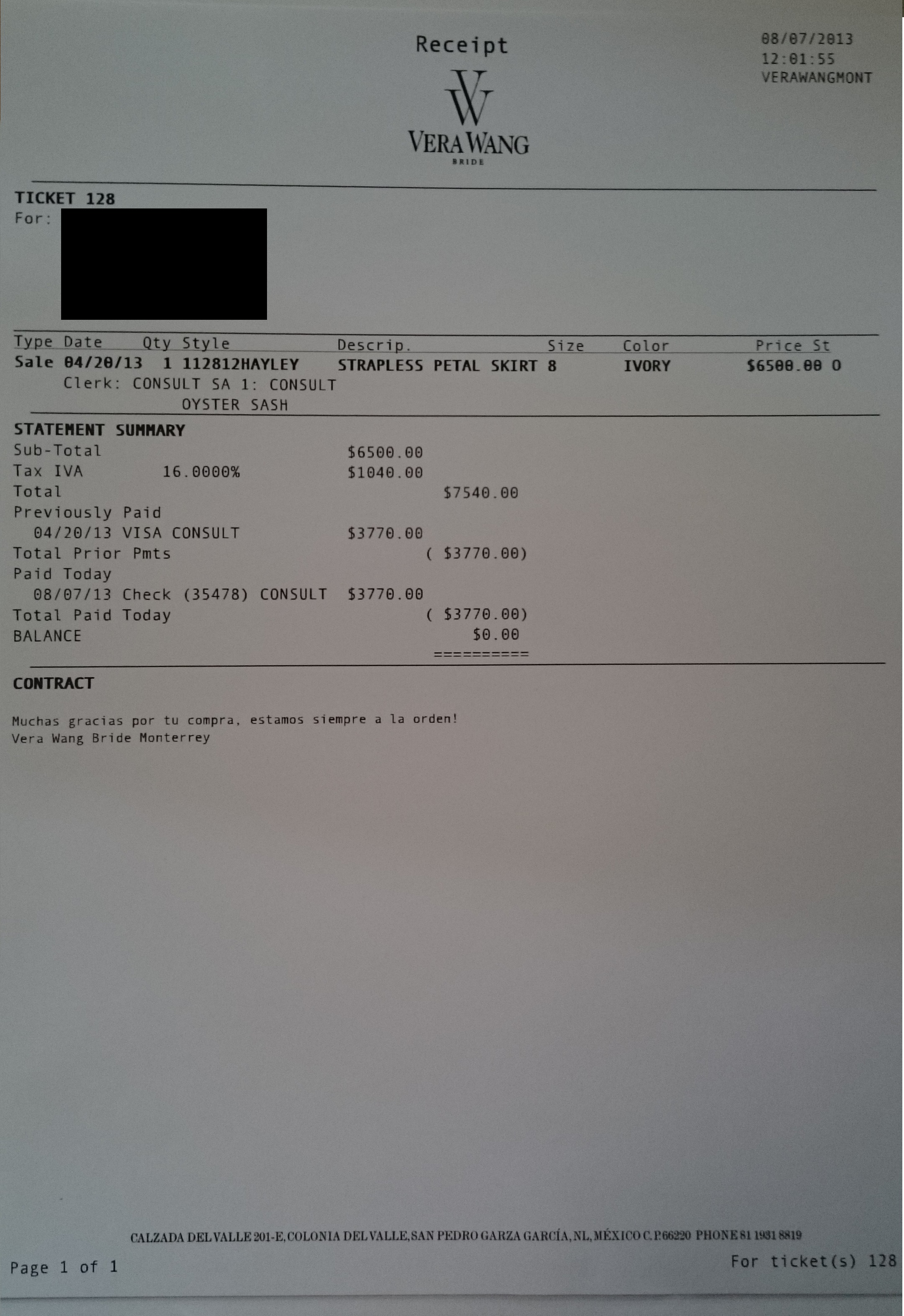 Precio original del vestido US$7540. (Tipo de cambio dolar 15, precio del vestido MXN$113100)