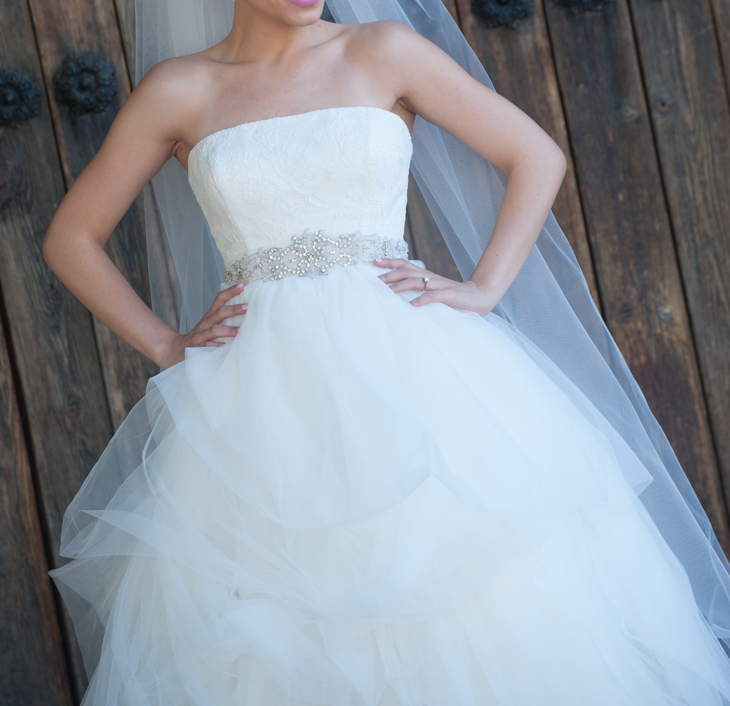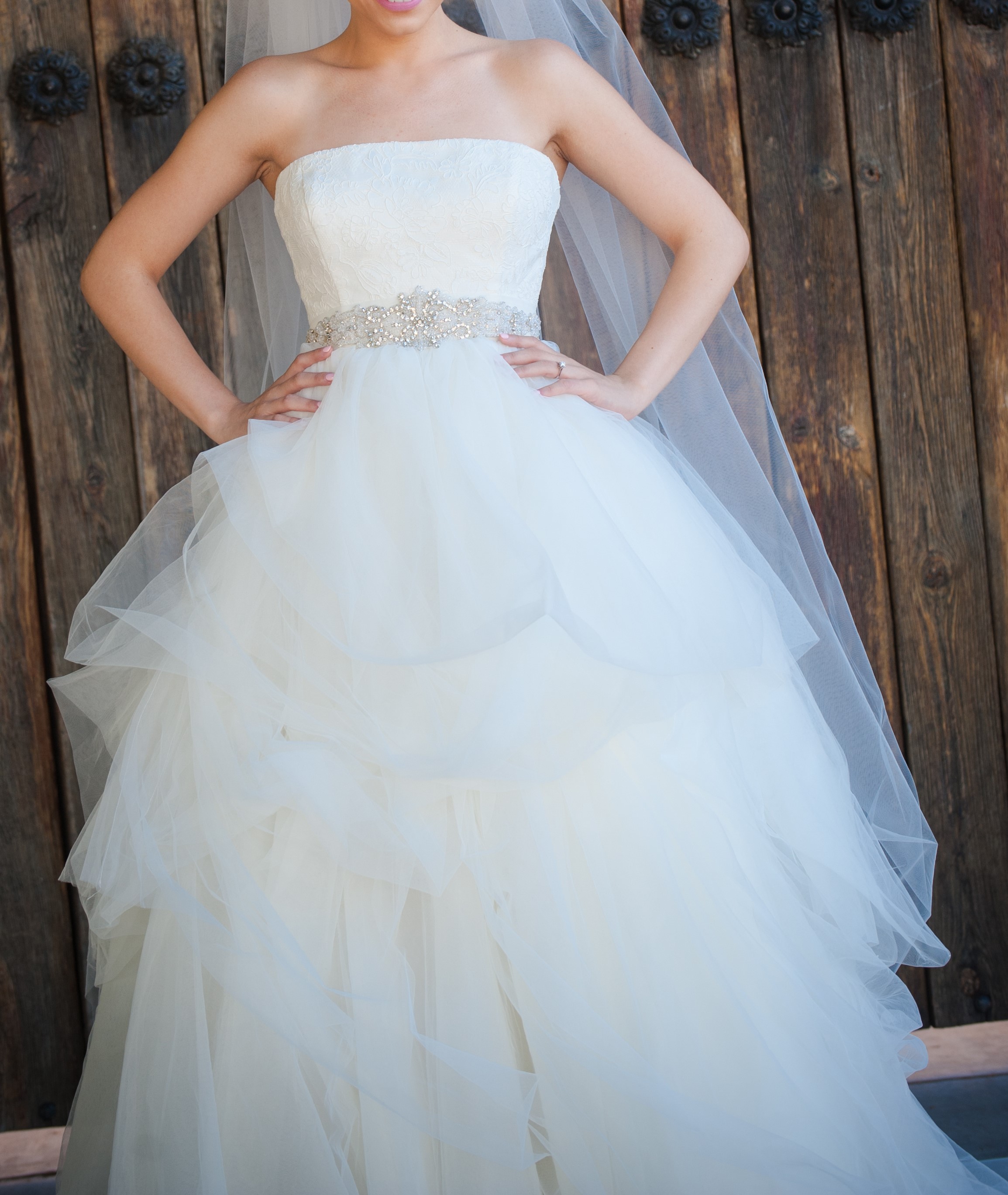 Vestido White by Vera Wang tipo princesa semi nuevo, en excelentes condiciones. Incluye cinto de pedrería y velo largo de tul.