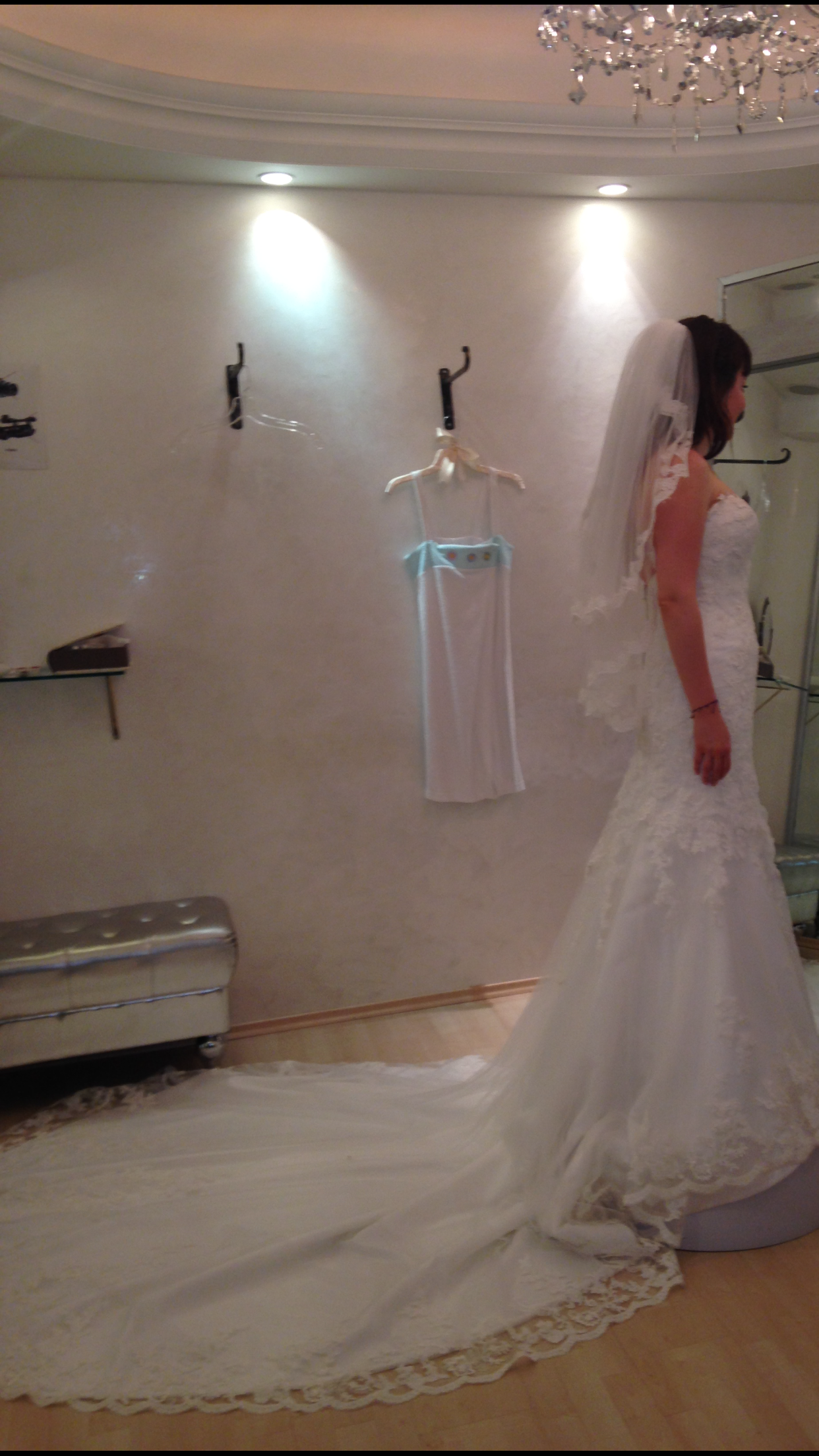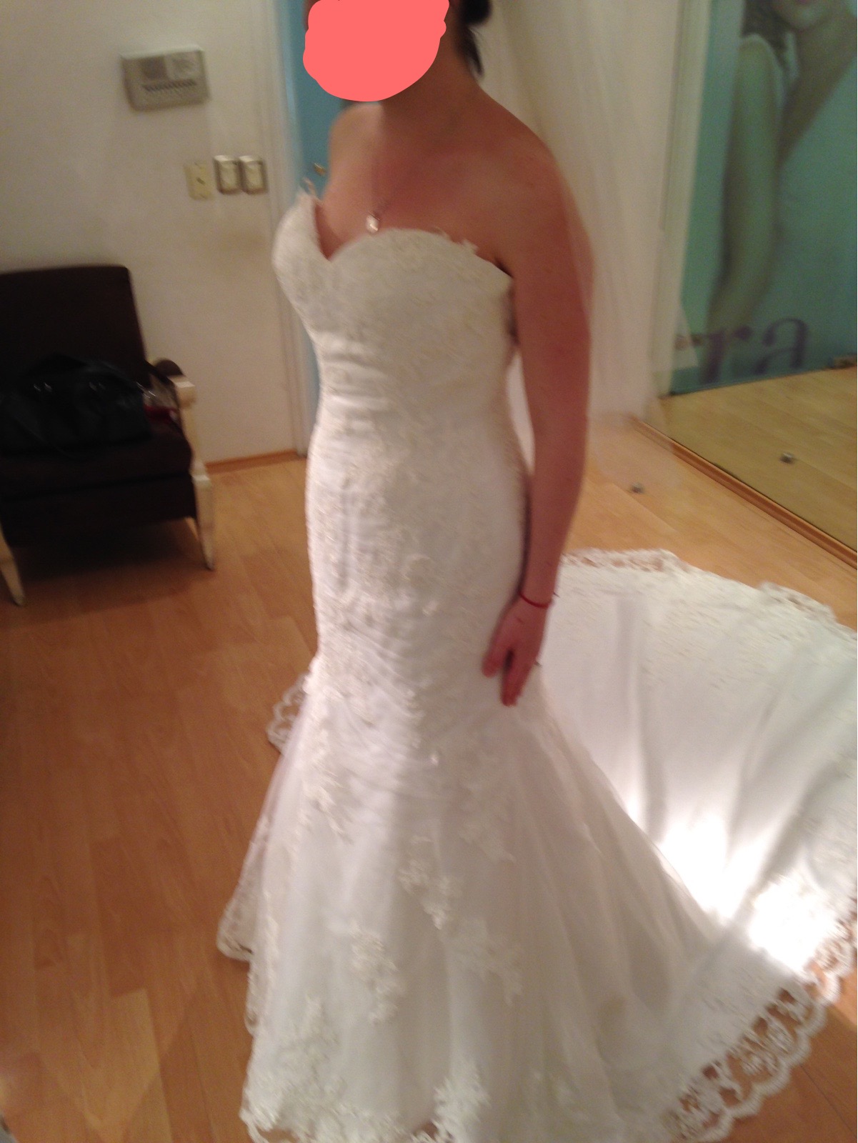 Corte sirena, con encaje y cola larga. Increible para boda de día o de noche, muy cómodo y te hace ver una figura muy bonita.