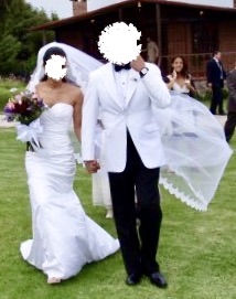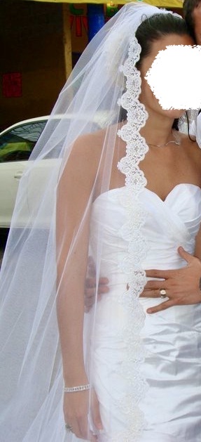 El vestido es drapeado de todo el frente hasta la cintura, tiene varillas para acinturar más, el escote trasero es en V a media espalda y se amarra como corset hasta la cadera, la cola del vestido es como de 1 metro, está un poco manchada en la orilla que que llovió el día de la boda y se manchó con el lodo, sin embargo al ser la cola lo que se manchó se puede hacer un poco más corta, la tela es hermosa, el vestido lo diseñé yo misma y hecho a mi medida. Mido 1.68m de estatura para tener referencia del largo. El velo es muy fino y el encaje es exquisito, el velo es de 3 metros de largo.